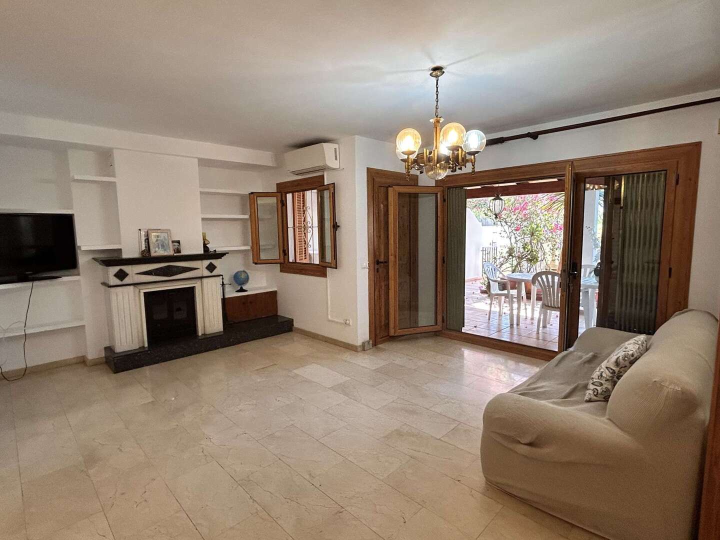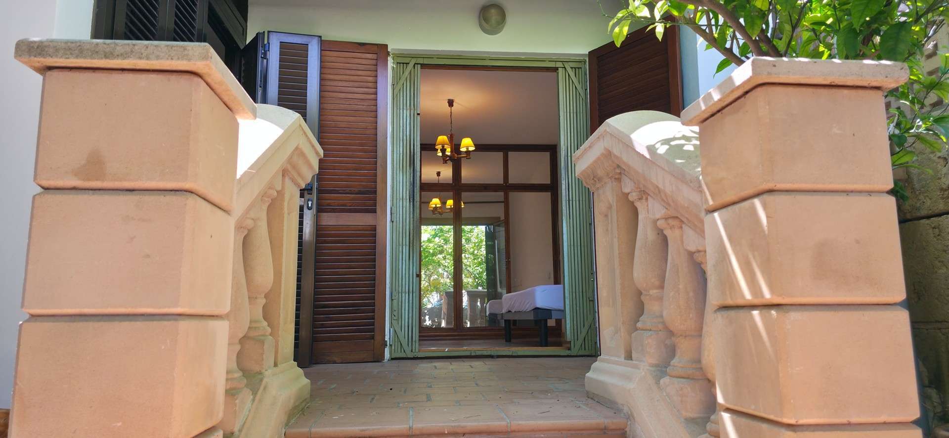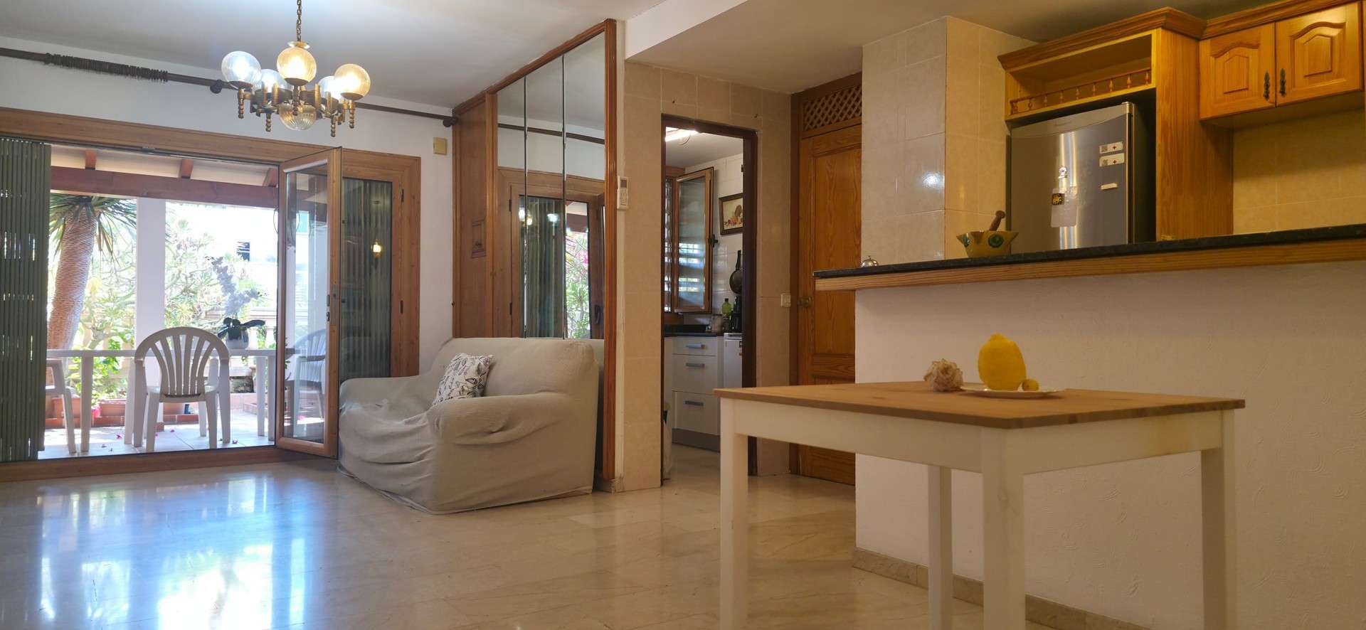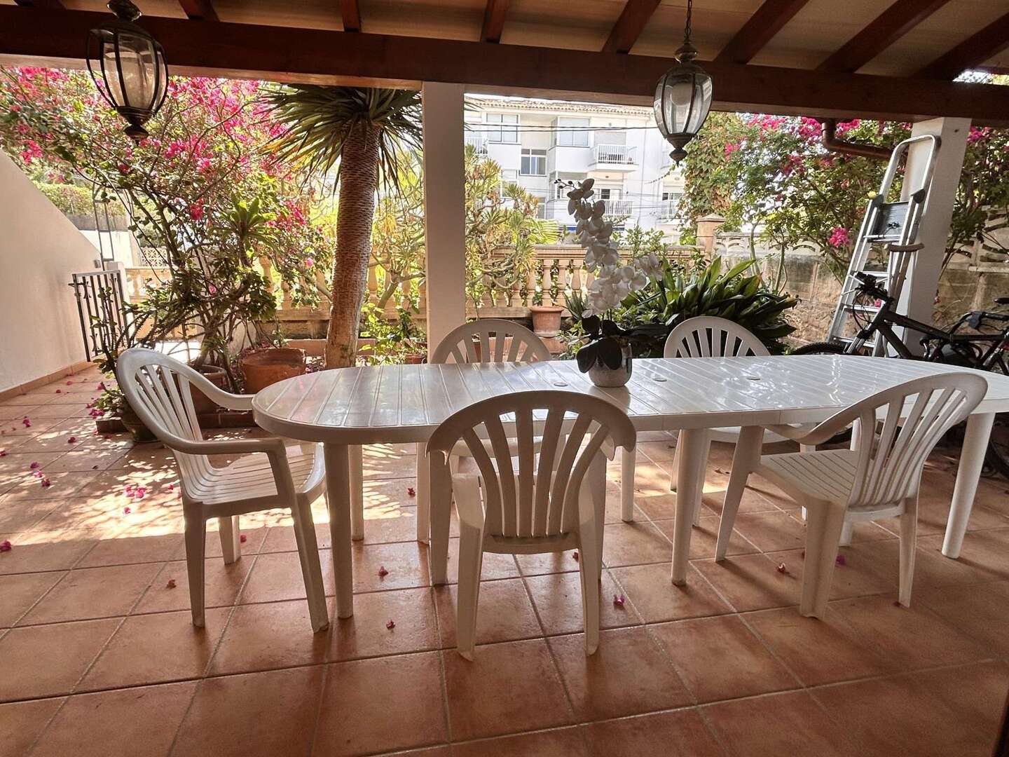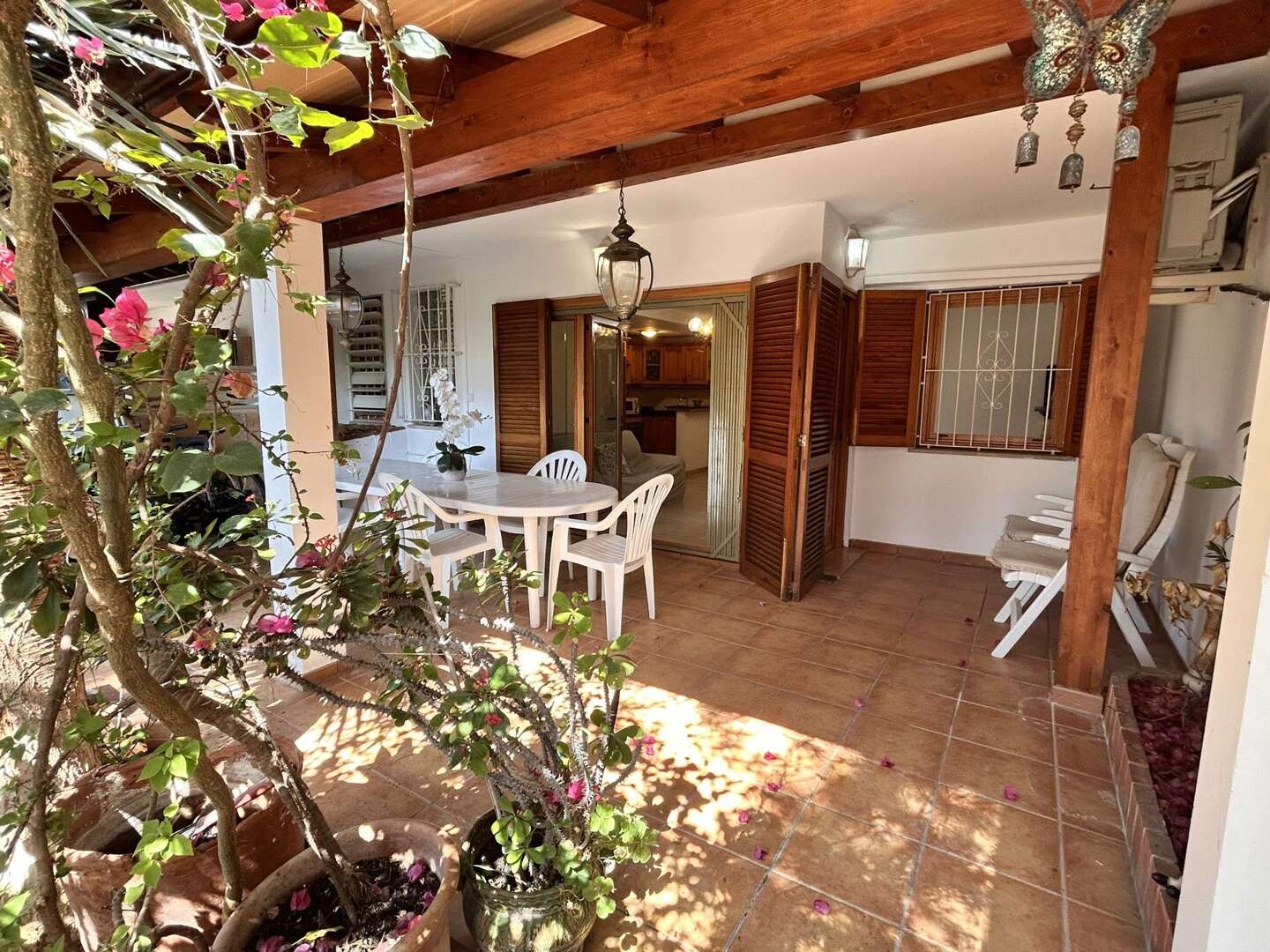 Der private Außenbereich verfügt über zwei Terrassen und bietet nicht nur eine überdachte Terrasse, sondern auch einen kleinen, begrünten Gartenhof mit Zitronenbäumen, mediterranen Pflanzen und viel Privatsphäre.