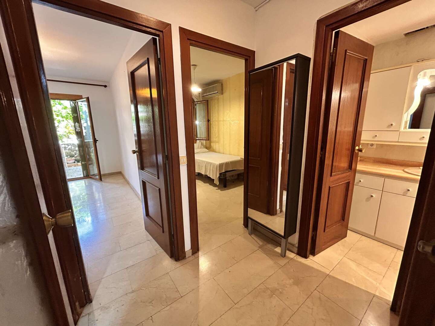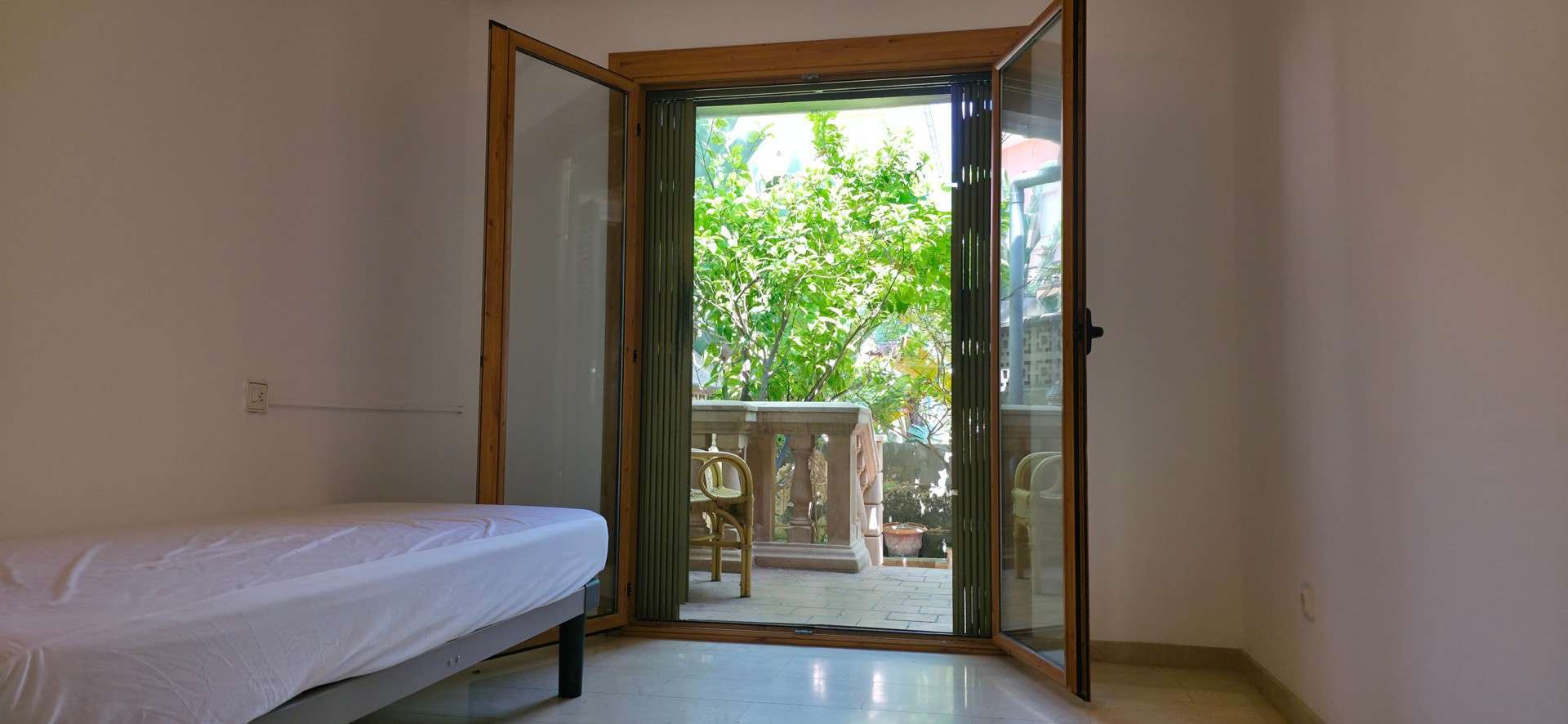 Insgesamt verfügt die Wohnung über zwei Schlafzimmer, teils mit Einbauschränken und direktem Zugang zum zweiten Außenbereich.