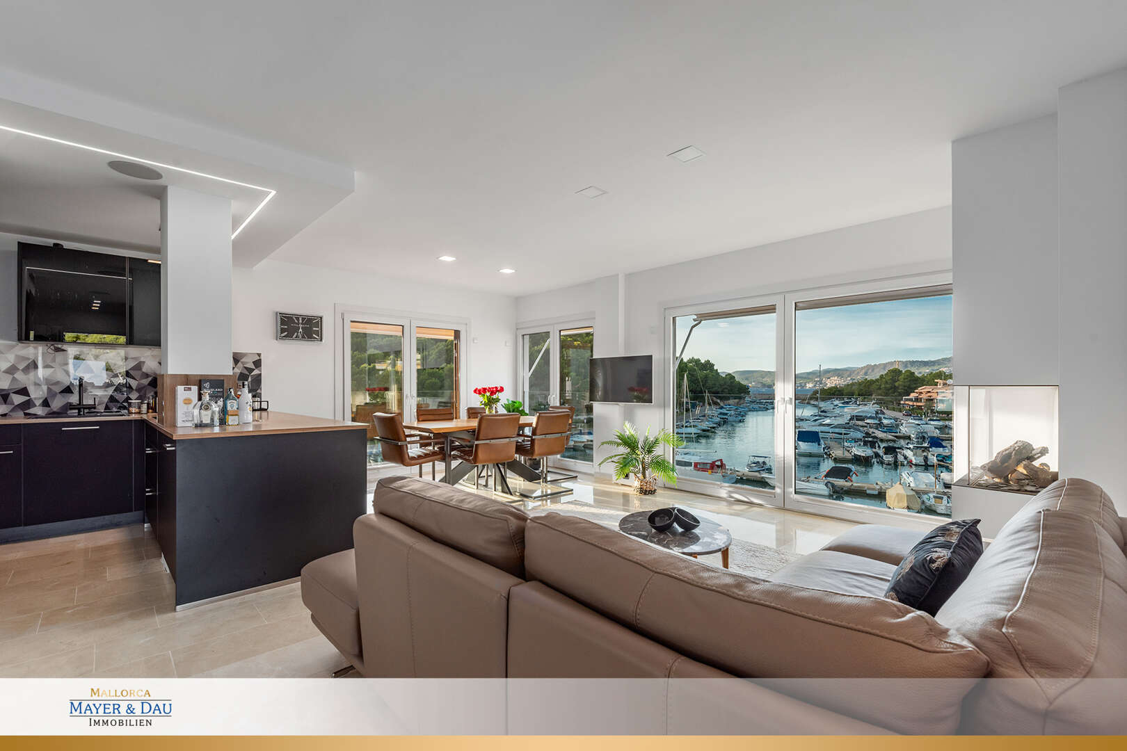 Schon beim Betreten der lichtdurchfluteten Räume wird klar: Hier wurde nichts dem Zufall überlassen. Edler Parkettboden, hochwertige Materialien und ein elegantes, zeitloses Design schaffen ein Ambiente, das modernen Wohnkomfort mit mediterranem Flair verbindet. Der offene Wohn- und Essbereich mit direktem Zugang zur großzügigen Terrasse lädt dazu ein, die spektakulären Sonnenuntergänge über dem Hafen in vollen Zügen zu genießen – jeden Abend ein neues Highlight.