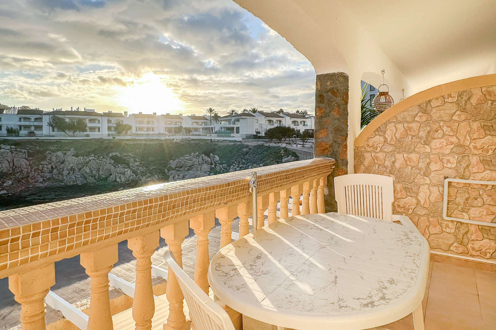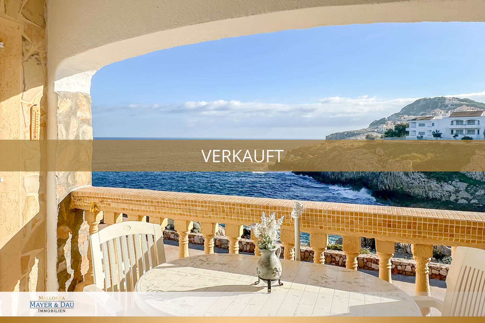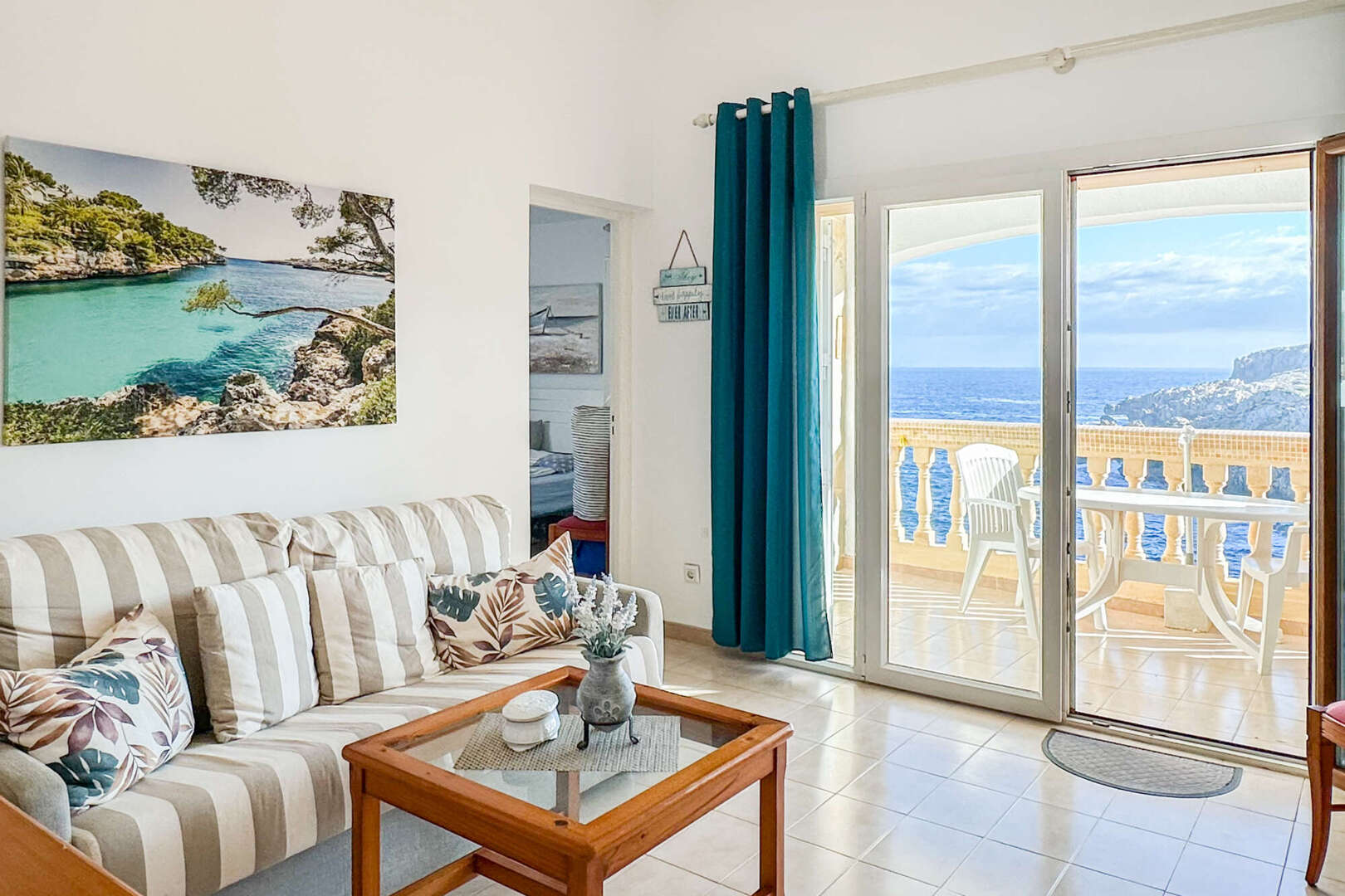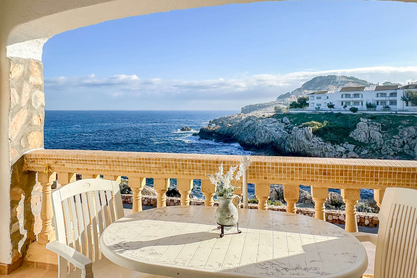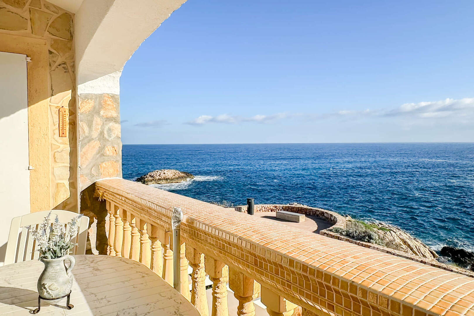 Eine kleine Küche mit Durchreiche rundet das Raumangebot noch einmal schön ab. Das Wohnzimmer hat Zugang zu der gemütlichen überdachten Veranda mit spektakulärem Meerblick. Bei gutem Wetter schaut man bis nach Menorca.