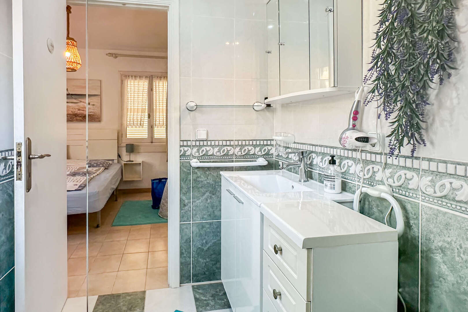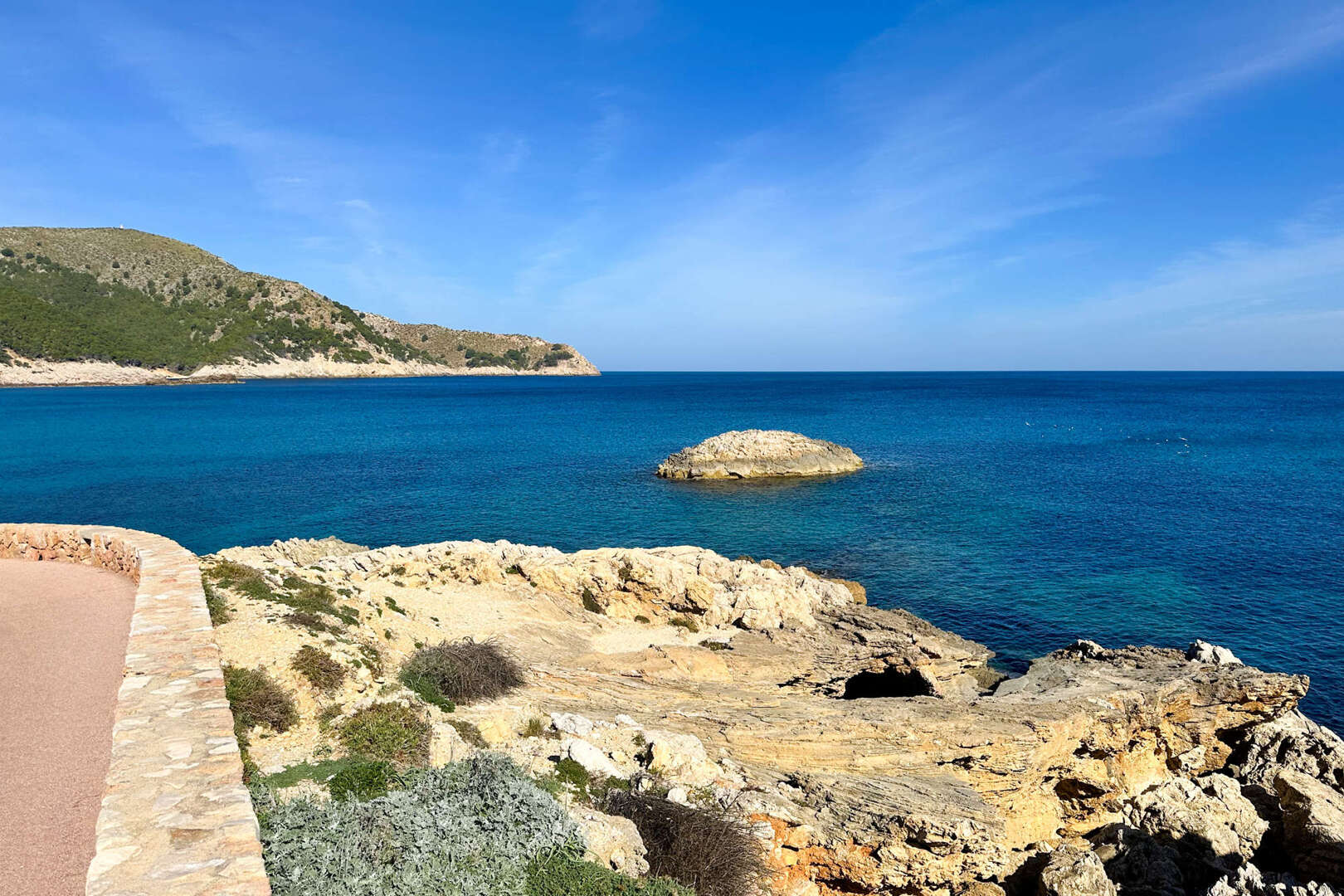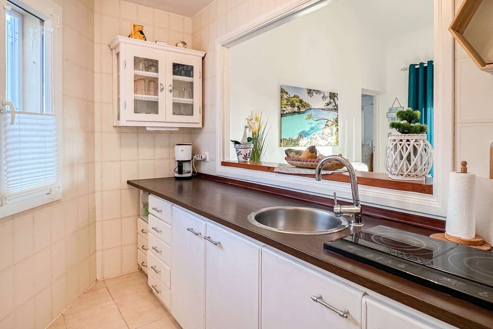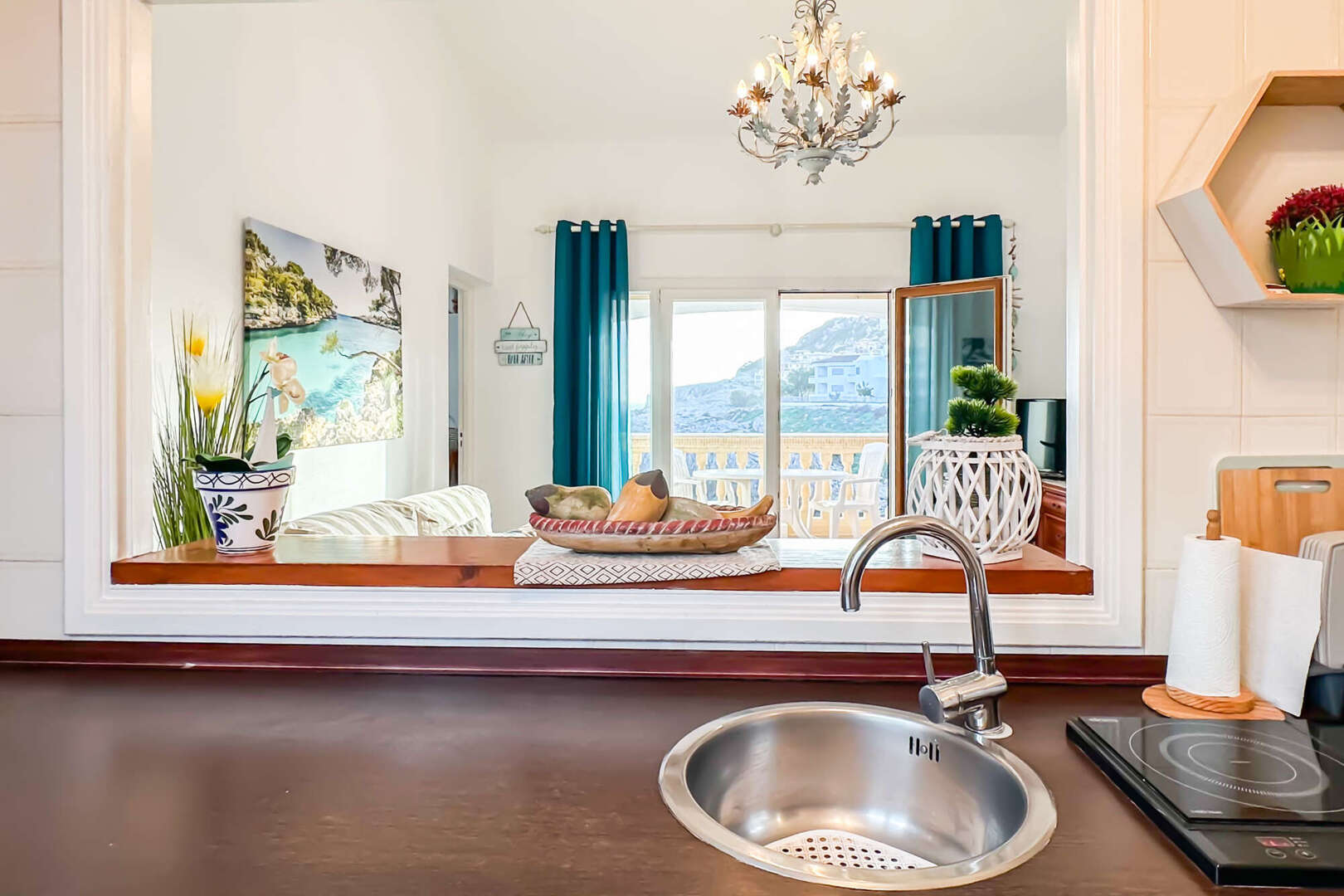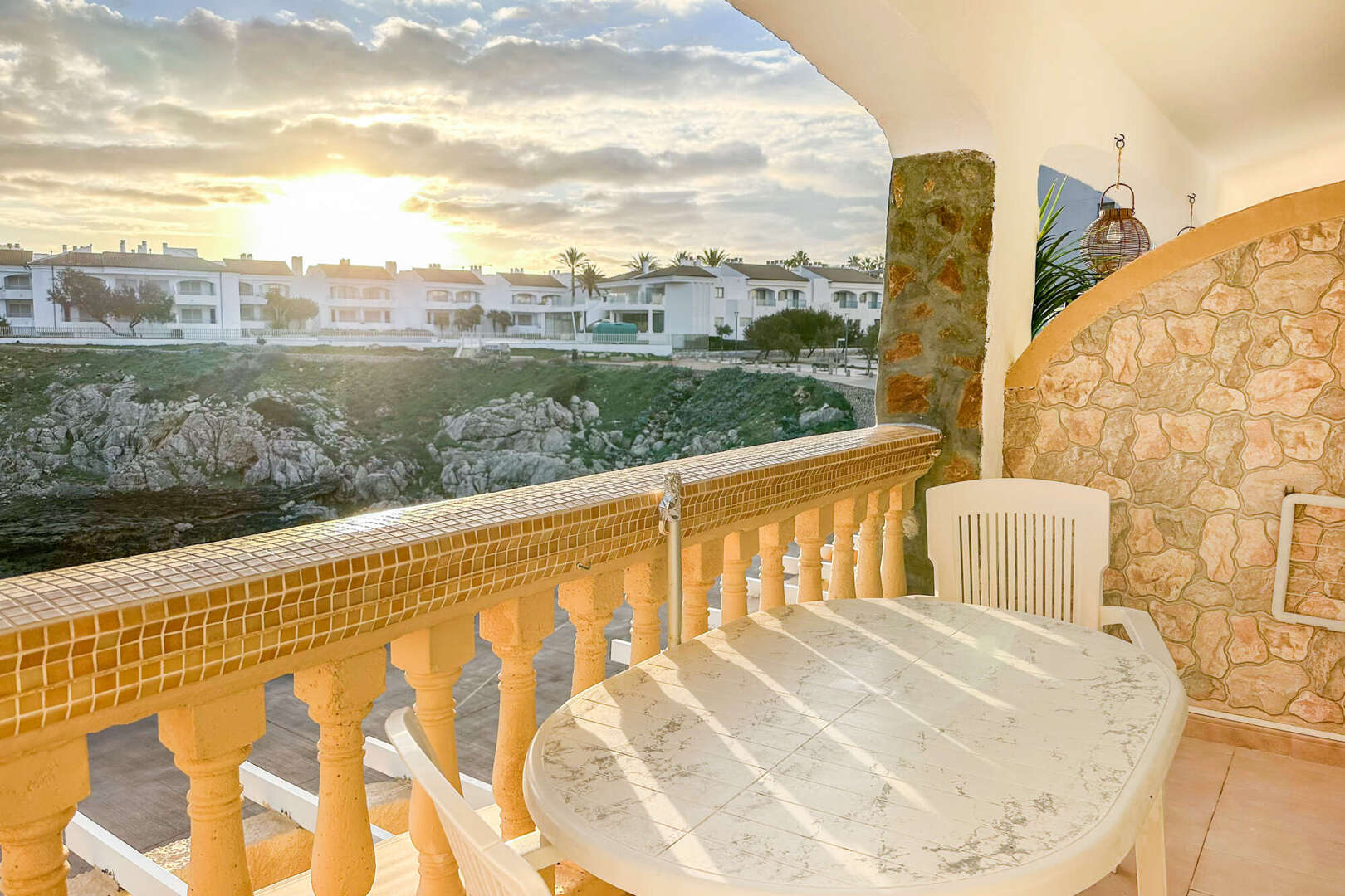 Eine kleine Küche mit Durchreiche rundet das Raumangebot noch einmal schön ab. Das Wohnzimmer hat Zugang zu der gemütlichen überdachten Veranda mit spektakulärem Meerblick. Bei gutem Wetter schaut man bis nach Menorca.