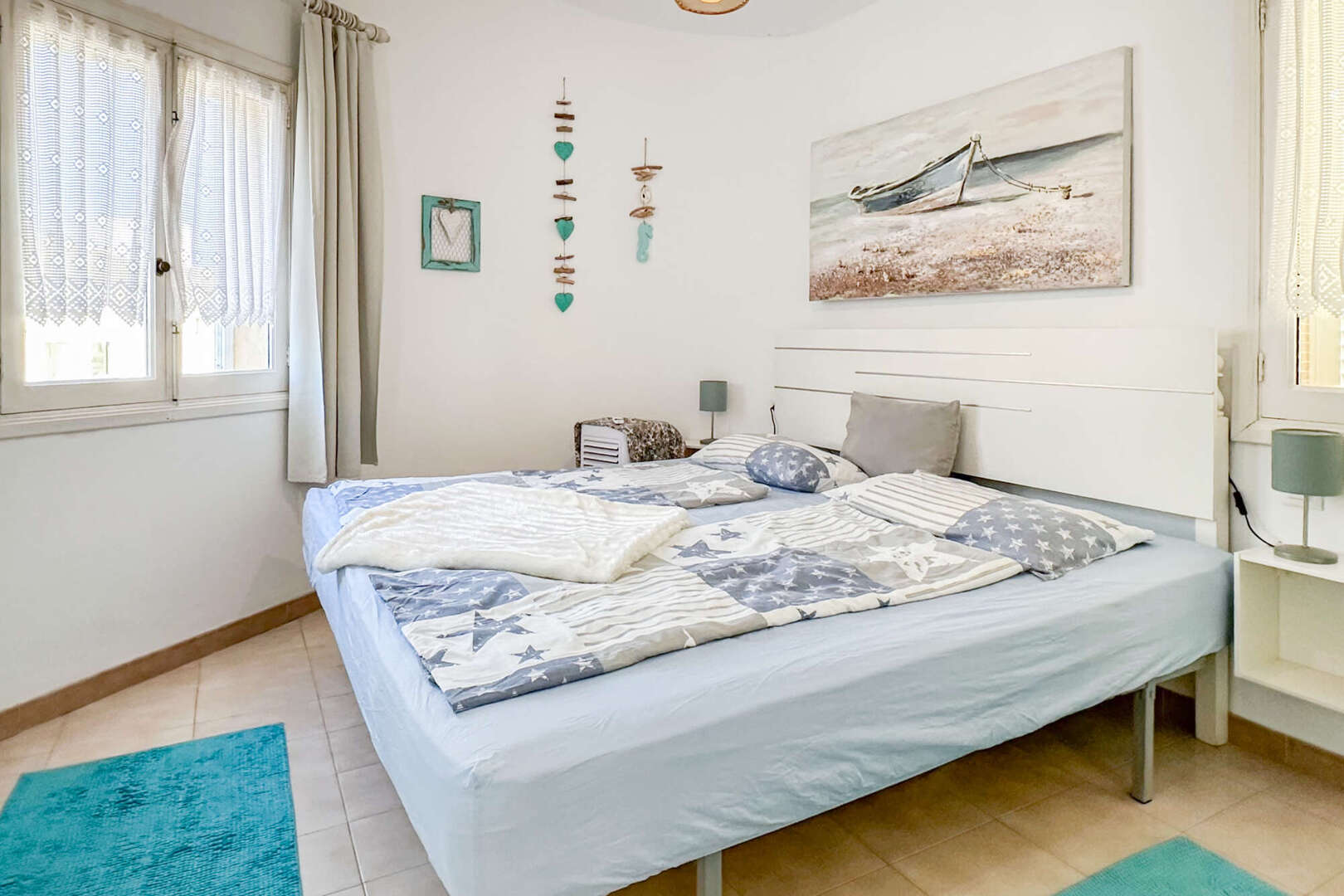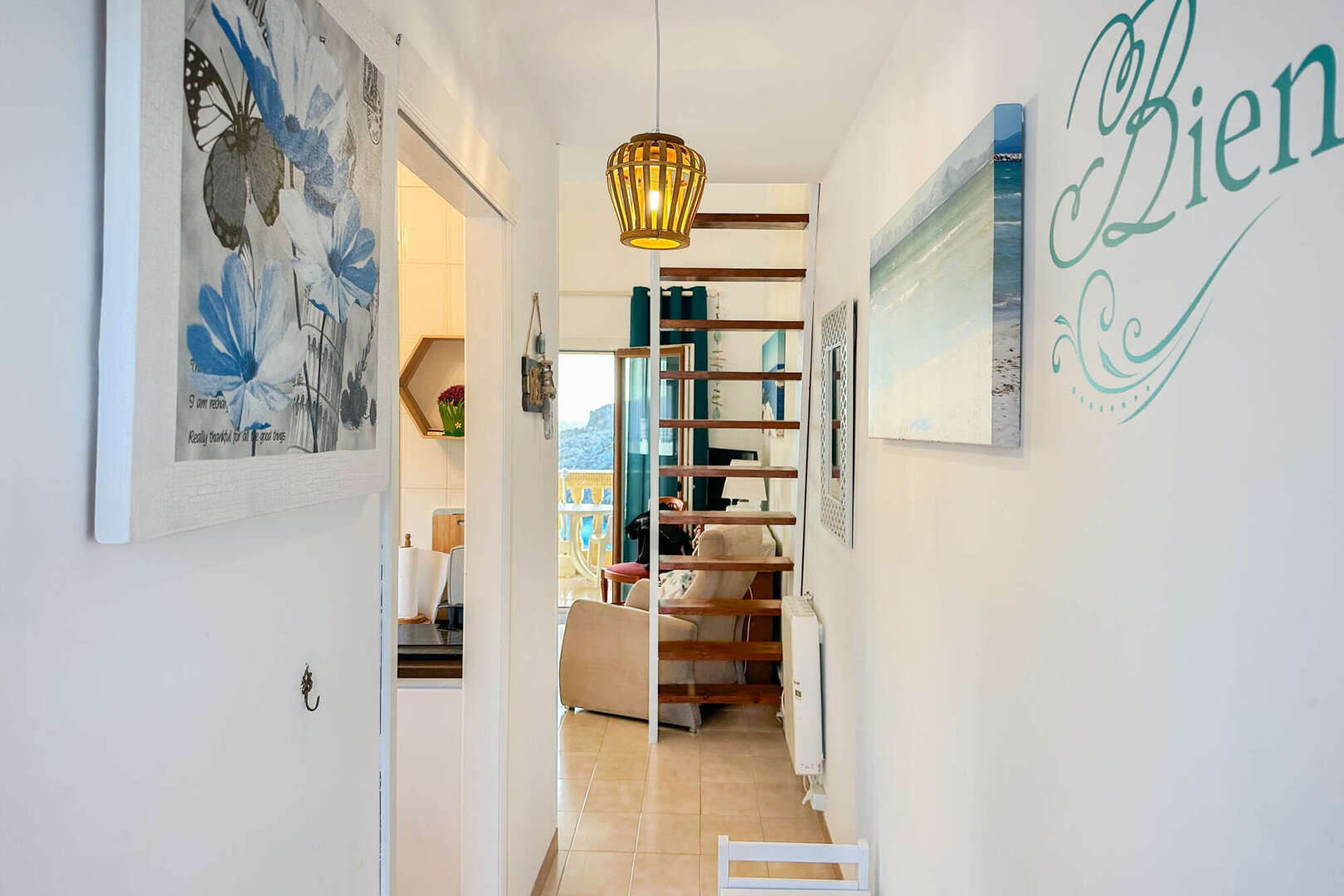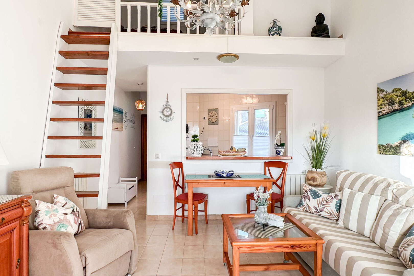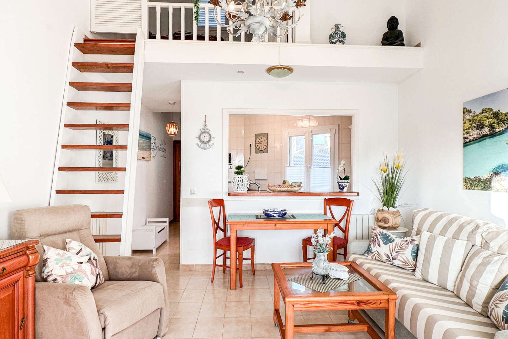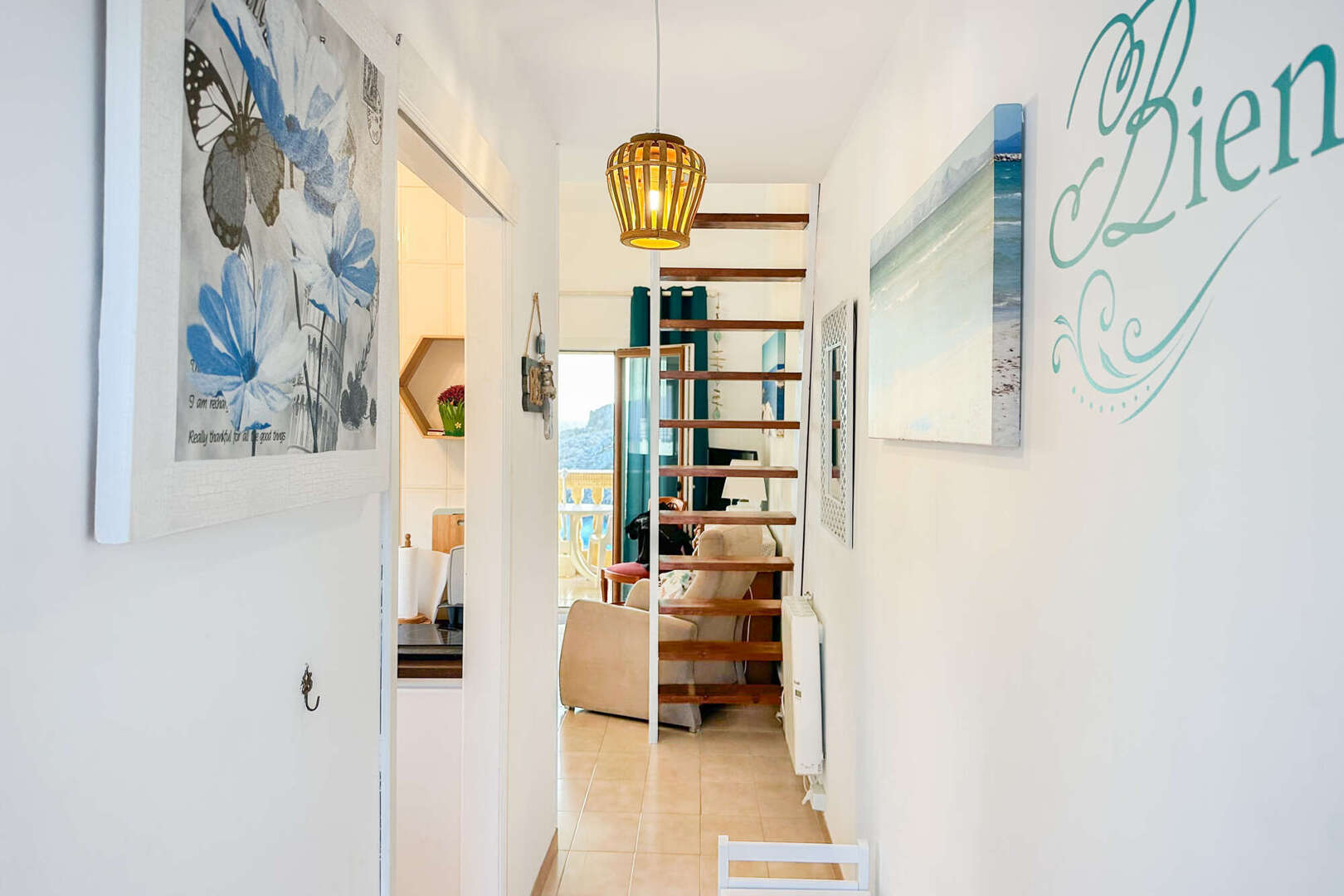 Das liebevoll gestaltete Apartment befindet sich auf der ersten Etage und ist von der Poolterrasse der Anlage aus über eine Treppe erreichbar. Es verfügt über ein Schlafzimmer mit großem Einbauschrank, ein Badezimmer mit begehbarer Dusche und ein Wohn- und Esszimmer, von dem aus man über eine Holzleiter einen weiteren möglichen Schlafbereich erreicht. In diesem Alkoven versteckt sich auch noch ein zusätzlicher Stauraum, der die großzügige Deckenhöhe perfekt nutzt.