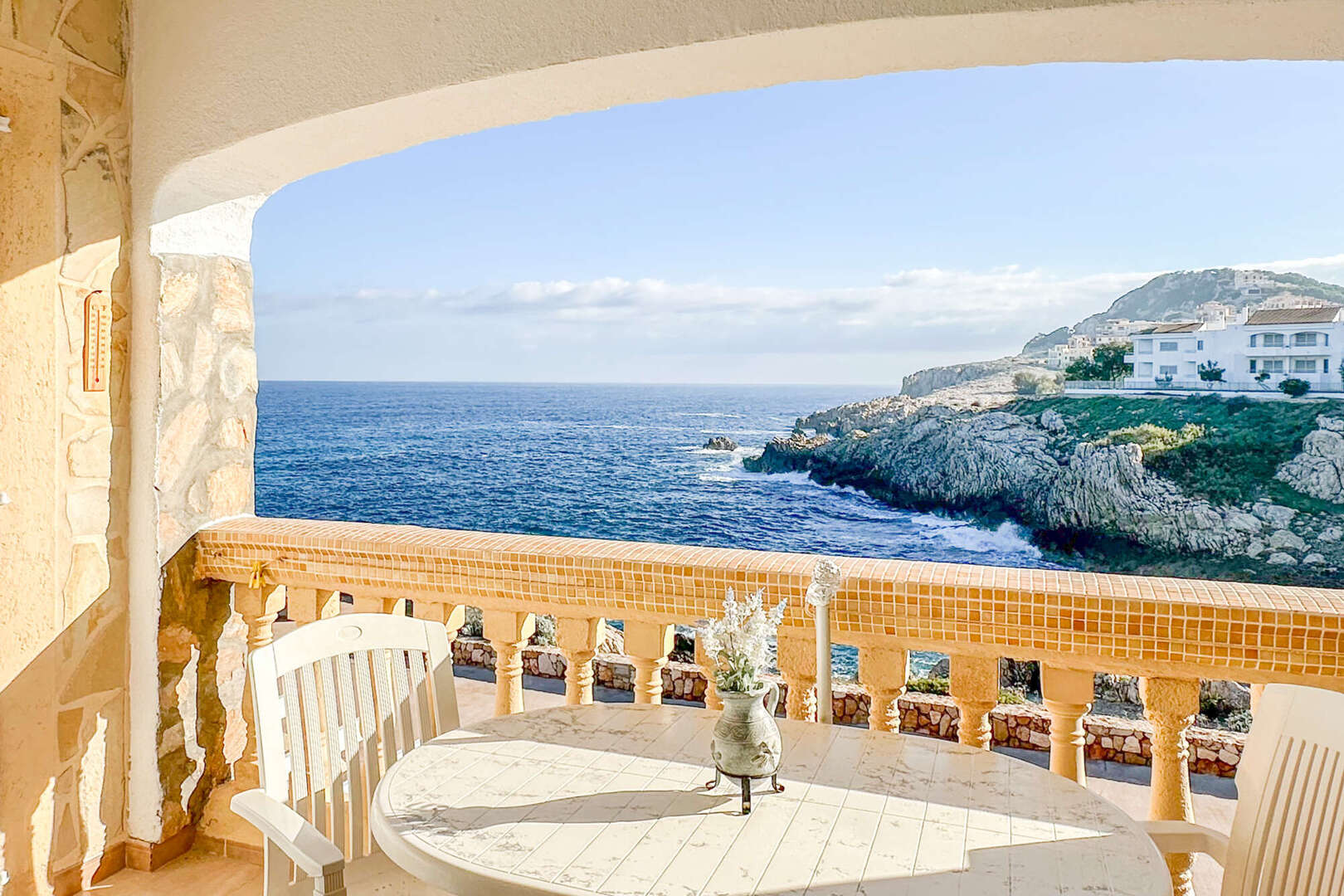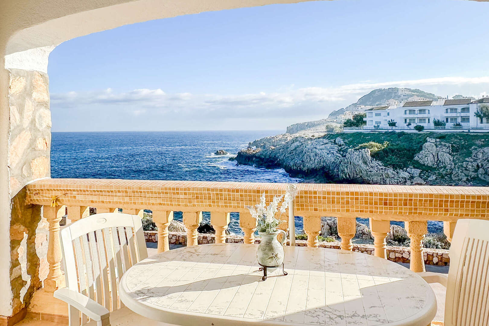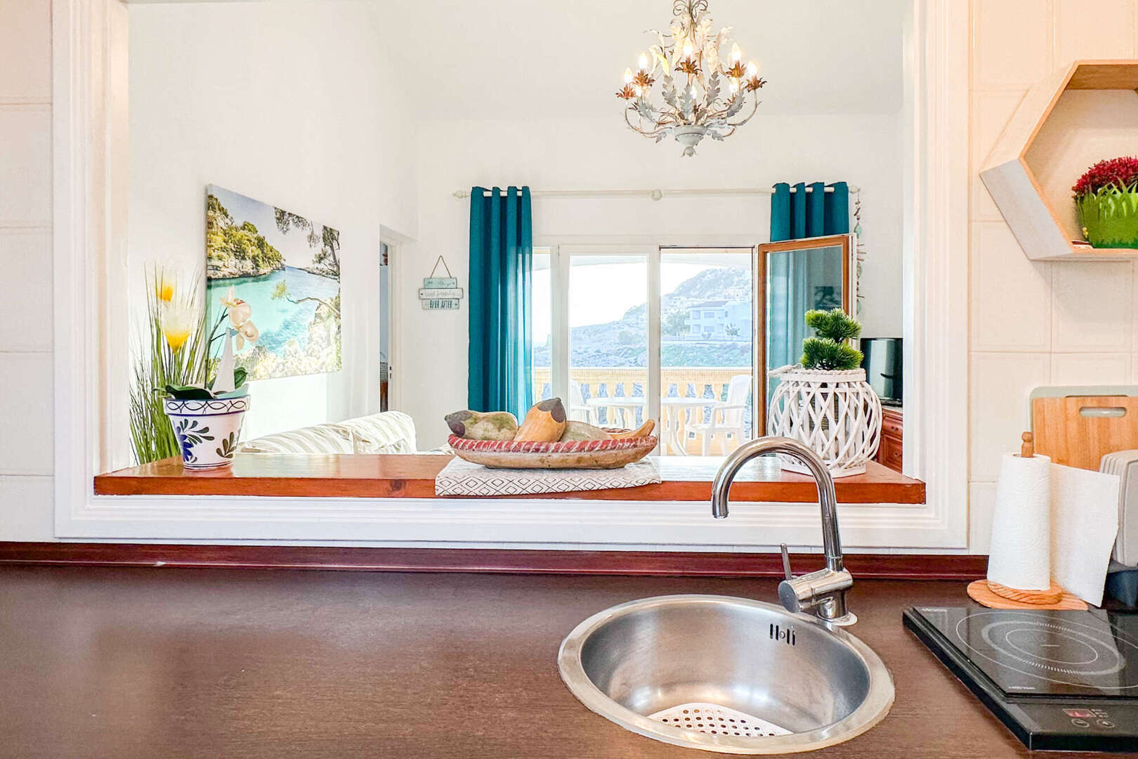 Eine kleine Küche mit Durchreiche rundet das Raumangebot noch einmal schön ab. Das Wohnzimmer hat Zugang zu der gemütlichen überdachten Veranda mit spektakulärem Meerblick. Bei gutem Wetter schaut man bis nach Mallorca.