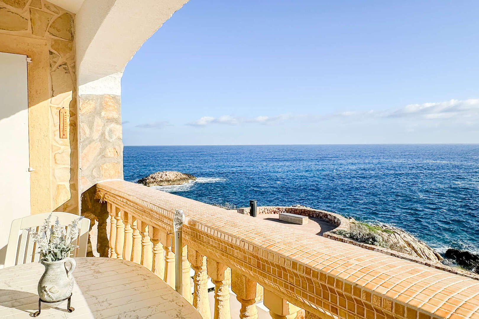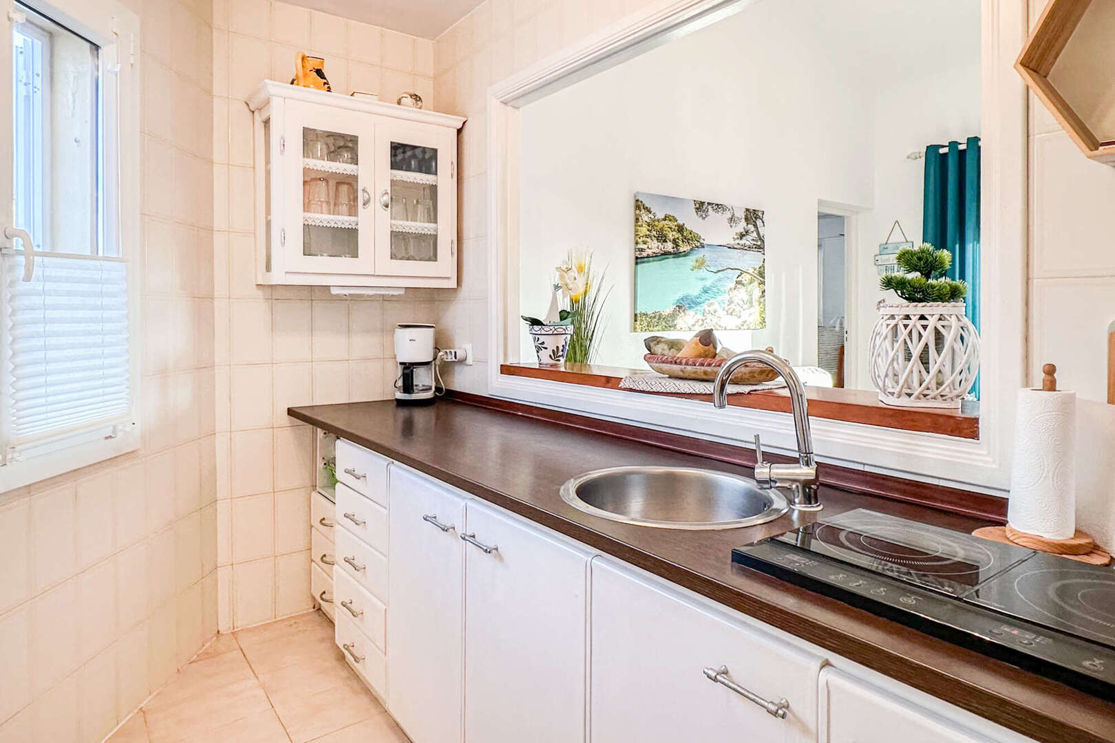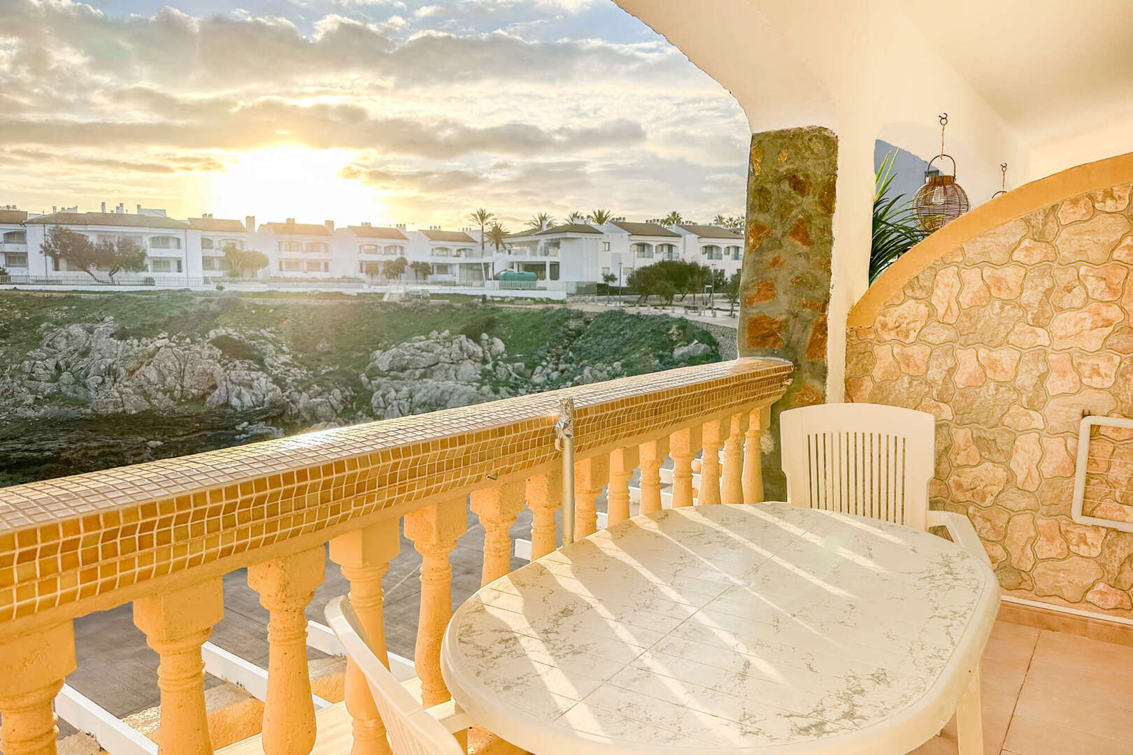 Eine kleine Küche mit Durchreiche rundet das Raumangebot noch einmal schön ab. Das Wohnzimmer hat Zugang zu der gemütlichen überdachten Veranda mit spektakulärem Meerblick. Bei gutem Wetter schaut man bis nach Mallorca.