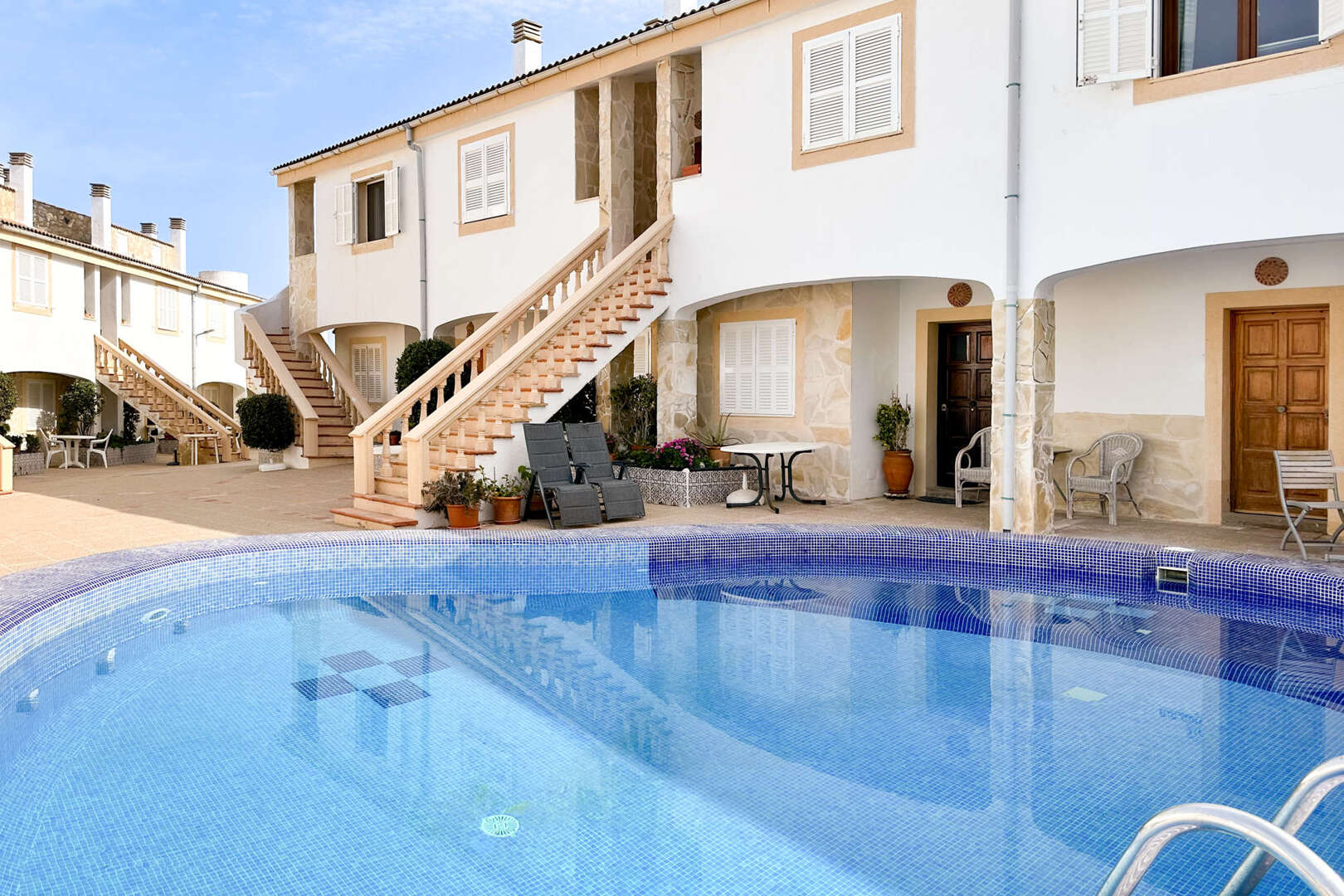 Die kleine Anlage besteht aus 30 Apartments, die sich auf zwei Gebäuden mit jeweils zwei Etagen verteilen. Das Hausmeisterpaar ist deutschsprachig und stets als Ansprechpartner erreichbar. Ein erfrischender Gemeinschaftspool und eine traumhafte Badestelle am Meer lässt Sie das mediterrane Lebensgefühl dieser beliebten Ferienanlage spüren und genießen.
