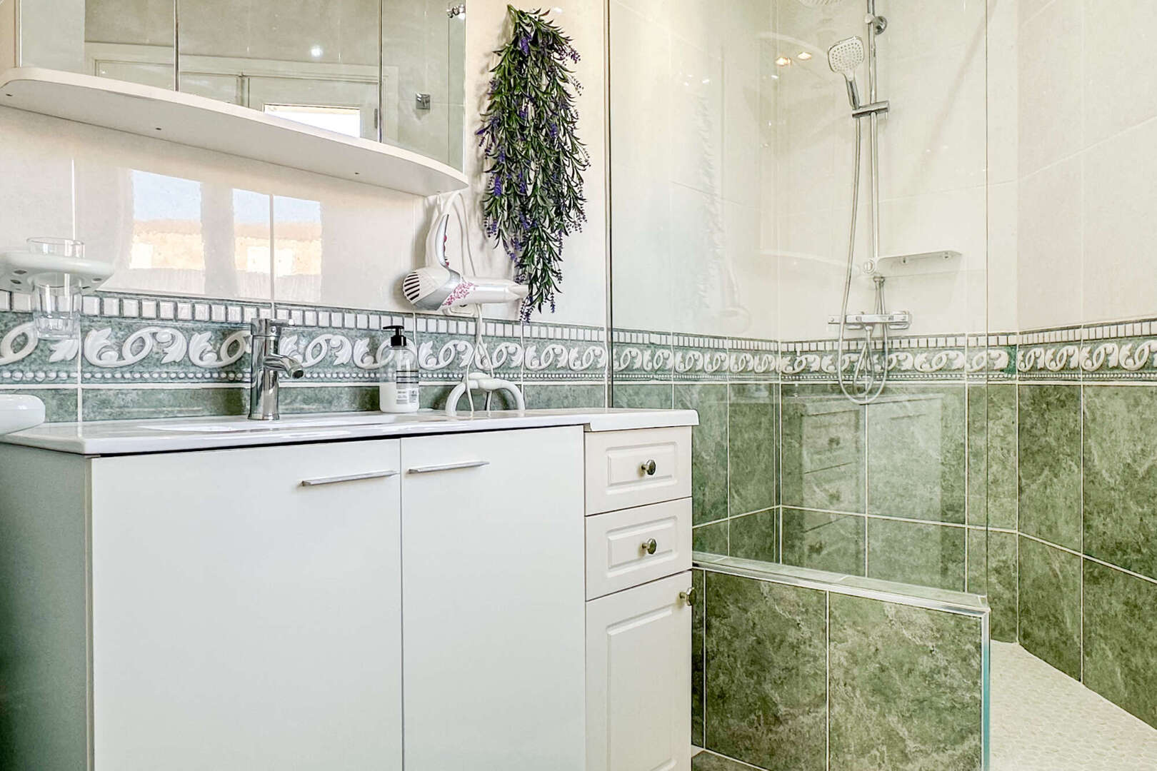 * Badezimmer mit geräumiger Dusche und Fenster