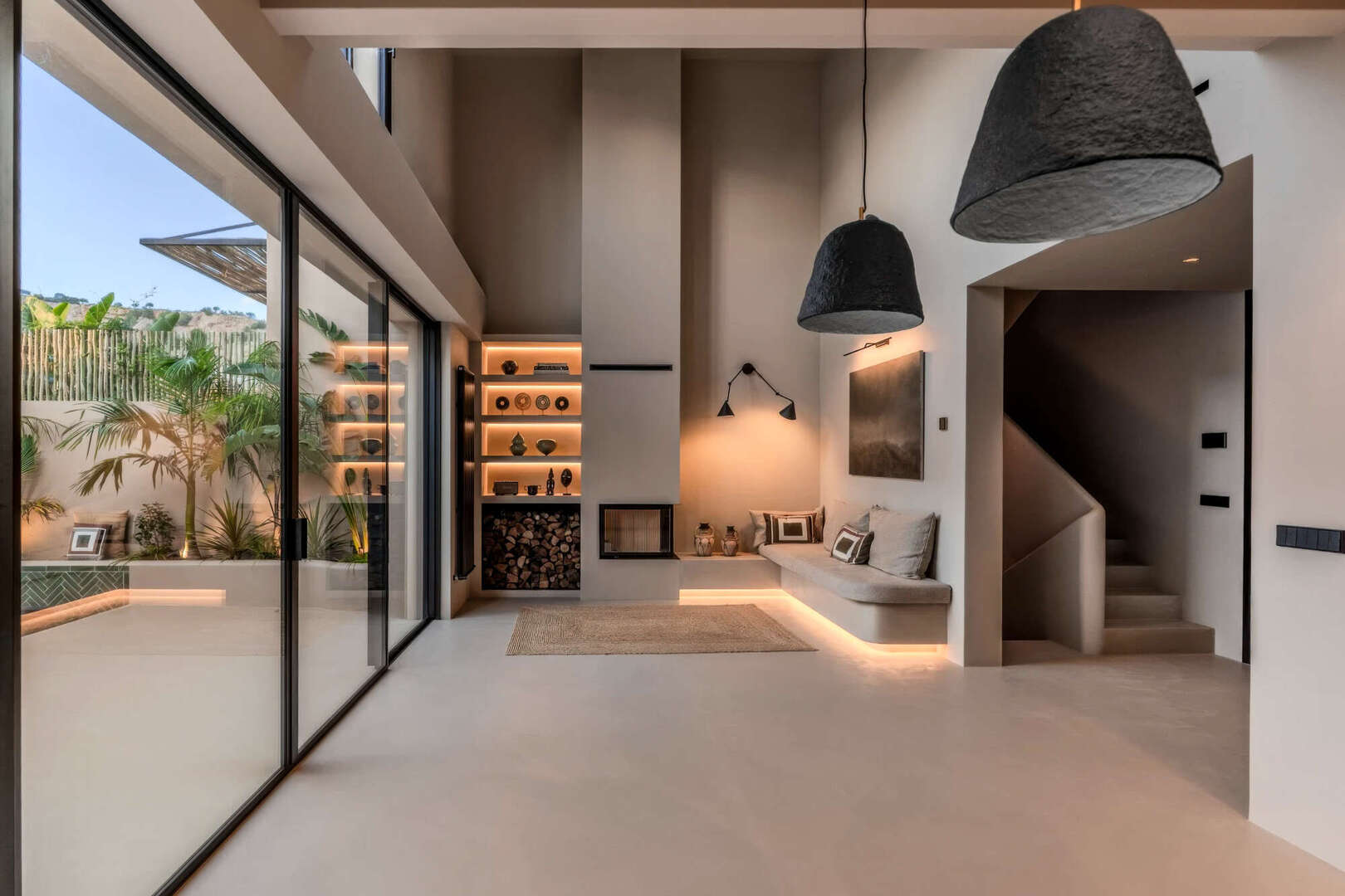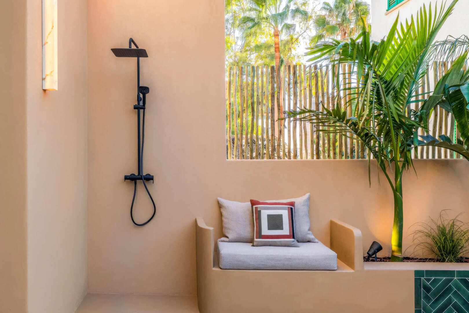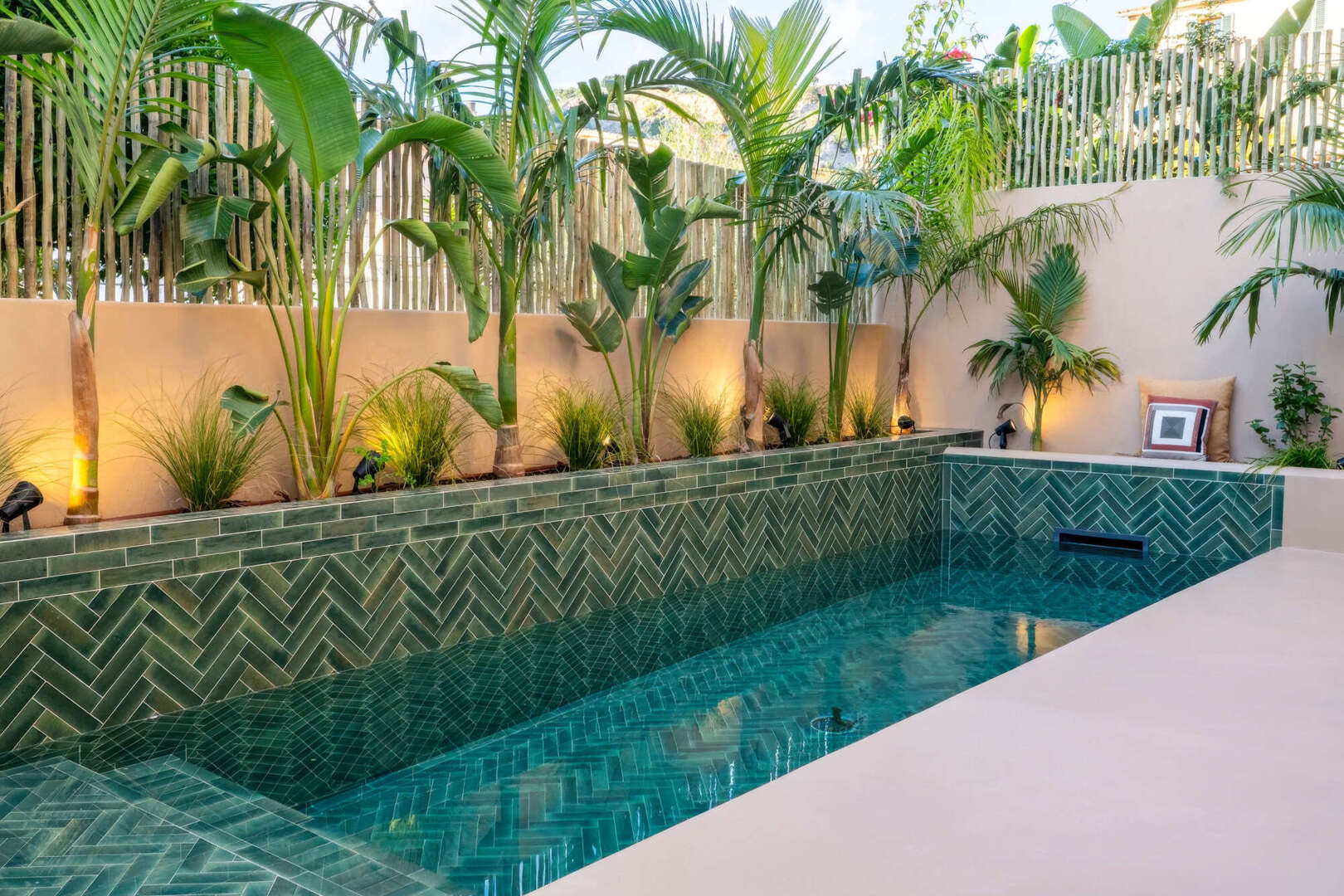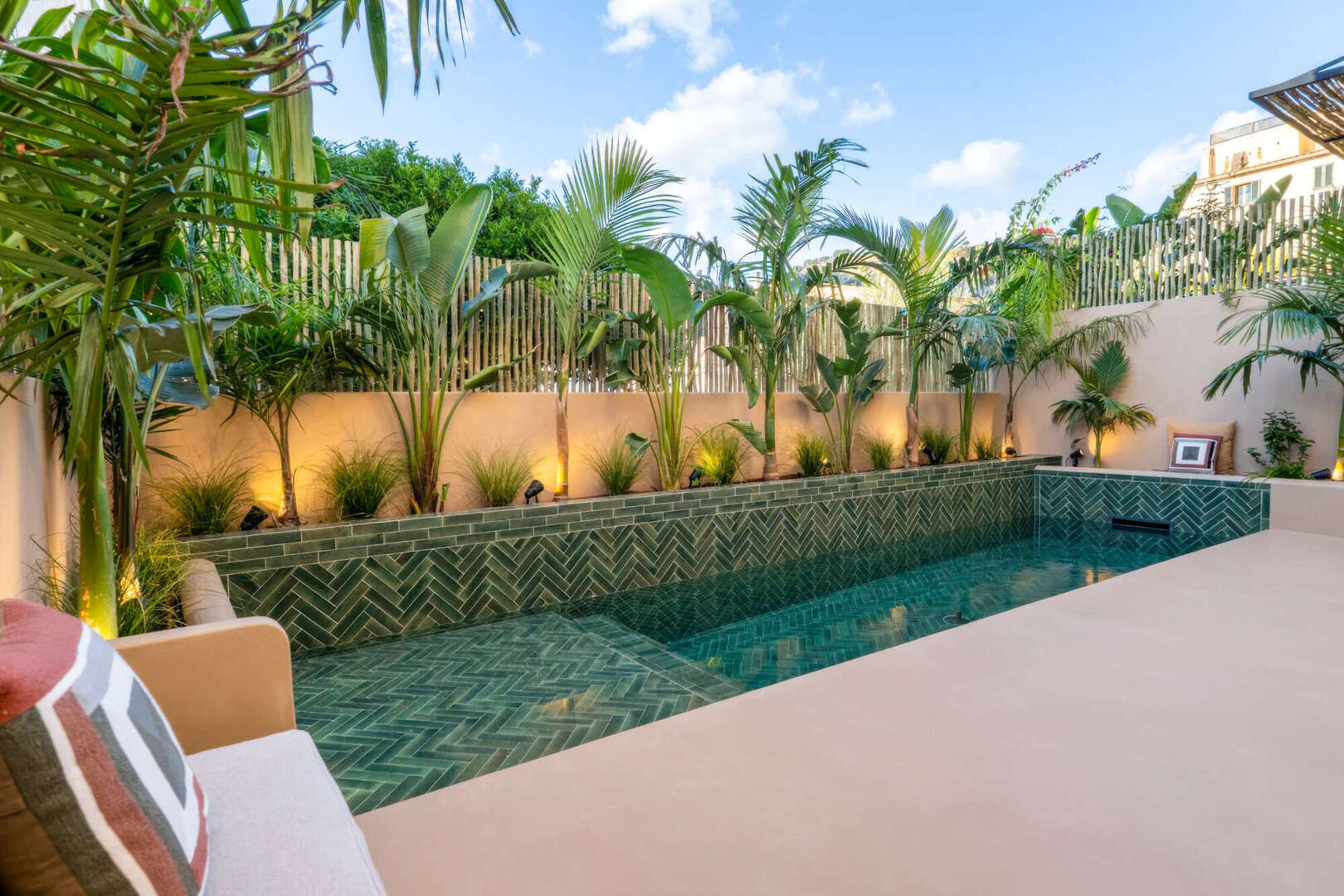 Vom Wohnbereich aus gelangt man auf die sonnige Terrasse mit großzügigem Salzwasser Pool, eingebettet in mediterrane Palmen.