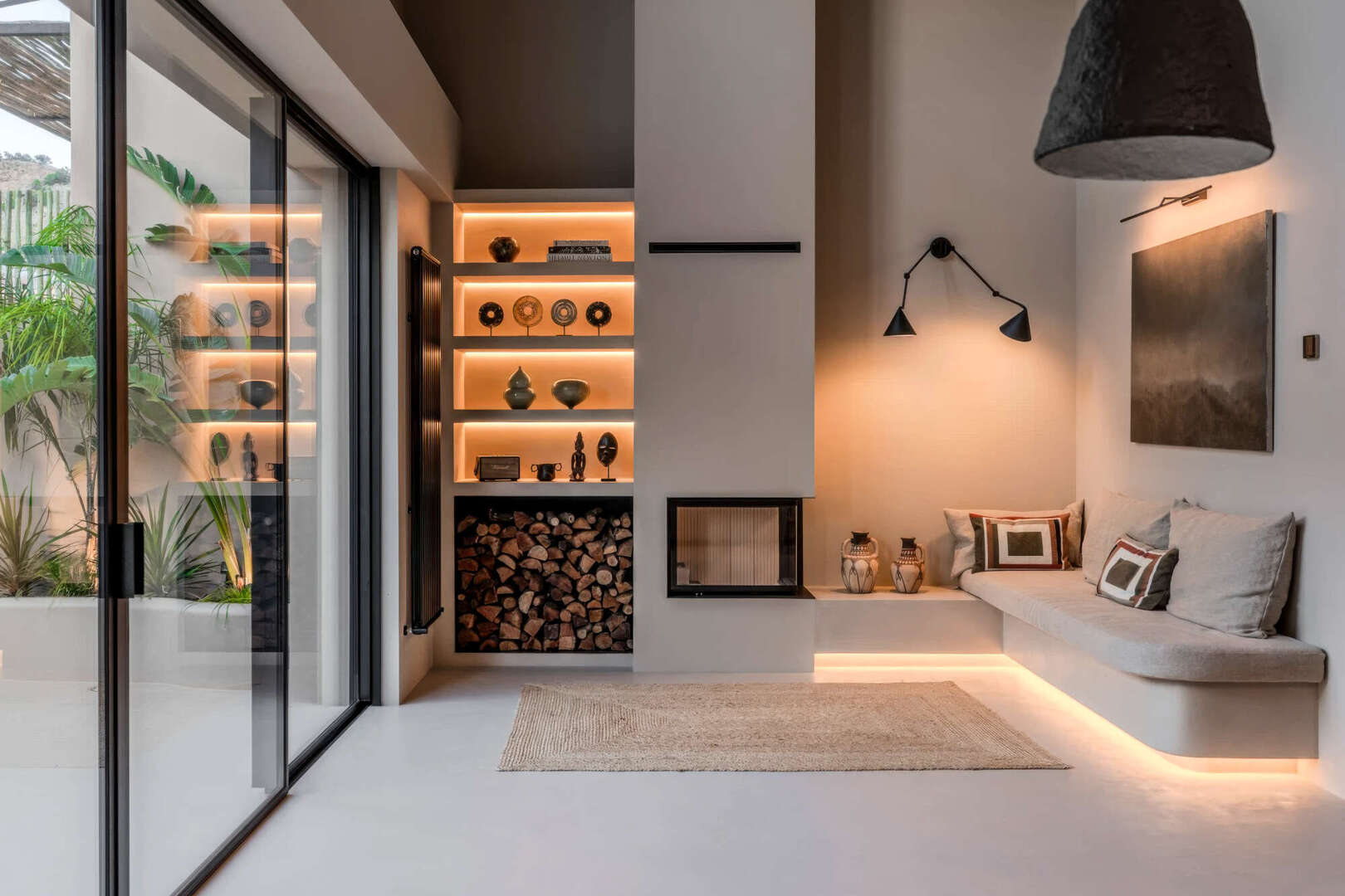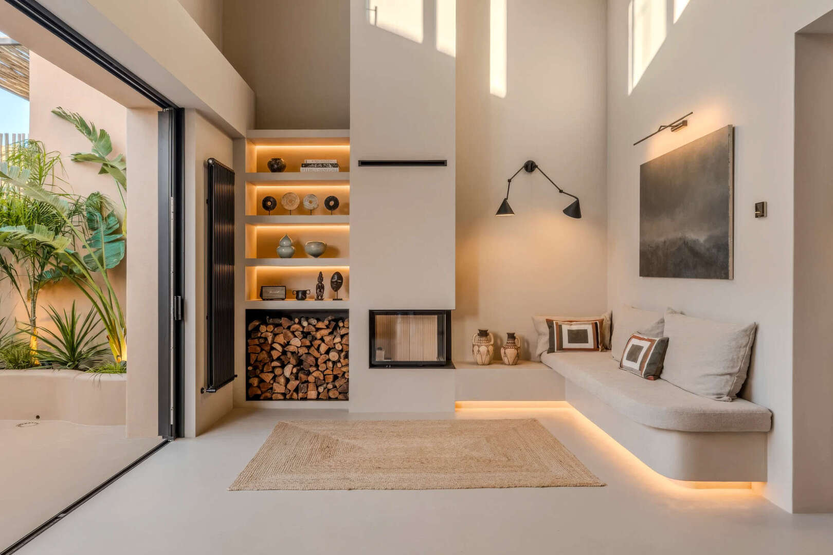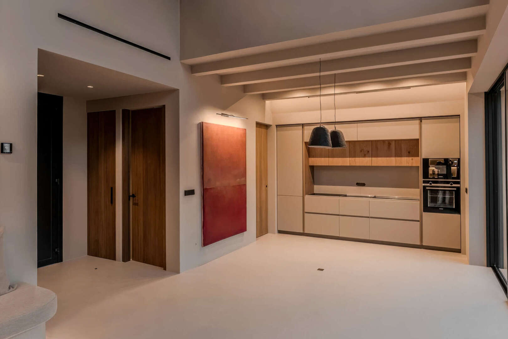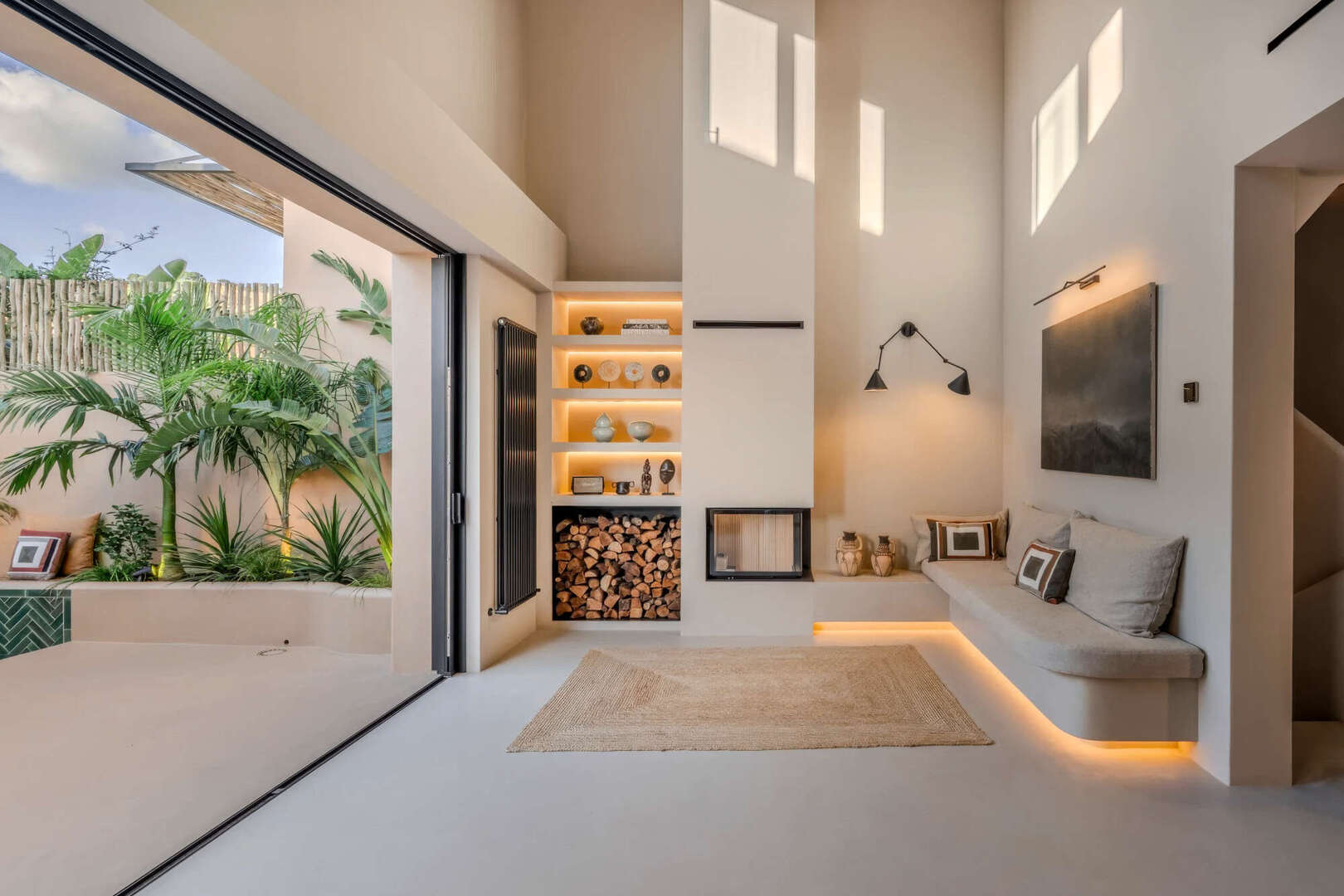 Vom Wohnbereich aus gelangt man auf die sonnige Terrasse mit großzügigem Salzwasser Pool, eingebettet in mediterrane Palmen.