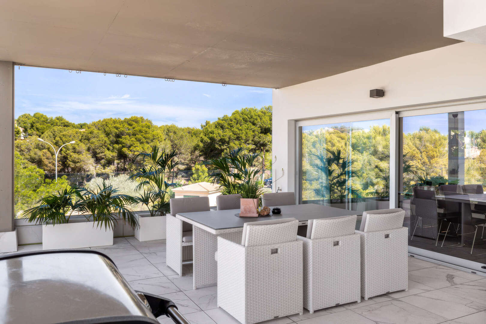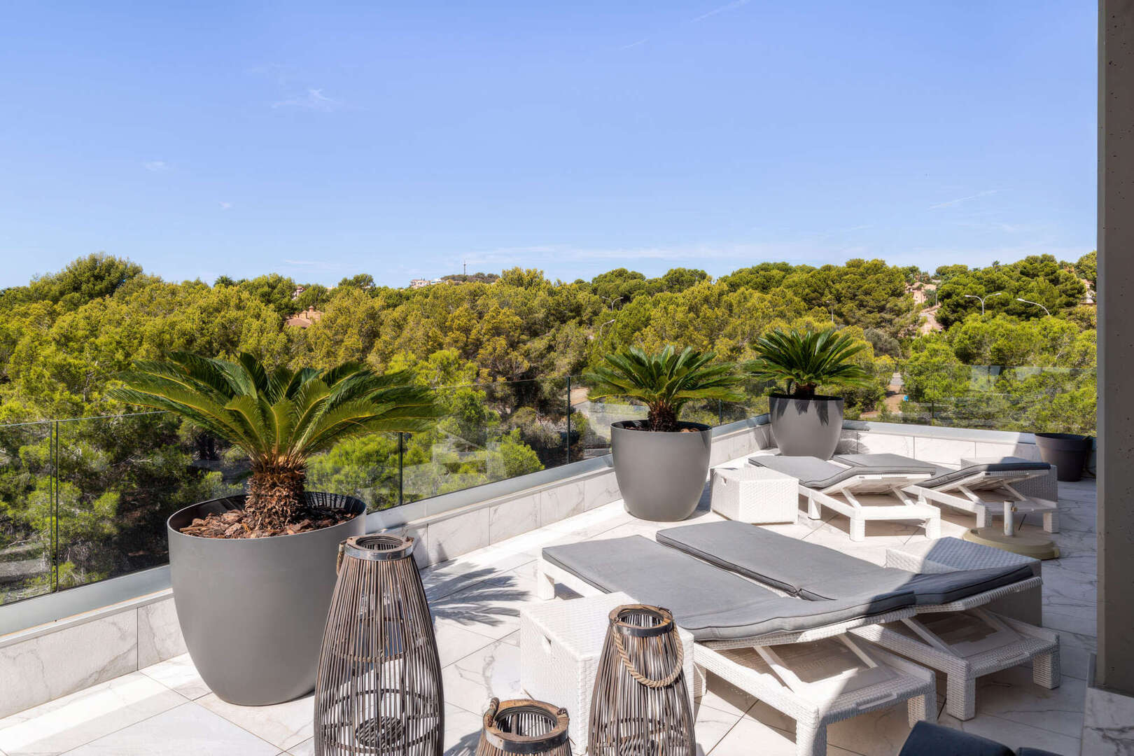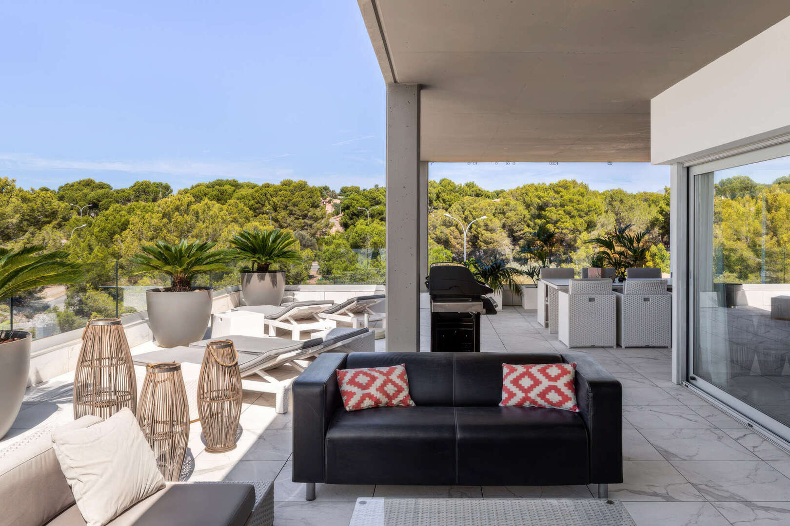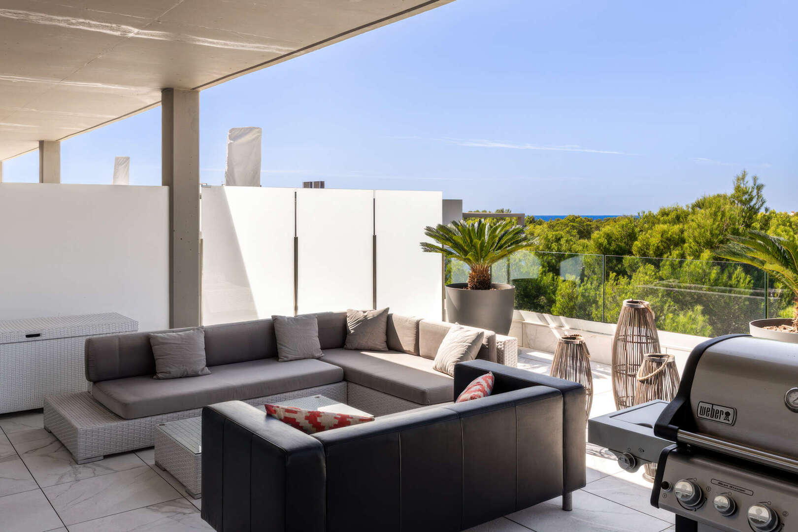 Das absolute Highlight ist die ca. 85 m² große, teilweise überdachte Terrasse auf Wohnebene. Hier haben Sie viel Platz für gesellige Abende im Freien, entspannte Stunden mit Familie und Freunden oder einen Sundowner mit herrlichem Blick ins Grüne bis hin zum Meer.