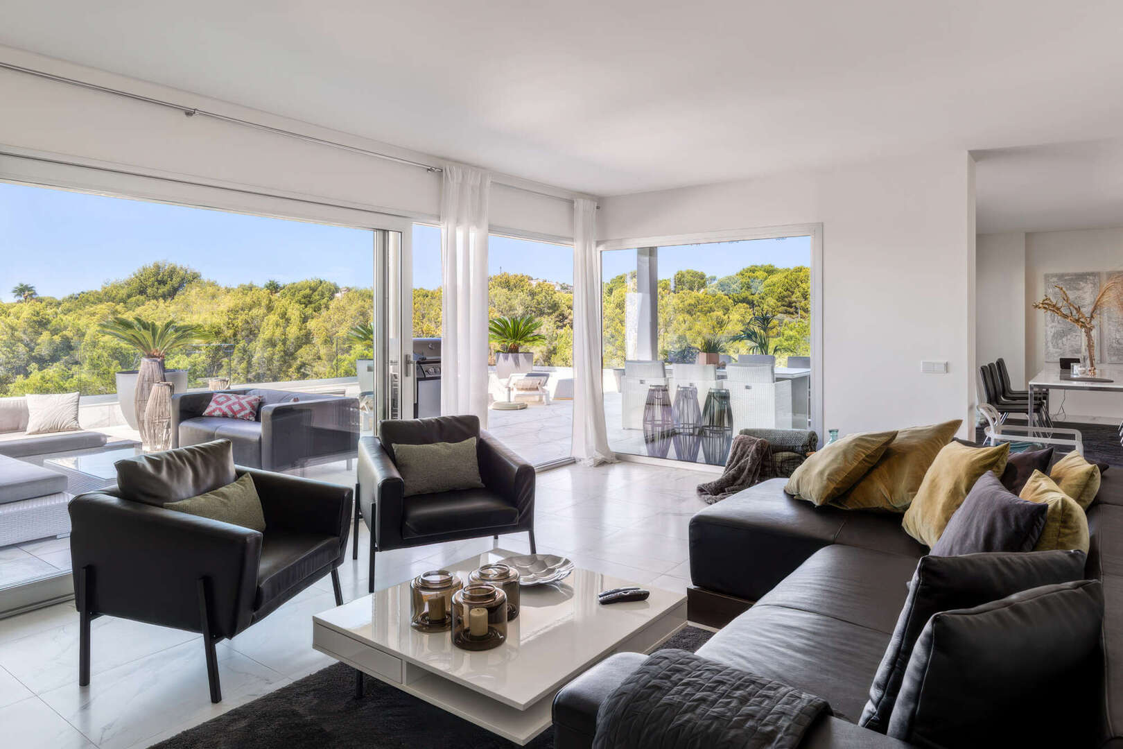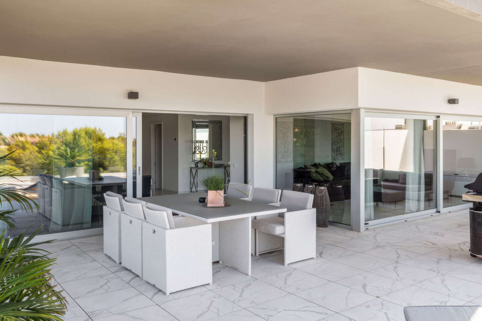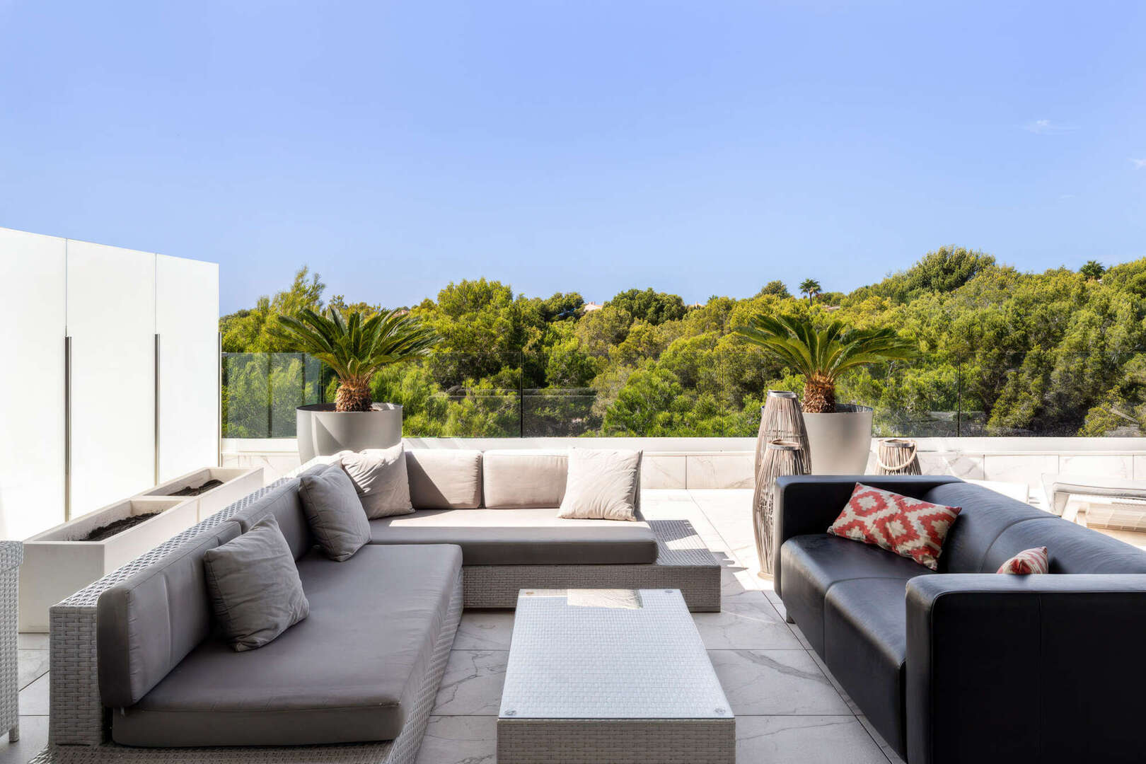 Das absolute Highlight ist die ca. 85 m² große, teilweise überdachte Terrasse auf Wohnebene. Hier haben Sie viel Platz für gesellige Abende im Freien, entspannte Stunden mit Familie und Freunden oder einen Sundowner mit herrlichem Blick ins Grüne bis hin zum Meer.