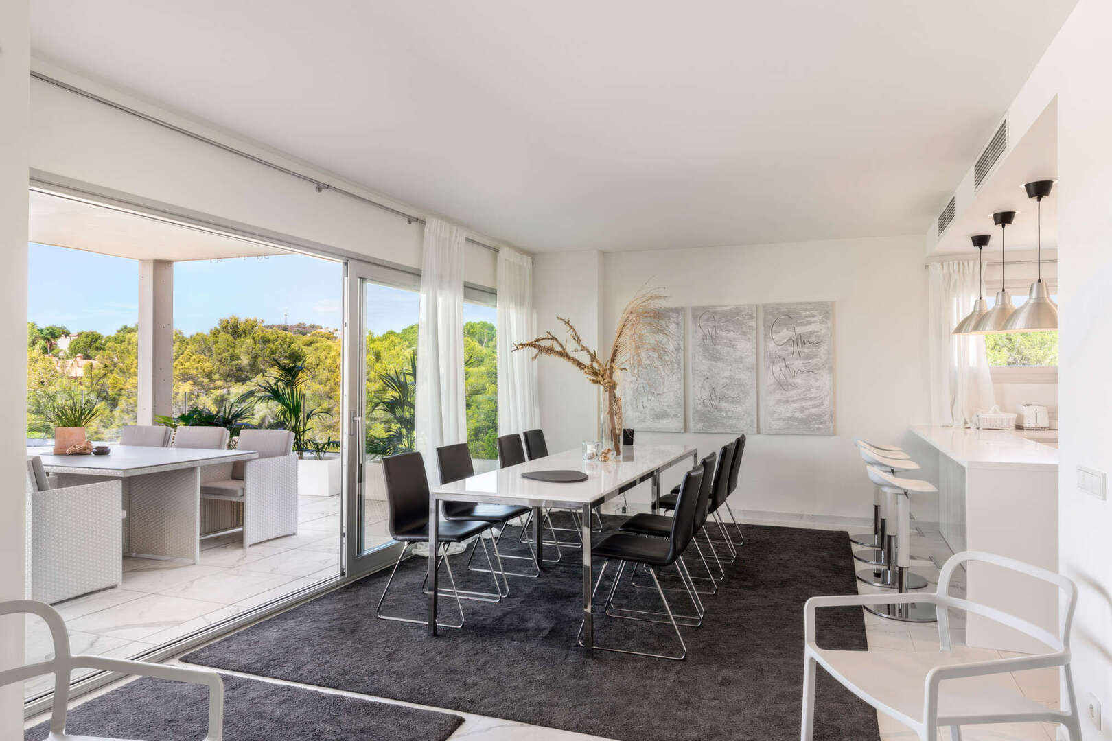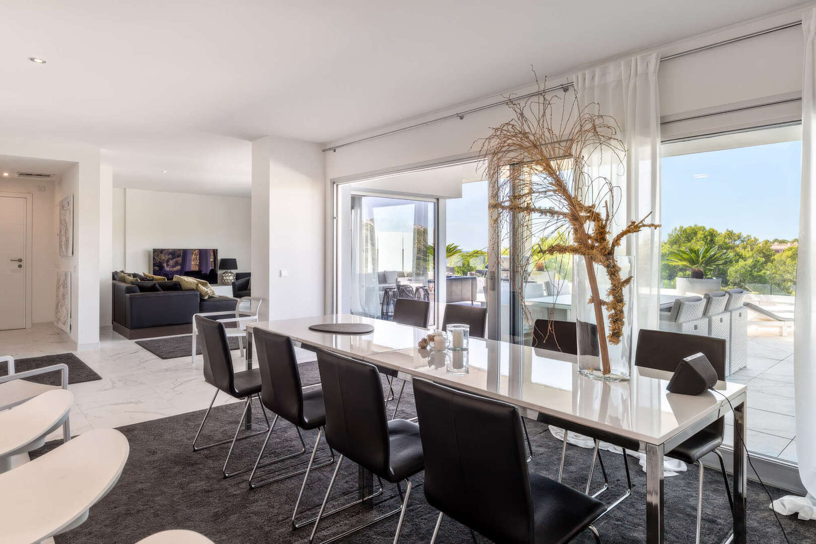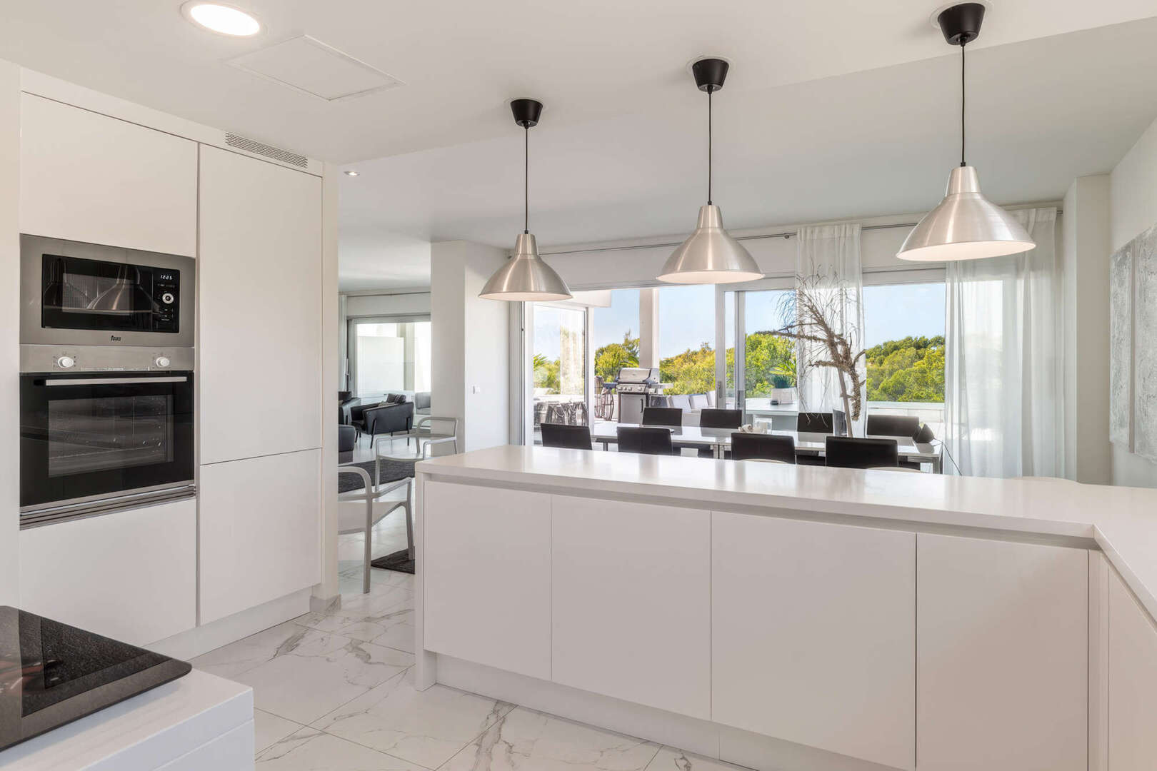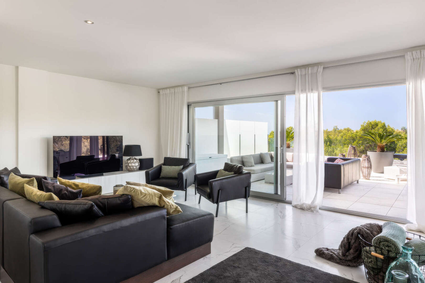 Das absolute Highlight ist die ca. 85 m² große, teilweise überdachte Terrasse auf Wohnebene. Hier haben Sie viel Platz für gesellige Abende im Freien, entspannte Stunden mit Familie und Freunden oder einen Sundowner mit herrlichem Blick ins Grüne bis hin zum Meer.