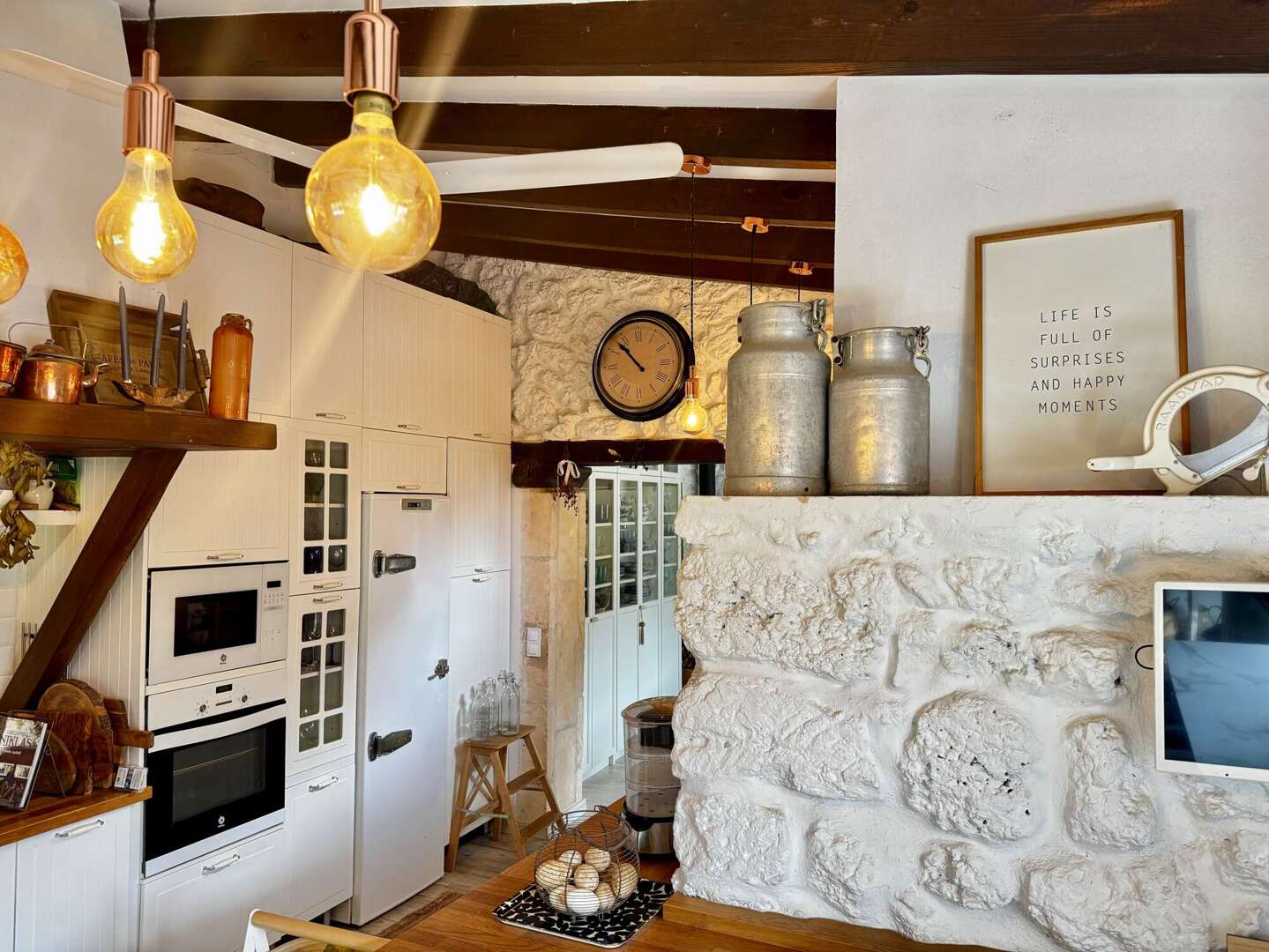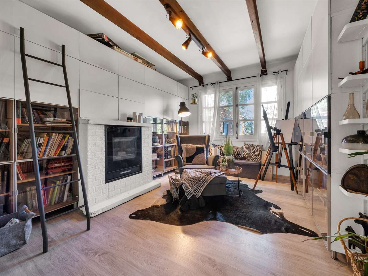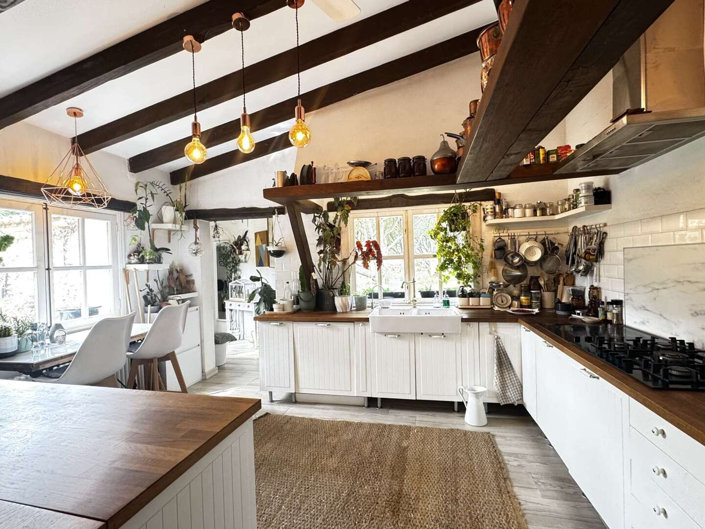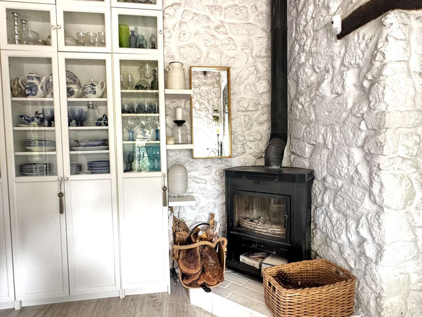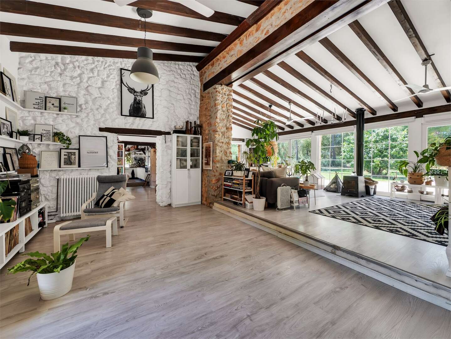 Das Haupthaus verfügt über eine Wohnfläche von ca. 320 m² und erstreckt sich über zwei Etagen sowie einen zusätzlichen Anbau. Im Erdgeschoss befindet sich ein großzügiger, lichtdurchfluteter Wohnbereich, der in zwei Bereiche gegliedert ist und direkten Zugang zur Poolterrasse bietet. Ergänzt wird diese Ebene durch eine vollständig ausgestattete Küche, ein elegantes Esszimmer sowie ein Büro. Das Hauptschlafzimmer mit Ankleidebereich und Bad en suite befindet sich ebenfalls auf dieser Etage. Mehrere Holzkamine sorgen in verschiedenen Räumen für eine besonders gemütliche Atmosphäre.
