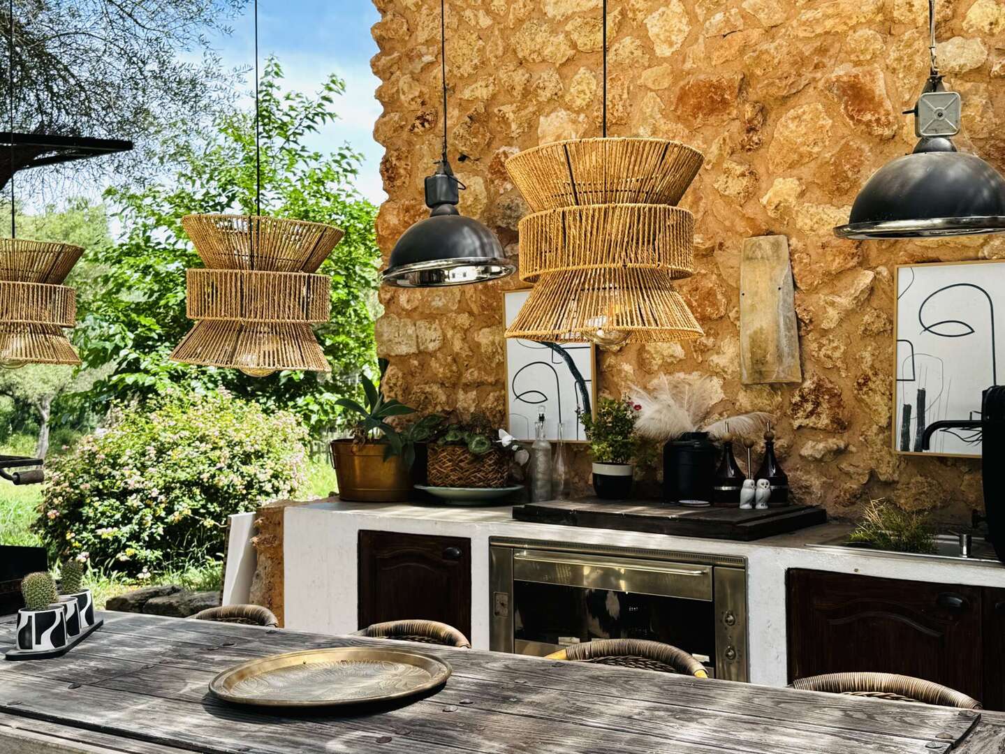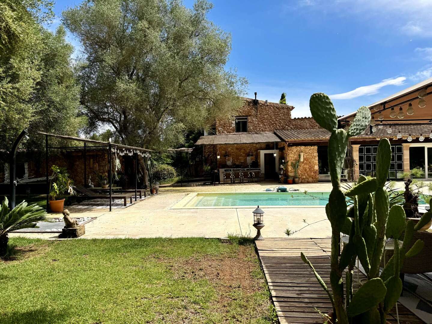 Der Außenbereich lädt zum Entspannen ein. Eine von mediterraner Bepflanzung umgebene Poolanlage bildet den Mittelpunkt. Mehrere großzügige Terrassen – überdacht und offen – bieten viel Platz für Mahlzeiten im Freien
