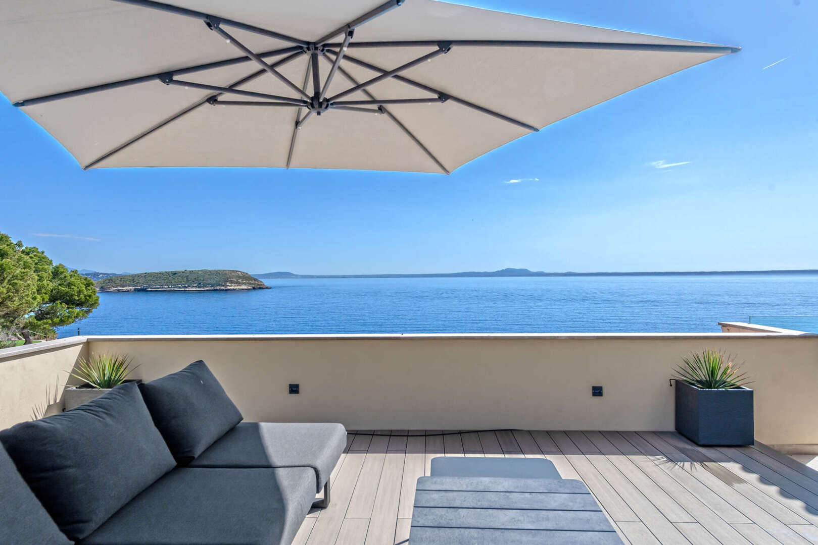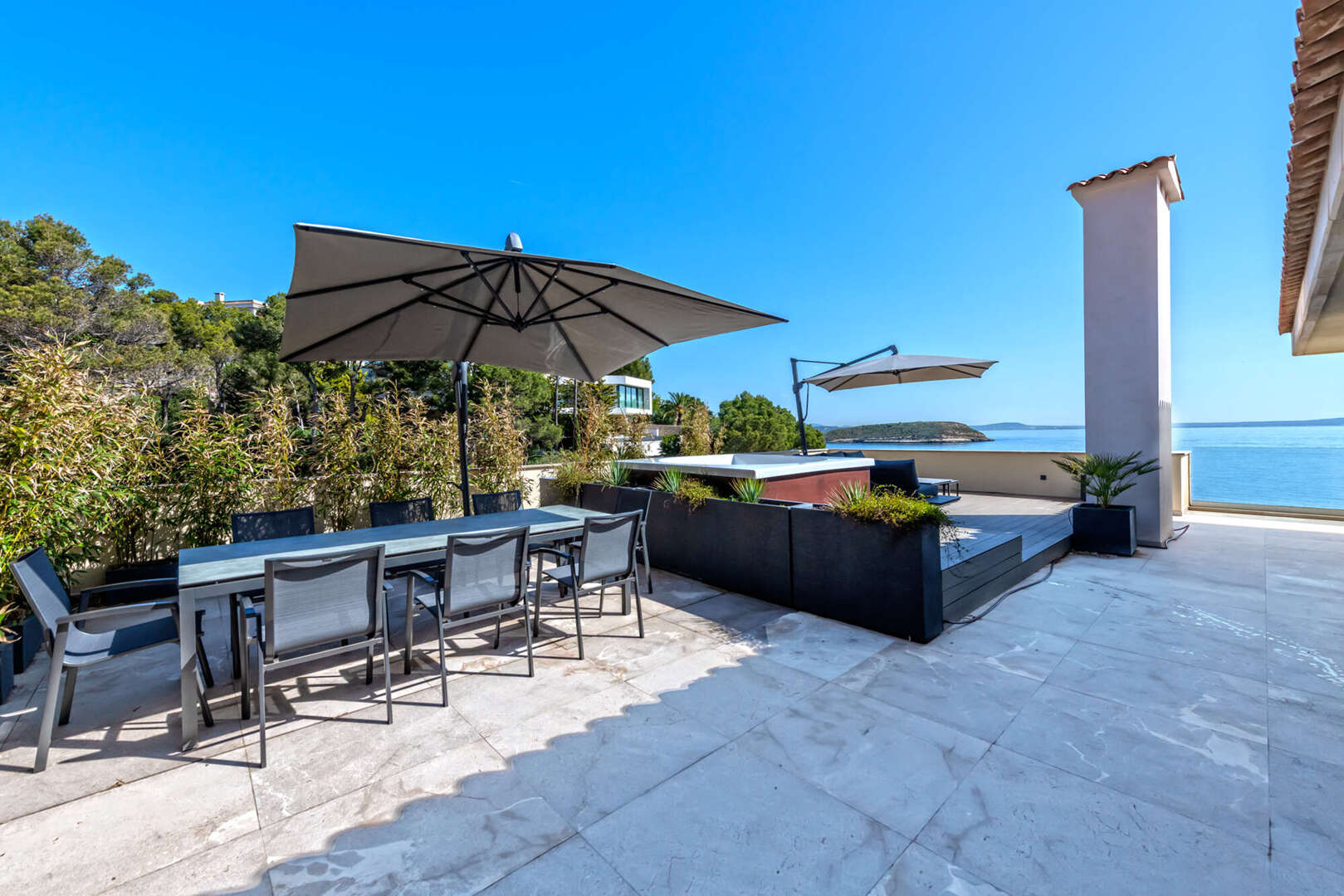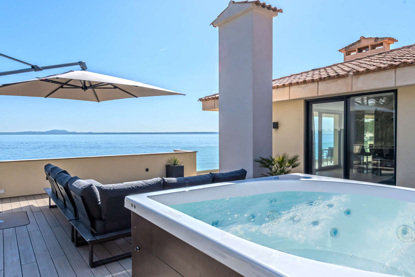 Ein besonderes Highlight ist die großzügige private Dachterrasse mit integriertem Whirlpool. Dieser exklusive Außenbereich lädt zum Entspannen, Sonnenbaden oder zu geselligen Abenden mit Familie und Freunden ein. Dabei genießen Sie maximale Privatsphäre und einen traumhaften Blick auf das Meer und die umliegende Küstenlandschaft.