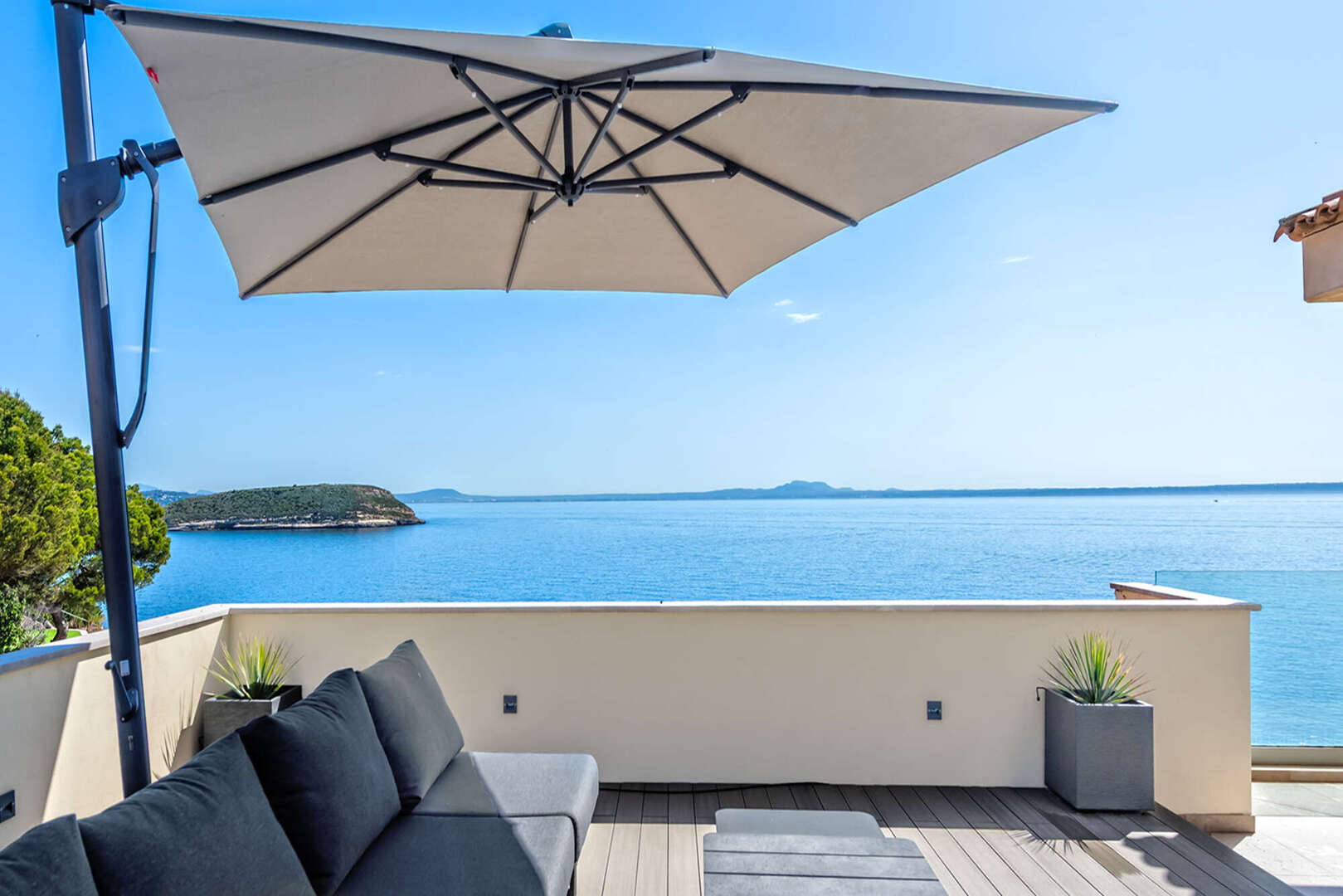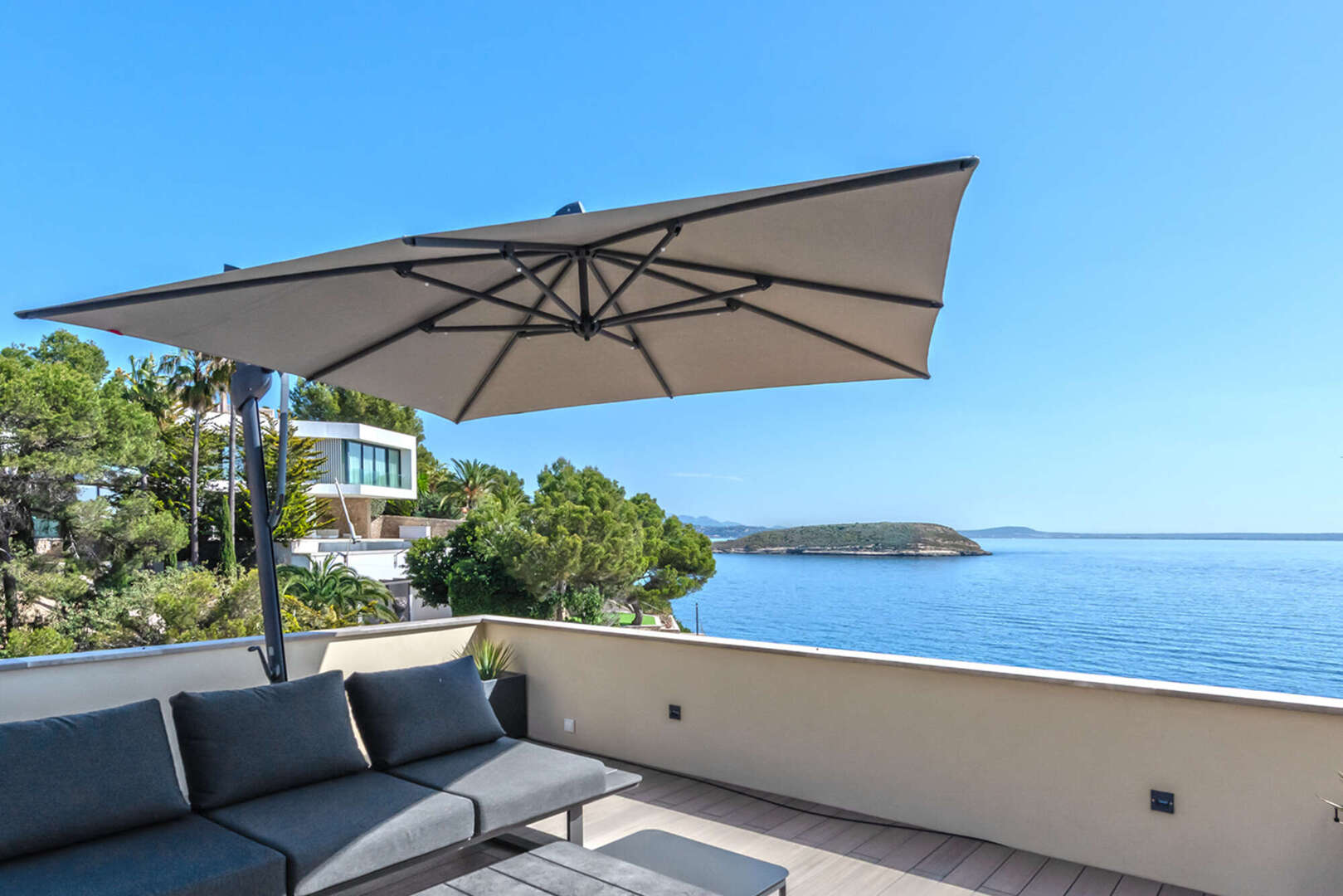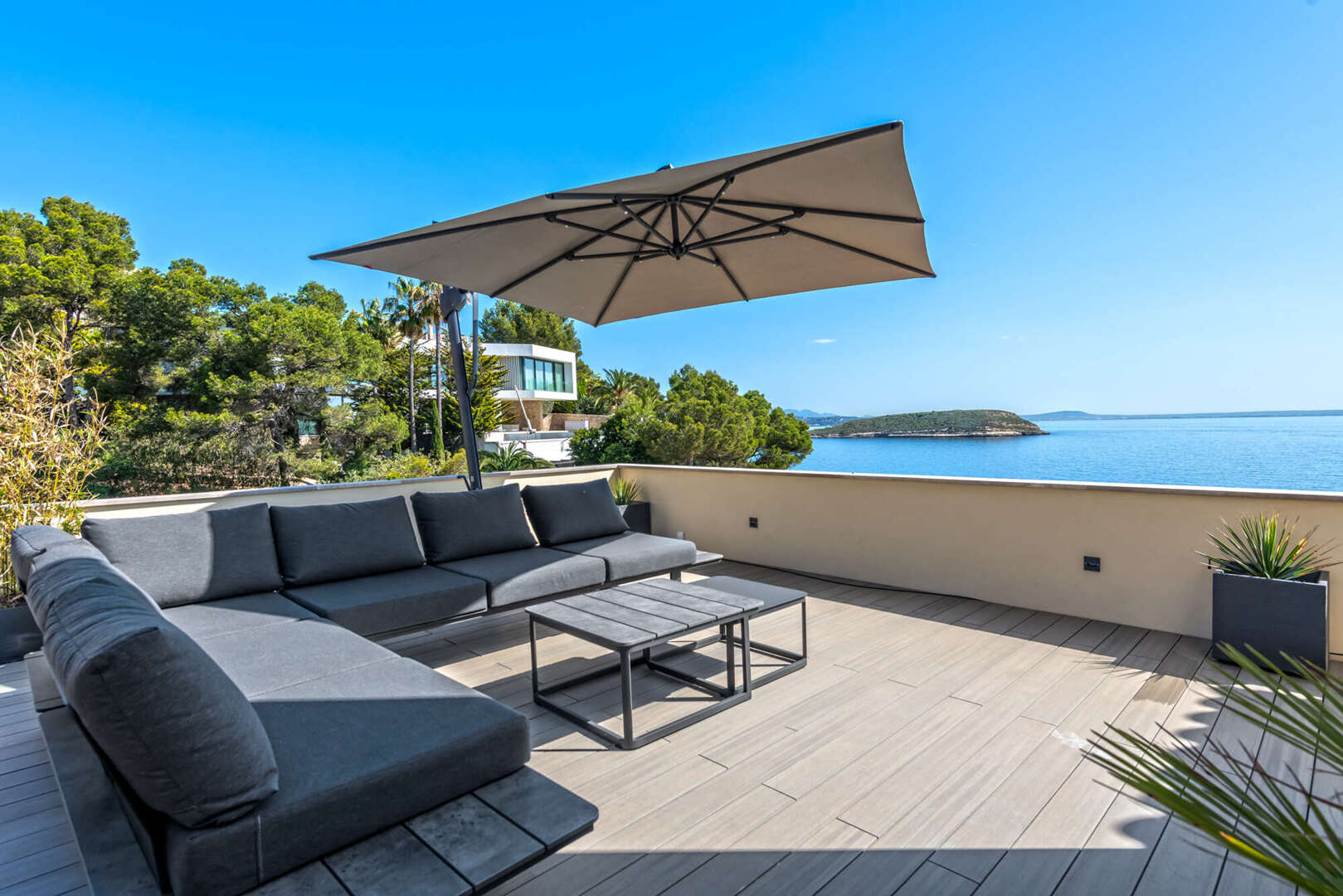 Ein besonderes Highlight ist die großzügige private Dachterrasse mit integriertem Whirlpool. Dieser exklusive Außenbereich lädt zum Entspannen, Sonnenbaden oder zu geselligen Abenden mit Familie und Freunden ein. Dabei genießen Sie maximale Privatsphäre und einen traumhaften Blick auf das Meer und die umliegende Küstenlandschaft.