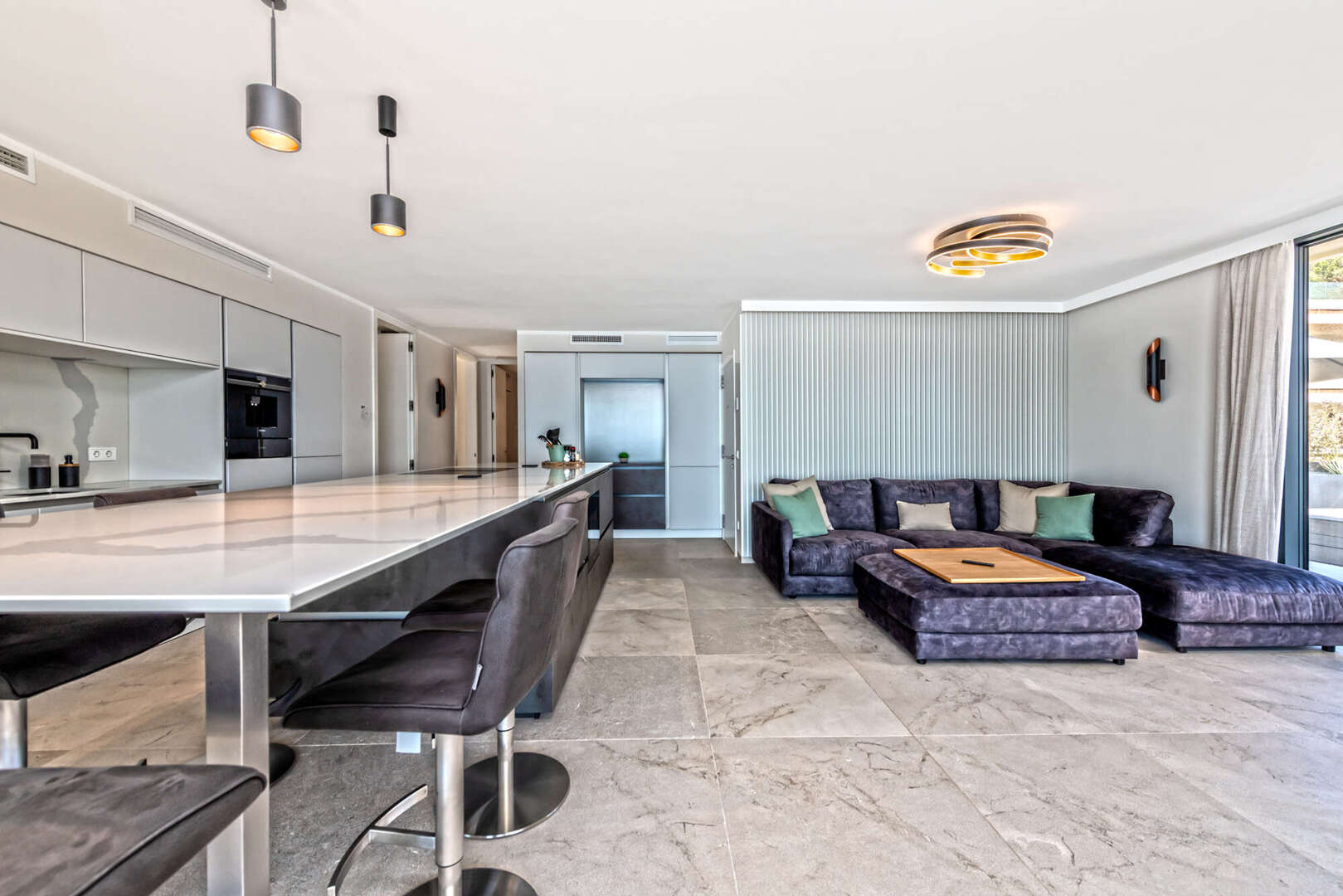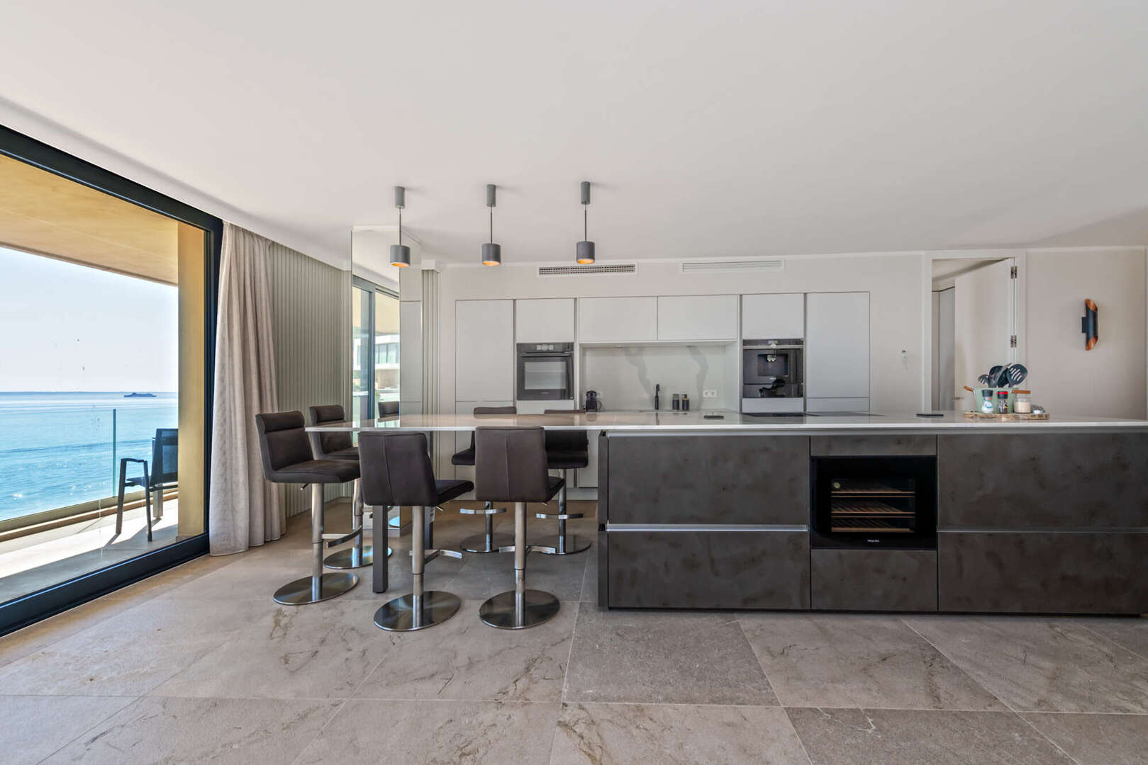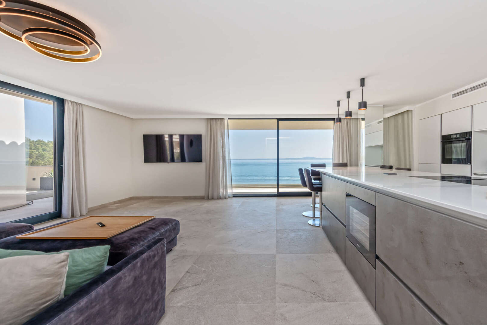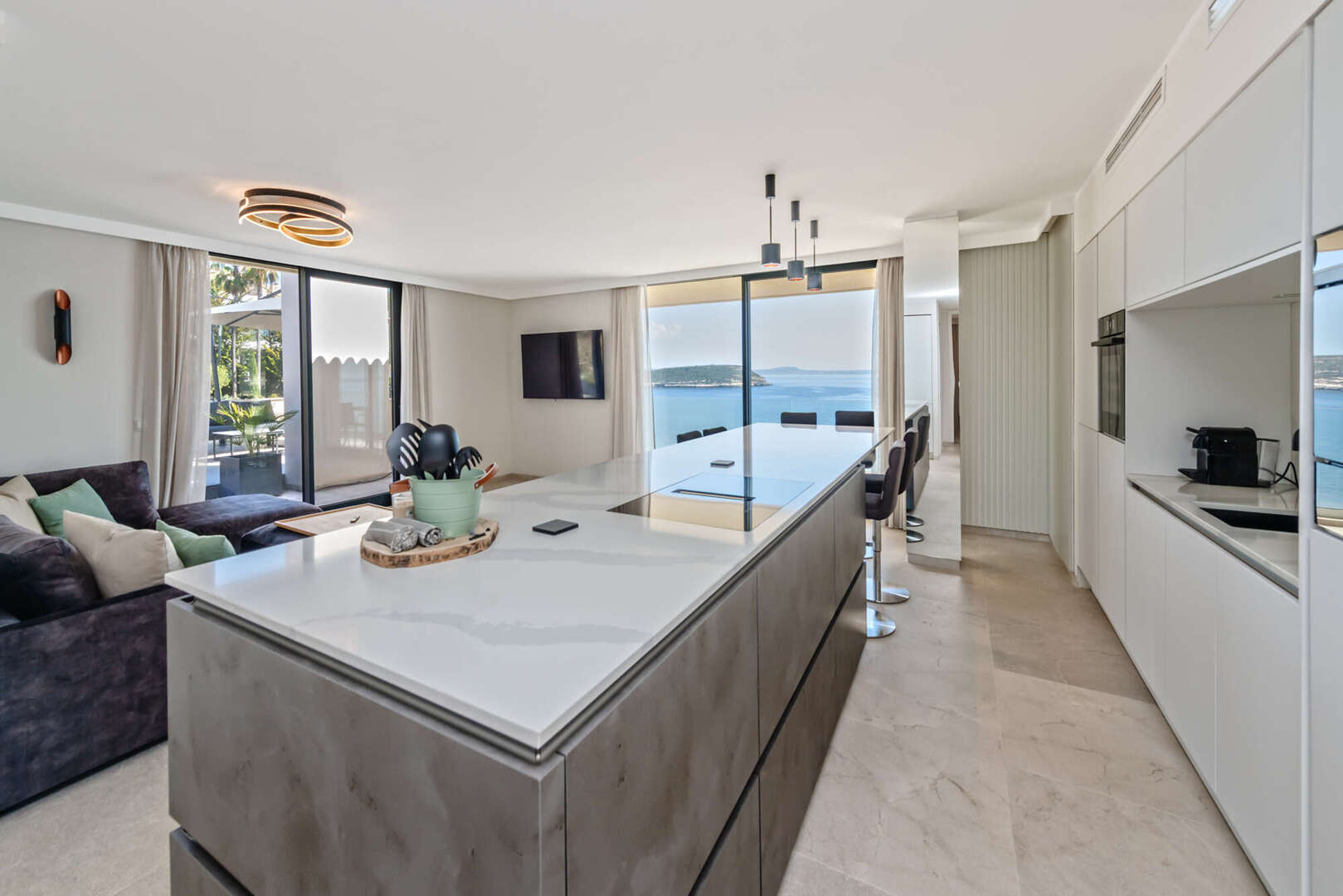 Der offene Wohn- und Essbereich mit moderner Designerküche überzeugt durch hochwertige Materialien und eine stilvolle Ausstattung. Große Fensterflächen sorgen für viel Tageslicht und unterstreichen die einzigartige Lage direkt am Meer. Von hier aus gelangen Sie direkt auf die Terrassen, wodurch Innen- und Außenbereich harmonisch miteinander verbunden werden.