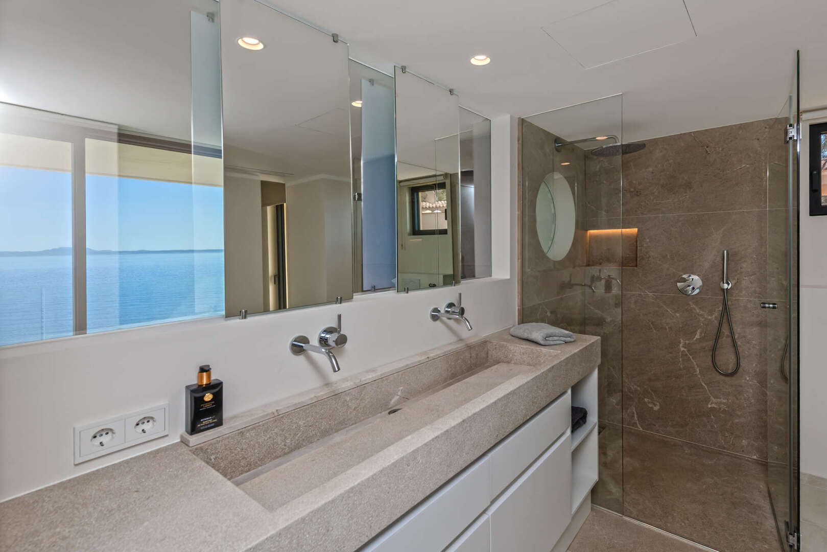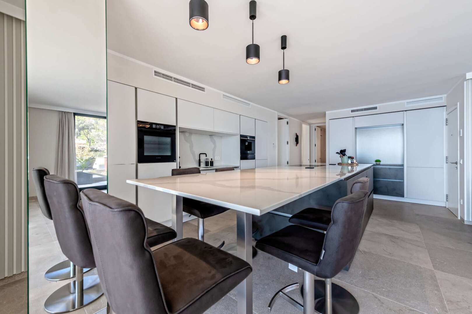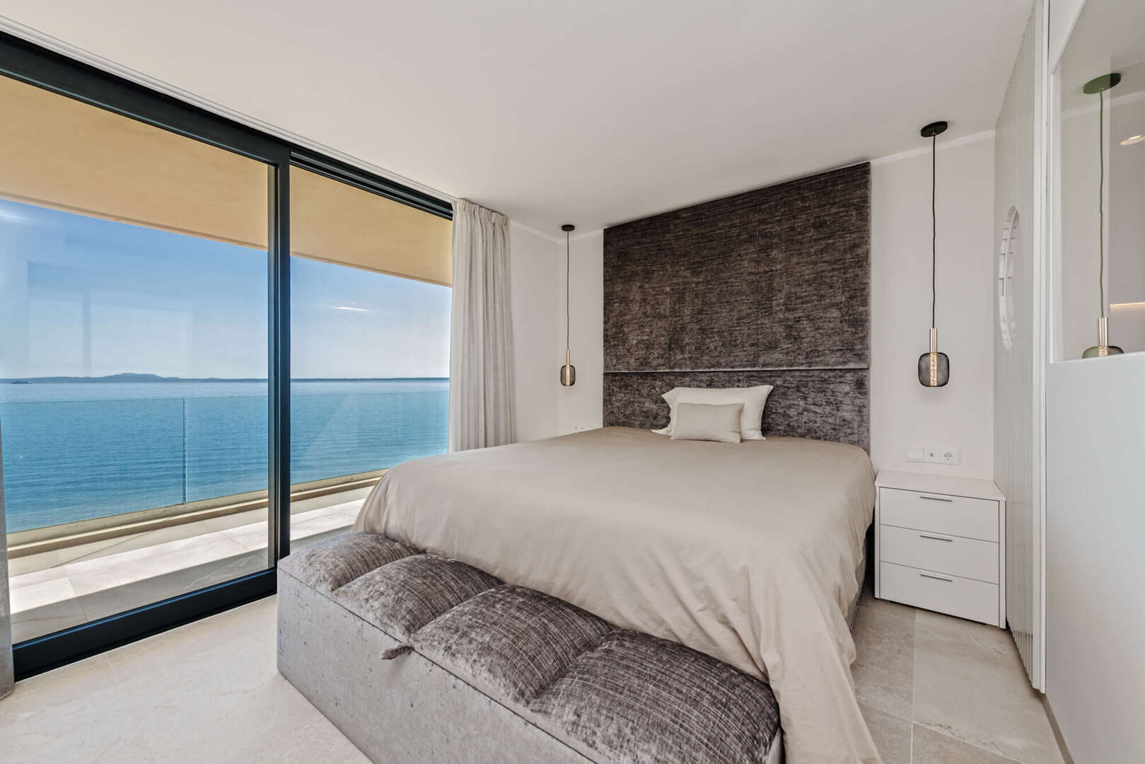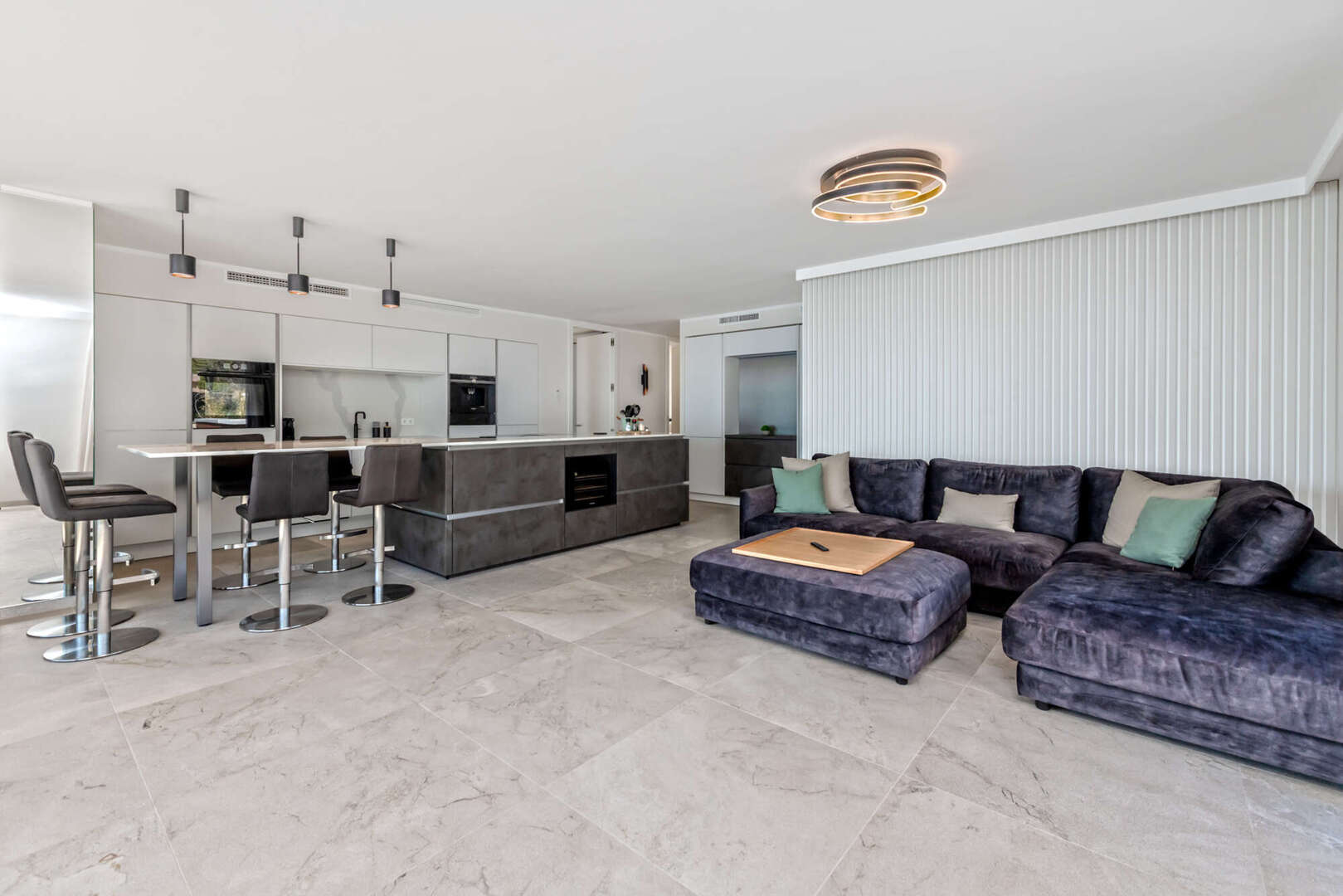 Der offene Wohn- und Essbereich mit moderner Designerküche überzeugt durch hochwertige Materialien und eine stilvolle Ausstattung. Große Fensterflächen sorgen für viel Tageslicht und unterstreichen die einzigartige Lage direkt am Meer. Von hier aus gelangen Sie direkt auf die Terrassen, wodurch Innen- und Außenbereich harmonisch miteinander verbunden werden.