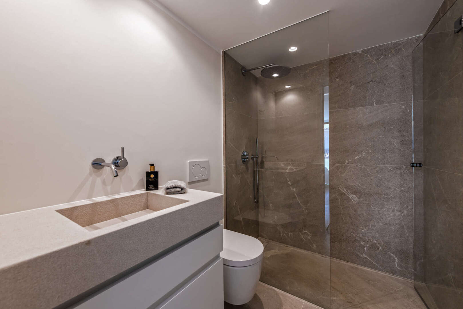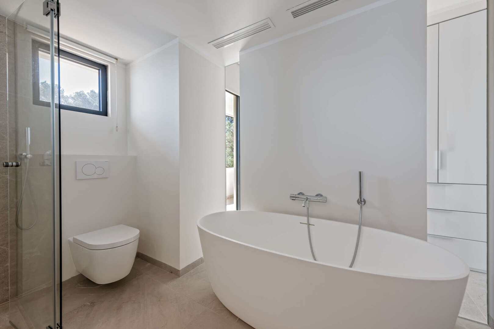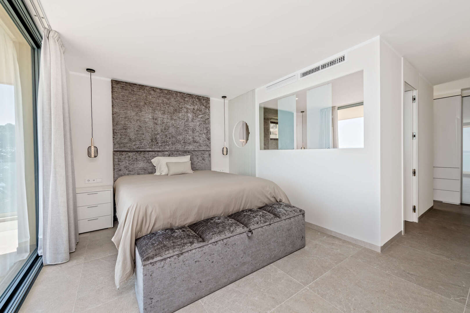 Die Immobilie verfügt über eine großzügige Master-Suite mit Ankleidebereich sowie einem eleganten Badezimmer mit Dusche und Badewanne. Zwei weitere Schlafzimmer und ein zusätzliches modernes Badezimmer bieten ausreichend Platz für Familie oder Gäste.