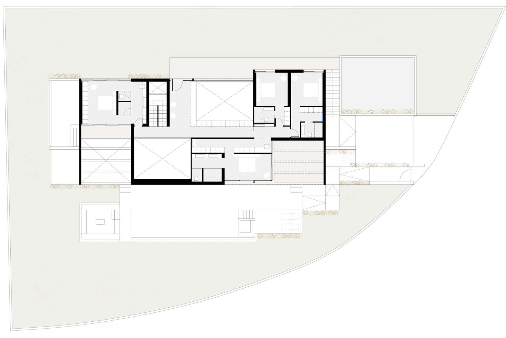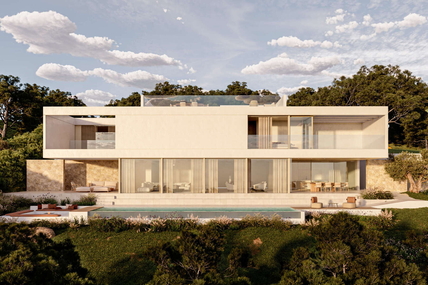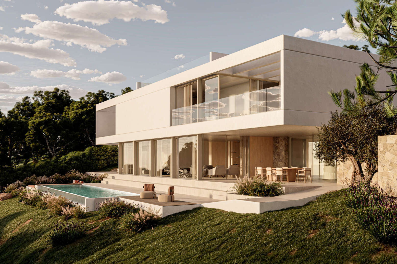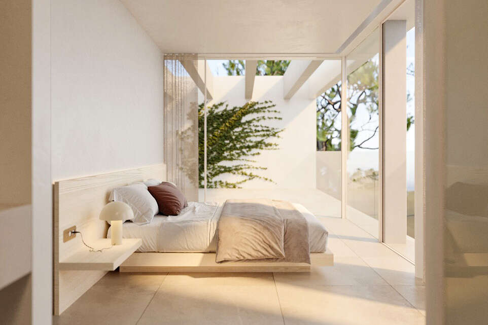 Im Obergeschoss befinden sich die Master-Suite mit Ankleide und drei weitere Schlafzimmer, teilweise mit Zugang zu einer privaten Terrassen.