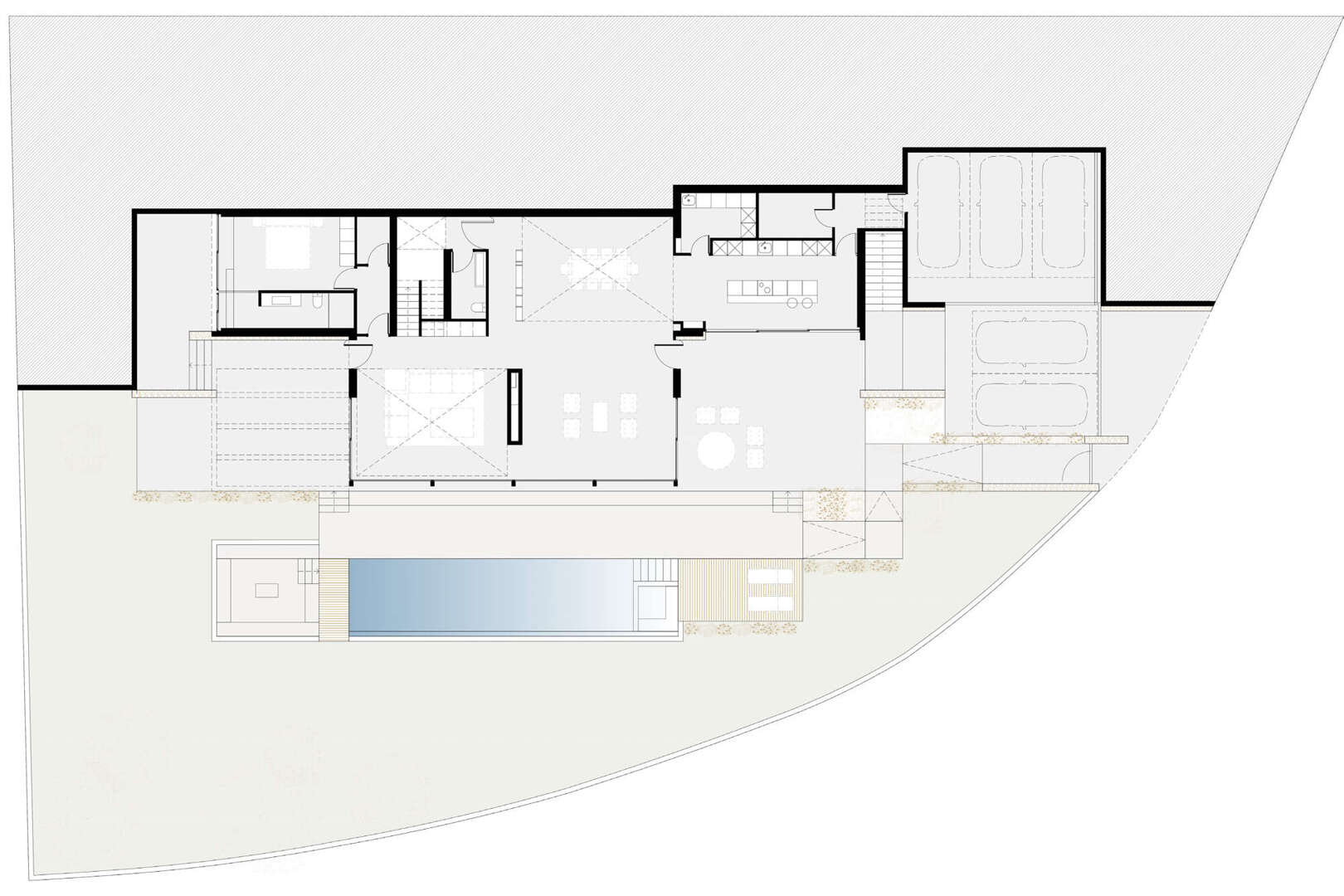 Die Hauptebene verteilt sich auf einem großzügigen und offenen Wohn- Essbereich und einer voll ausgestatteten Designer-Küche, sowie einer enormen Bibliothek für zusätzlichen Komfort. Auf dieser Ebene befindet ein geschmackvoll Schlafzimmer en suite und einen Raum den man individuell gestalten kann, wie z.B. als einen Sicherheitsraum oder für einen Aufzug.
