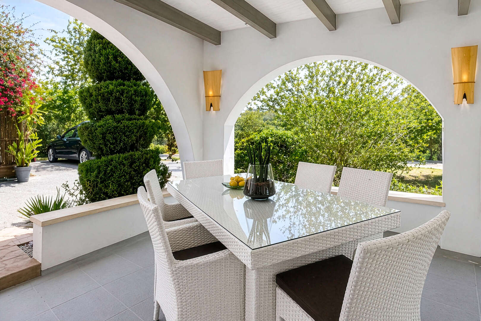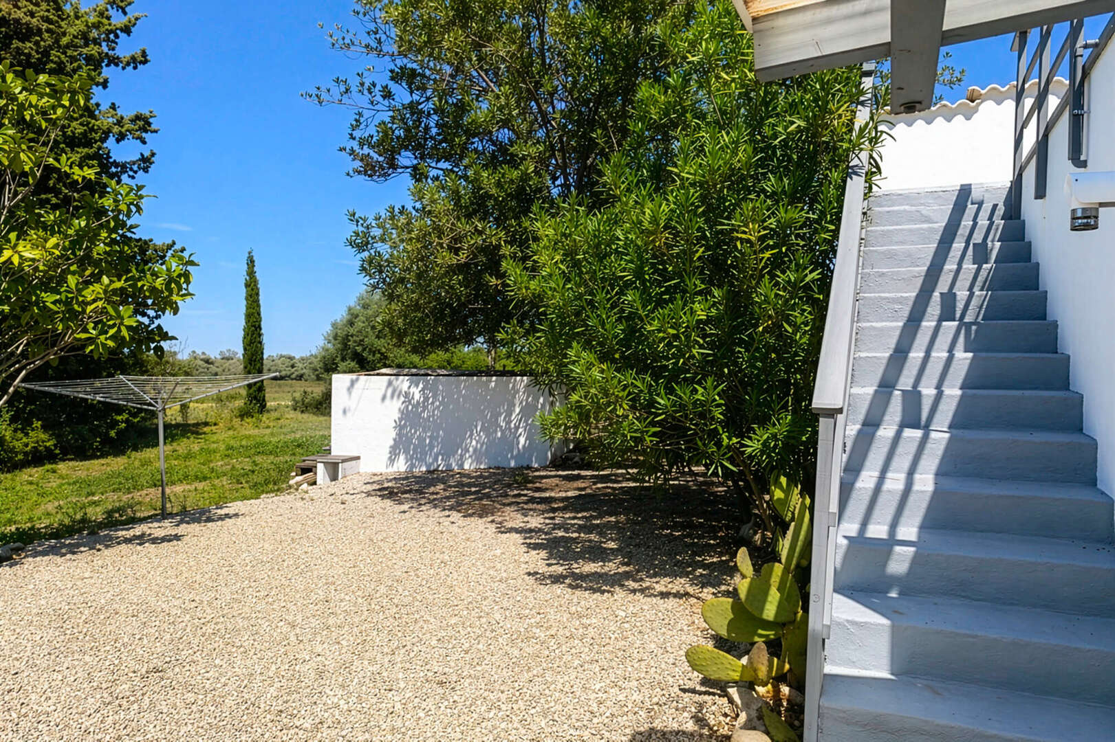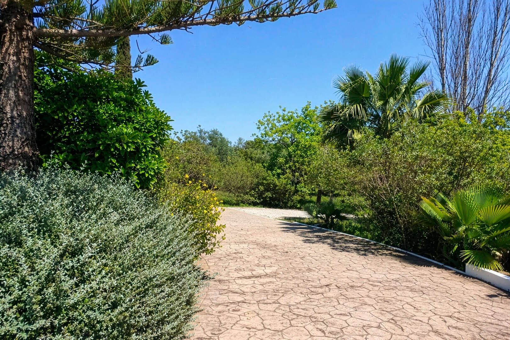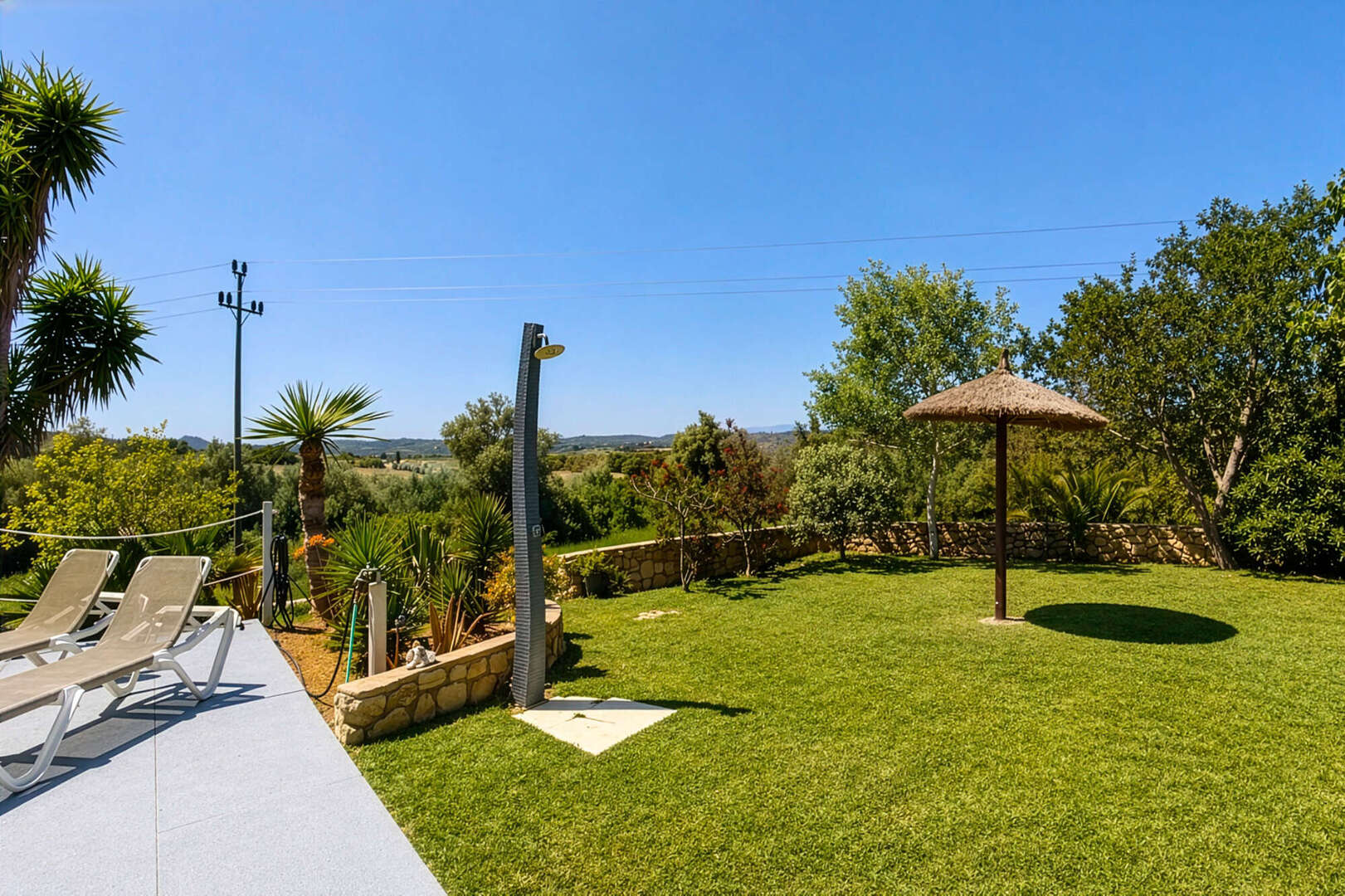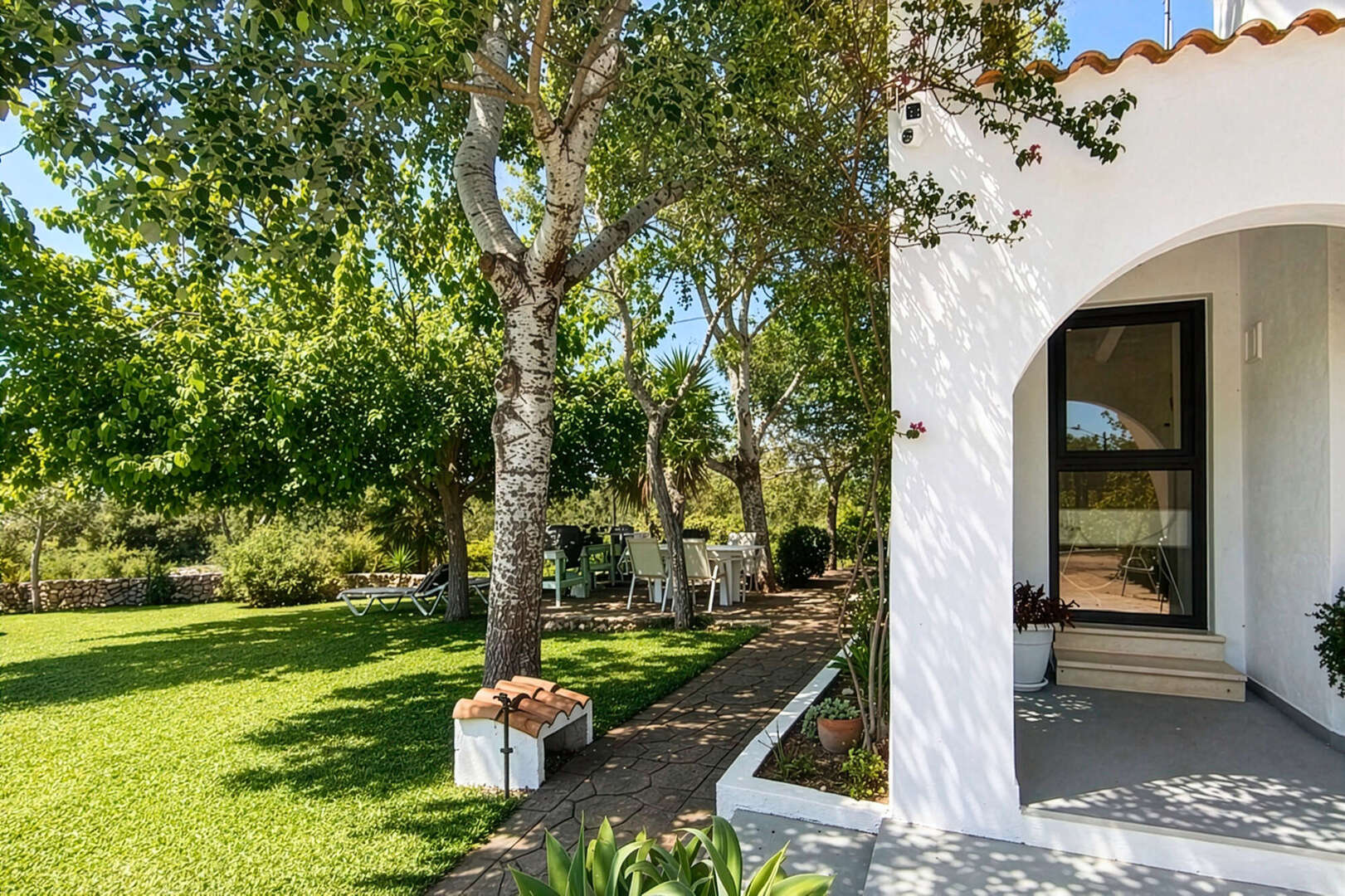 Der liebevoll angelegte Garten ist eine wahre Oase mit exotischen Pflanzen sowie zahlreichen Obstbäumen wie Orangen, Zitronen, Feigen, Mandeln, Grapefruit und Kaki.