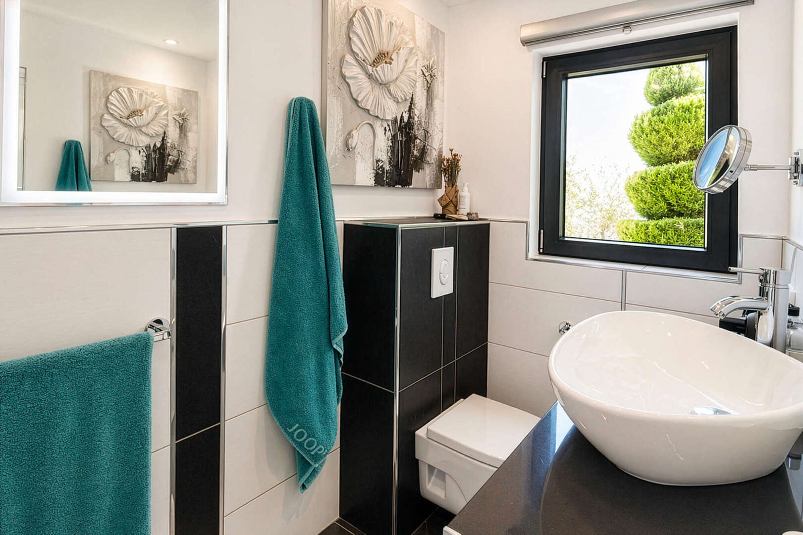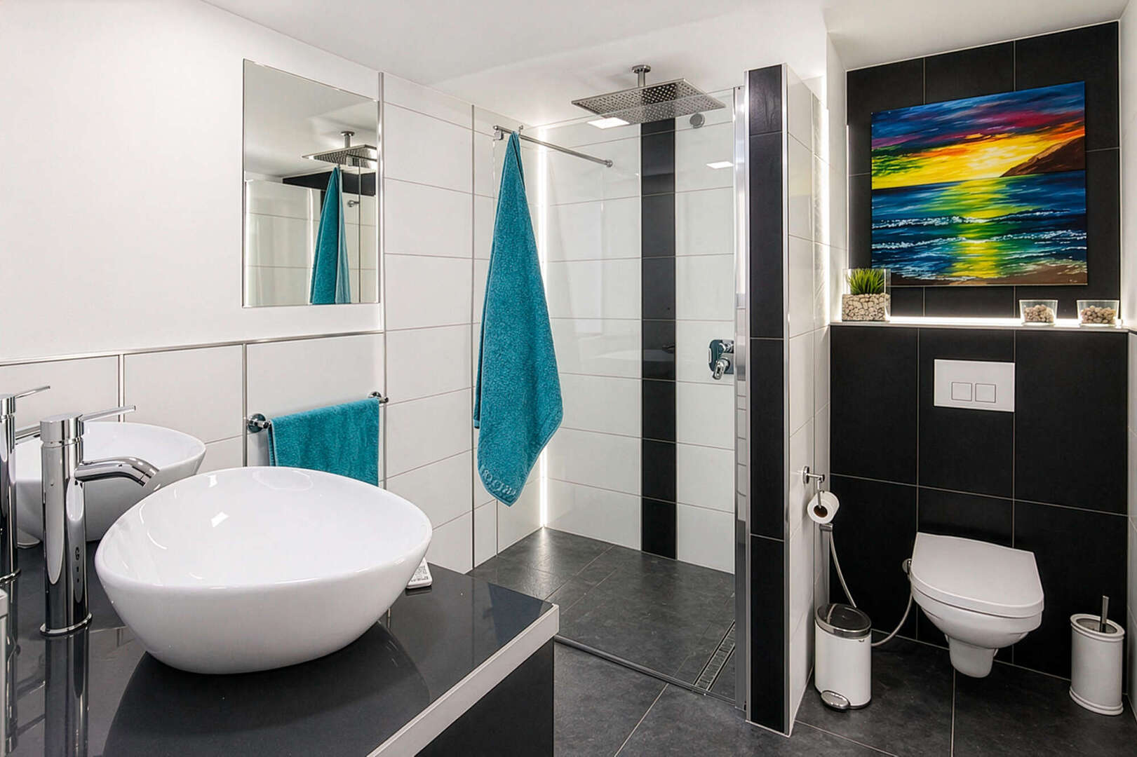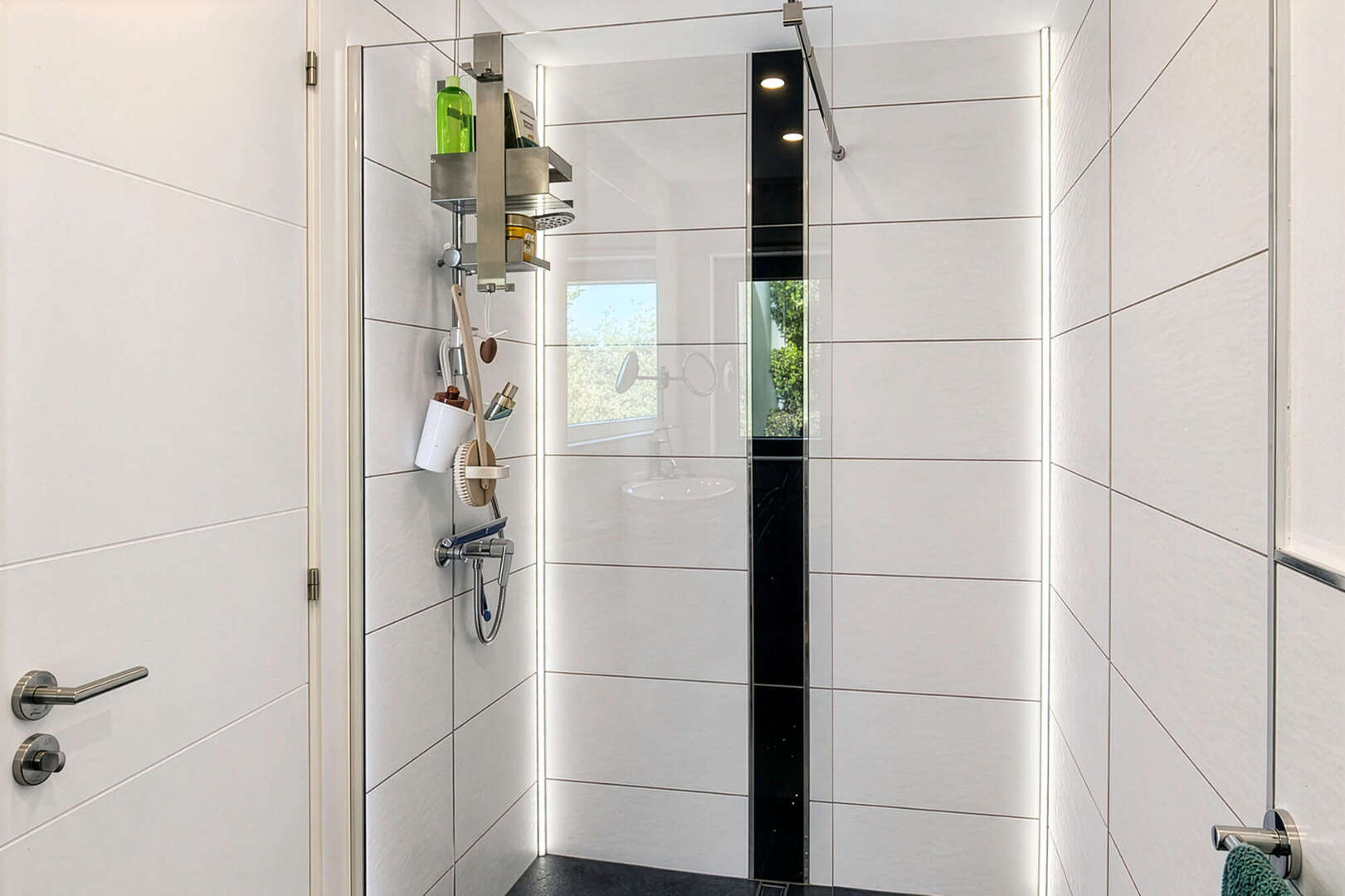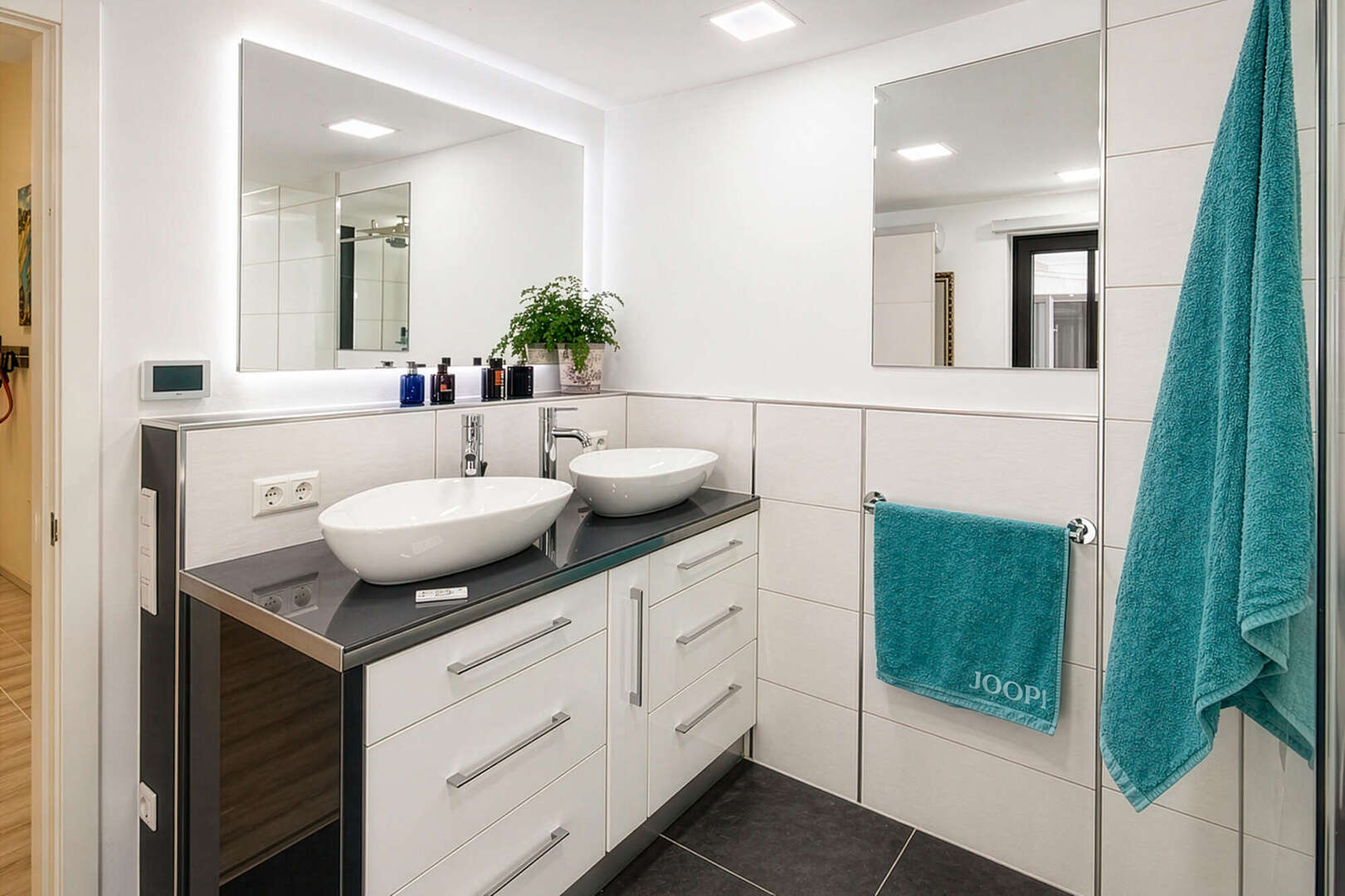 Der Wohnbereich überzeugt mit offenem Speckstein-Kaminofen und separater Arbeitsecke. Die hochwertige Nolte-Küche mit offenem Essbereich bietet Zugang zu zwei Terrassen. Insgesamt stehen drei Schlafzimmer mit Einbauschränken sowie drei stilvolle Badezimmer mit bodengleichen Duschen zur Verfügung, eines davon en Suite.