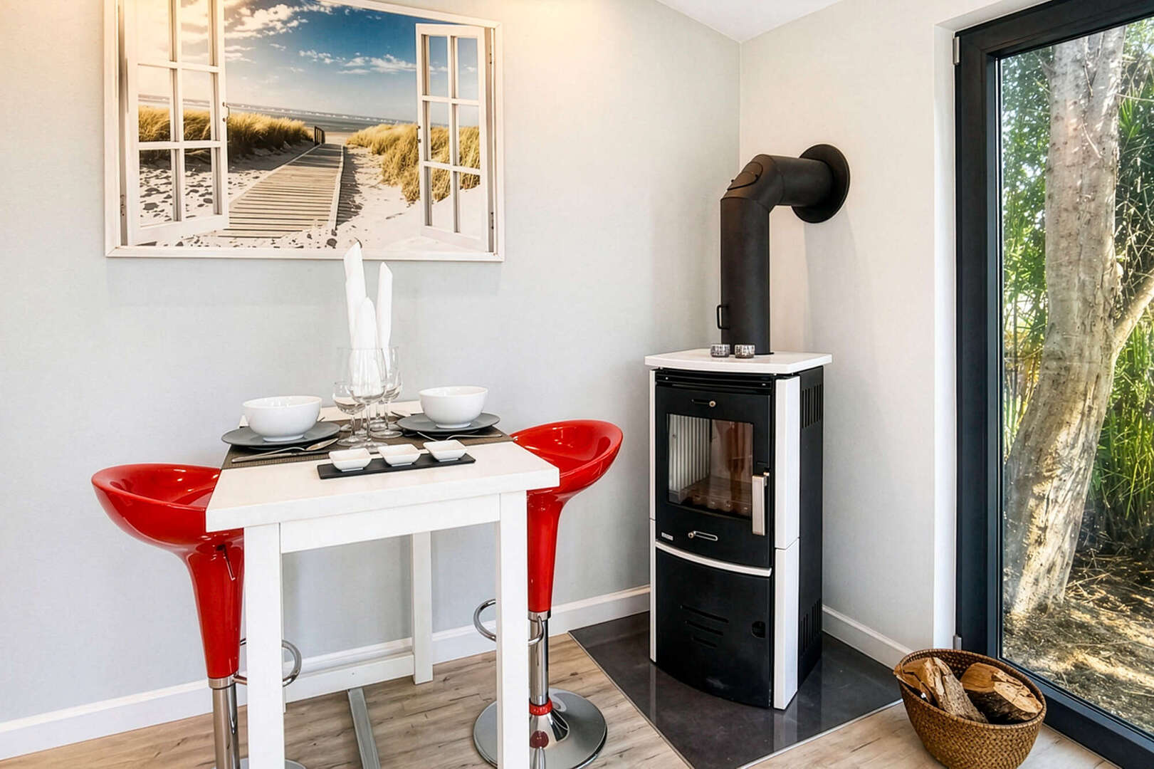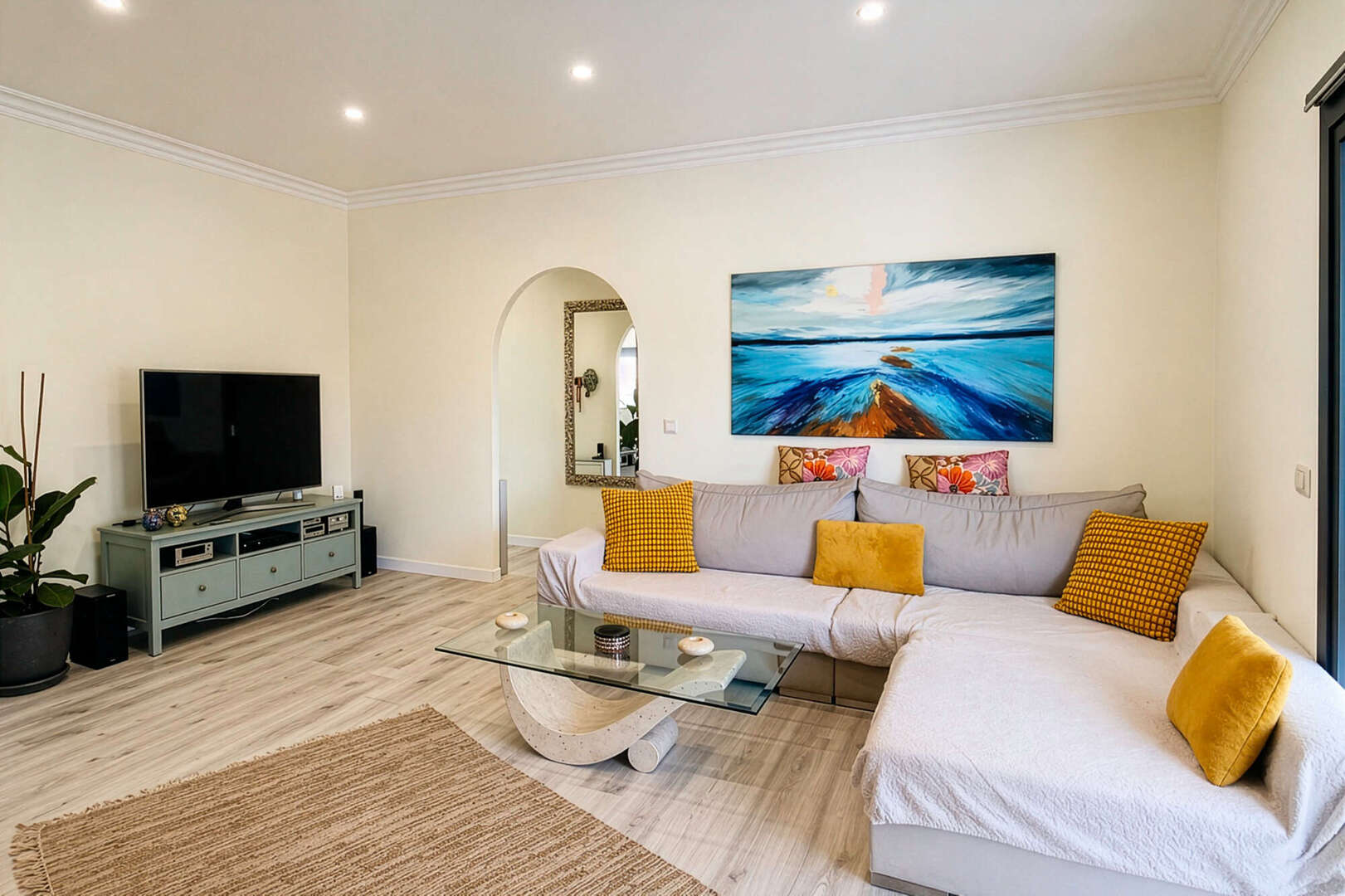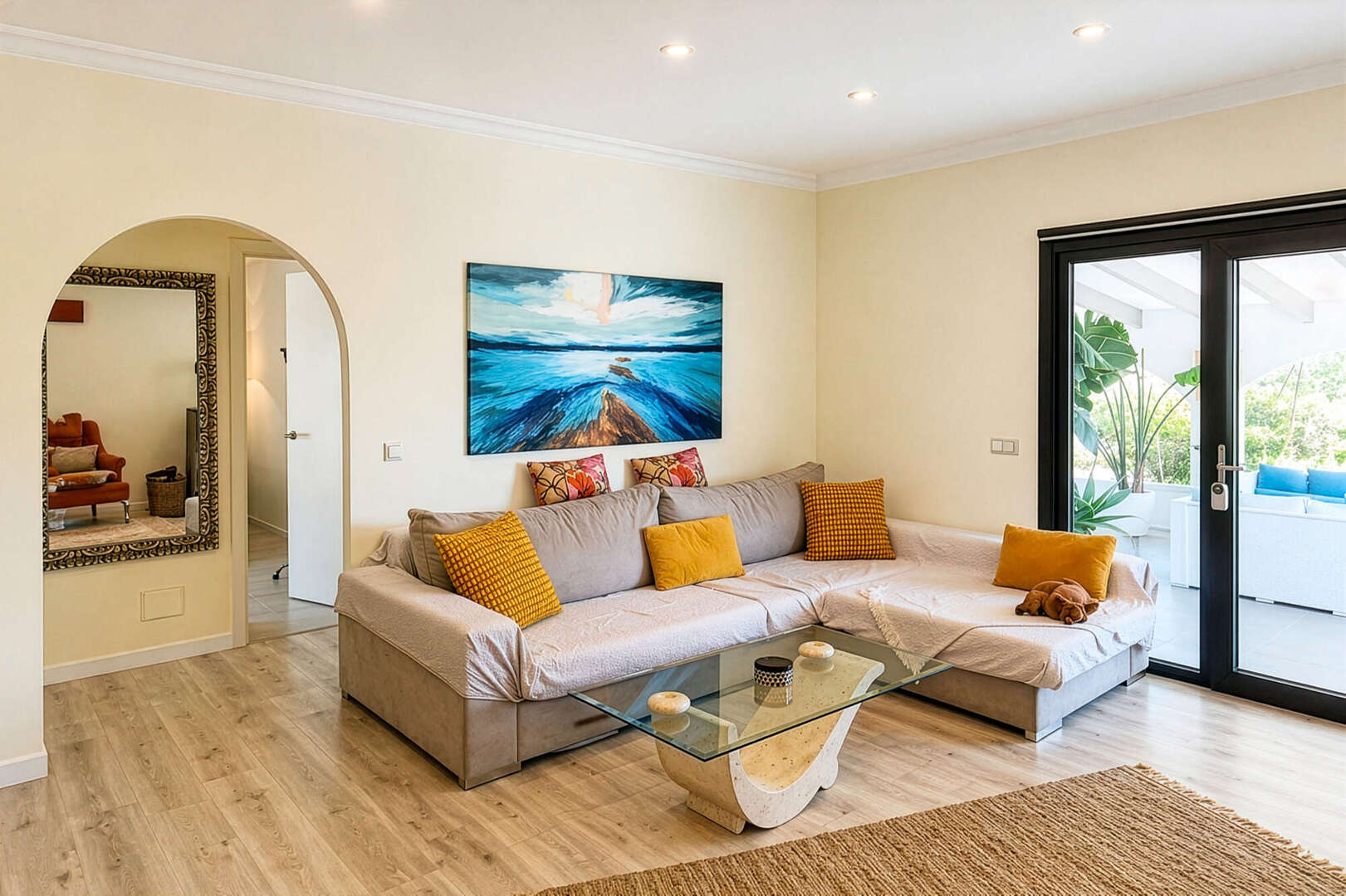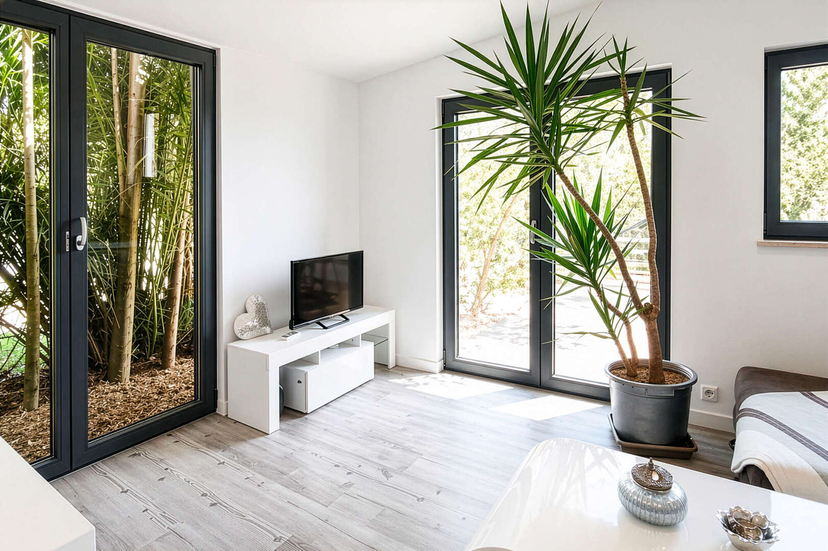 * Heller, moderner Wohnbereich mit bodentiefen Fenstern