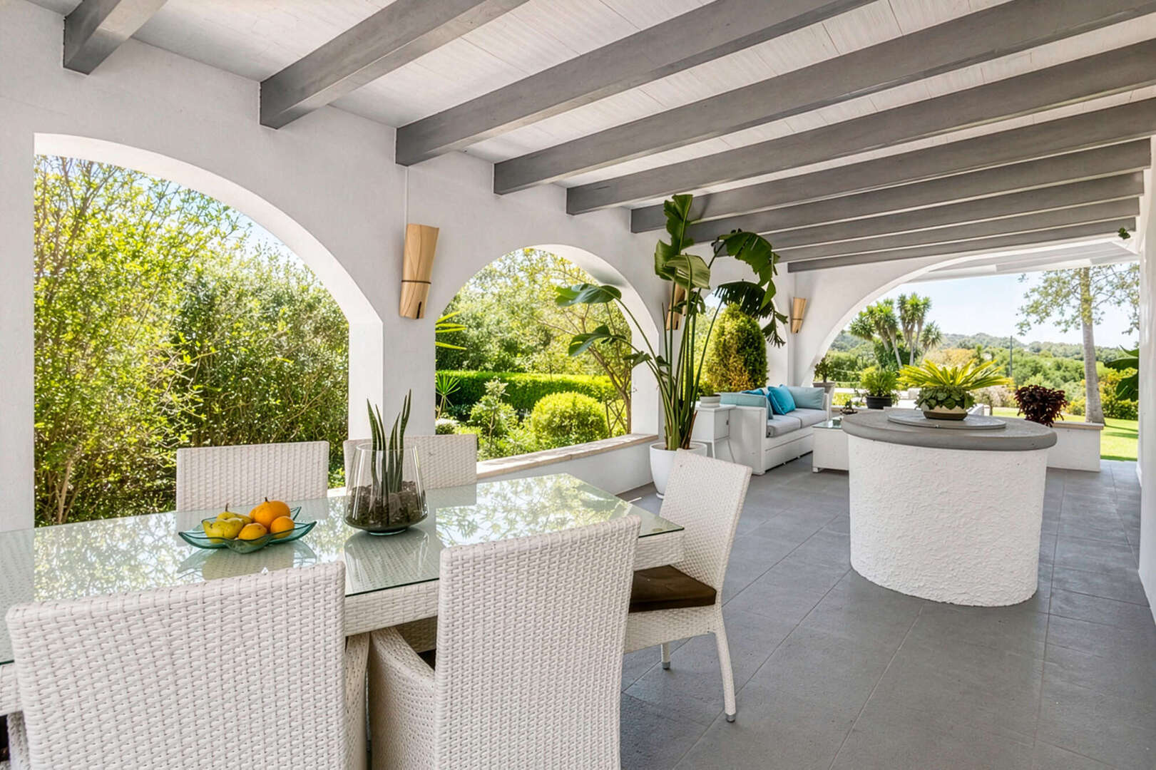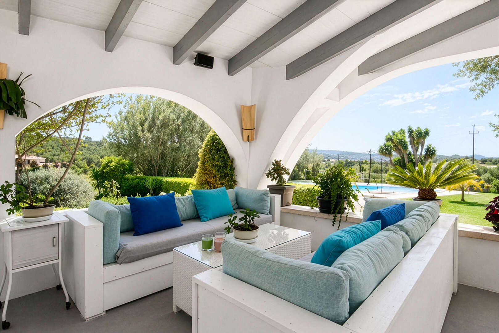 Der Außenbereich lädt zum mediterranen Leben ein. Mittelpunkt ist die große überdachte Veranda (ca. 60 m²) mit traumhaftem Weitblick. Der gepflegte Garten und der großzügige Poolbereich mit 10 x 5 m Pool schaffen eine exklusive Wohlfühlatmosphäre.