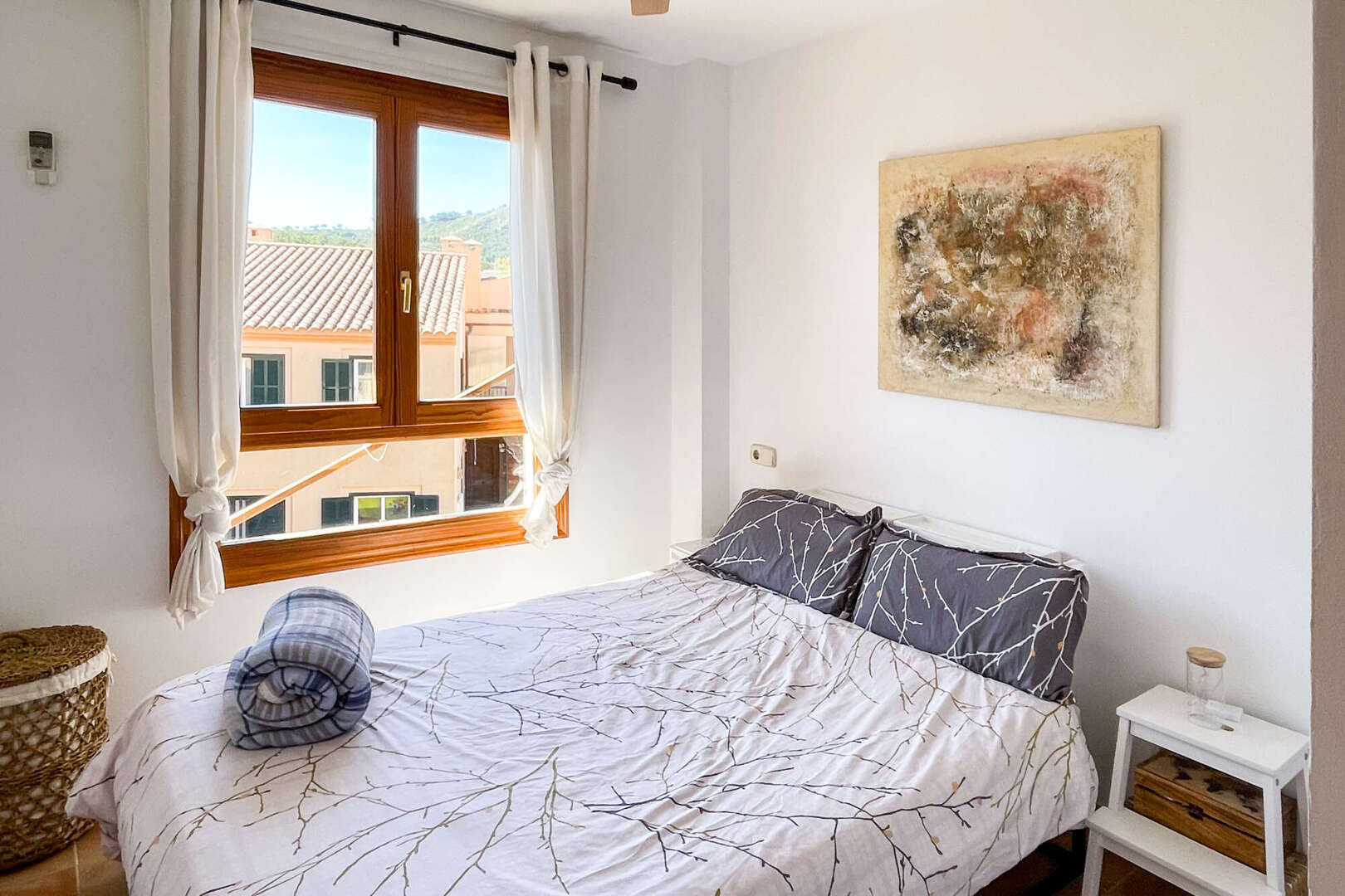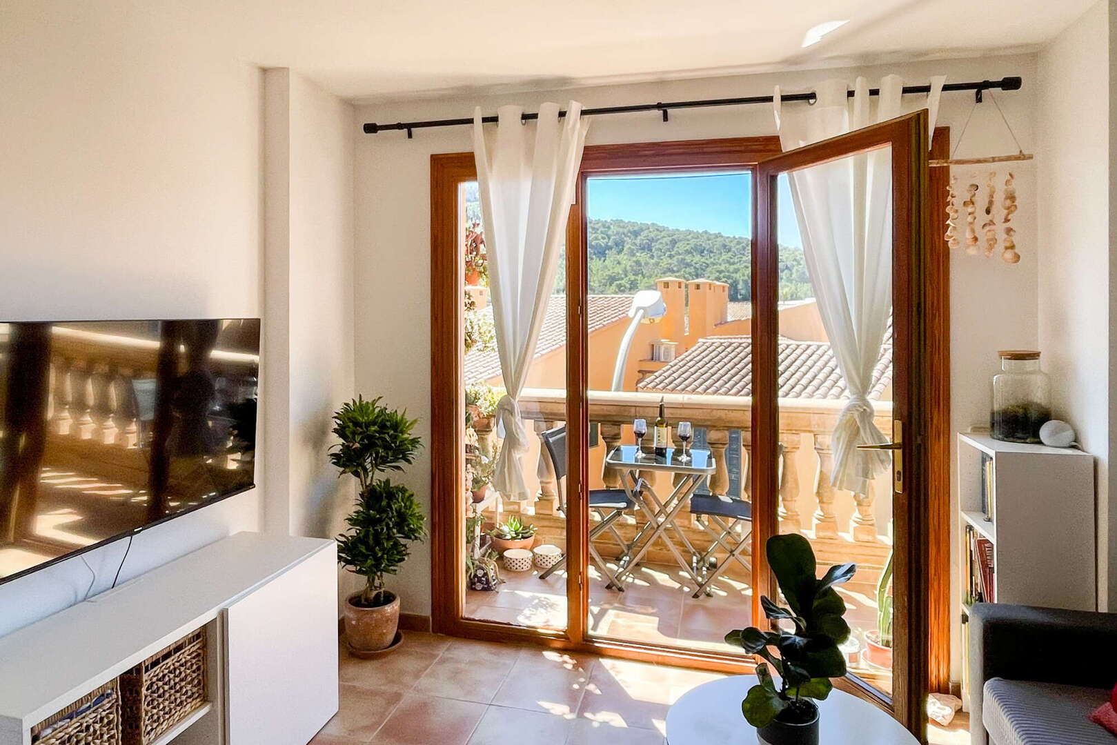 Vom Wohnbereich aus führt der Zugang auf den Balkon, der mit einem schönen Weitblick punktet und sich ideal für entspannte Momente an der frischen Luft eignet. Die Wohnung verfügt über zwei freundlich gestaltete Schlafzimmer, wobei das Hauptschlafzimmer mit einem praktischen Einbauschrank ausgestattet ist. Ein komplett eingerichtetes Badezimmer ergänzt die Aufteilung.