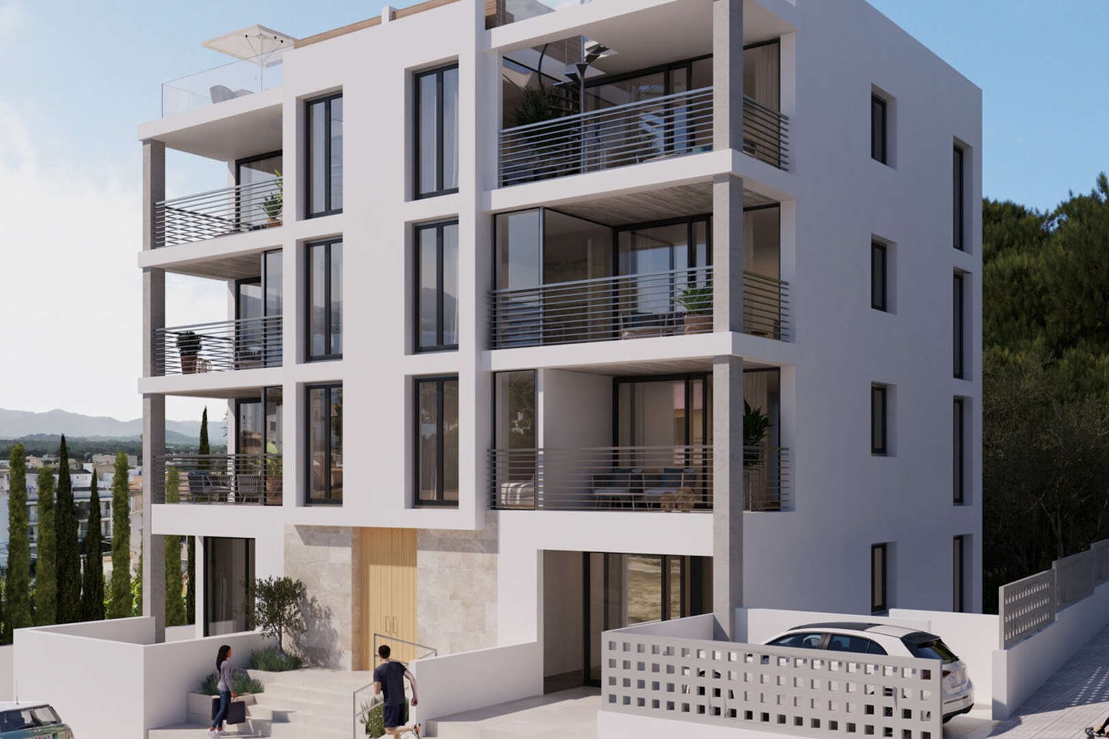 In einem dem Hafen nahgelegenen Wohngebiet in Cala Ratjada entsteht dieses luxuriöse Objekt mit 2 Penthäusern, 3 Wohnungen und drei Ladenlokalen.