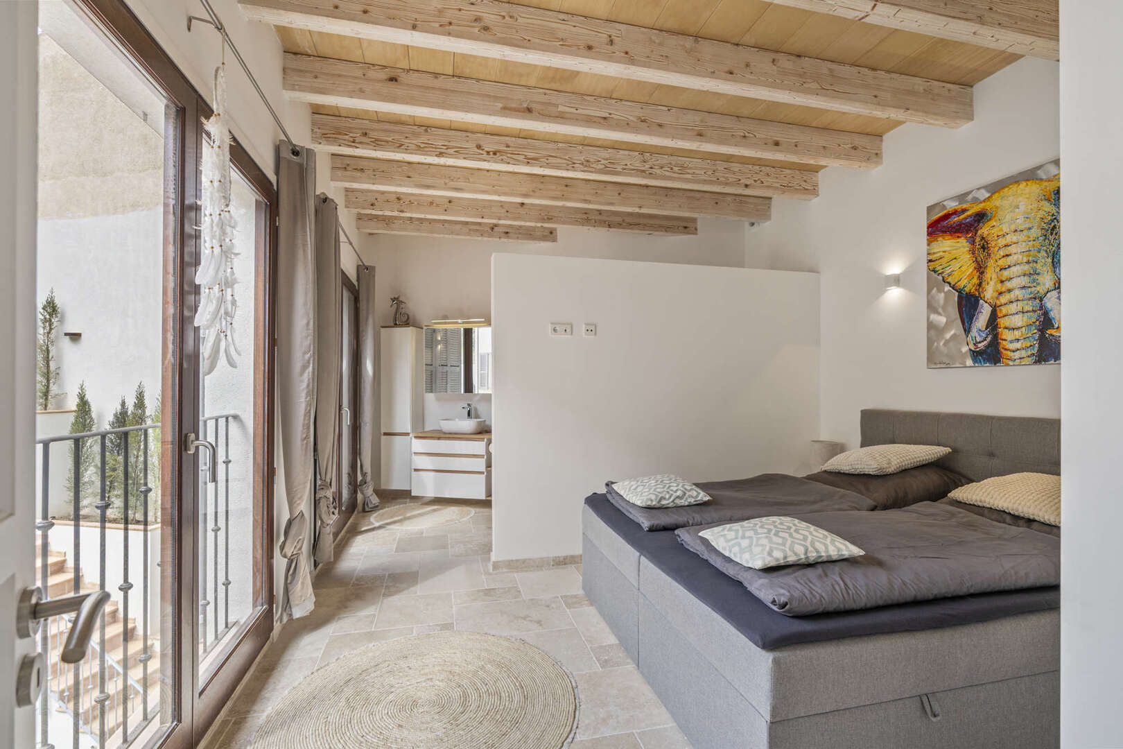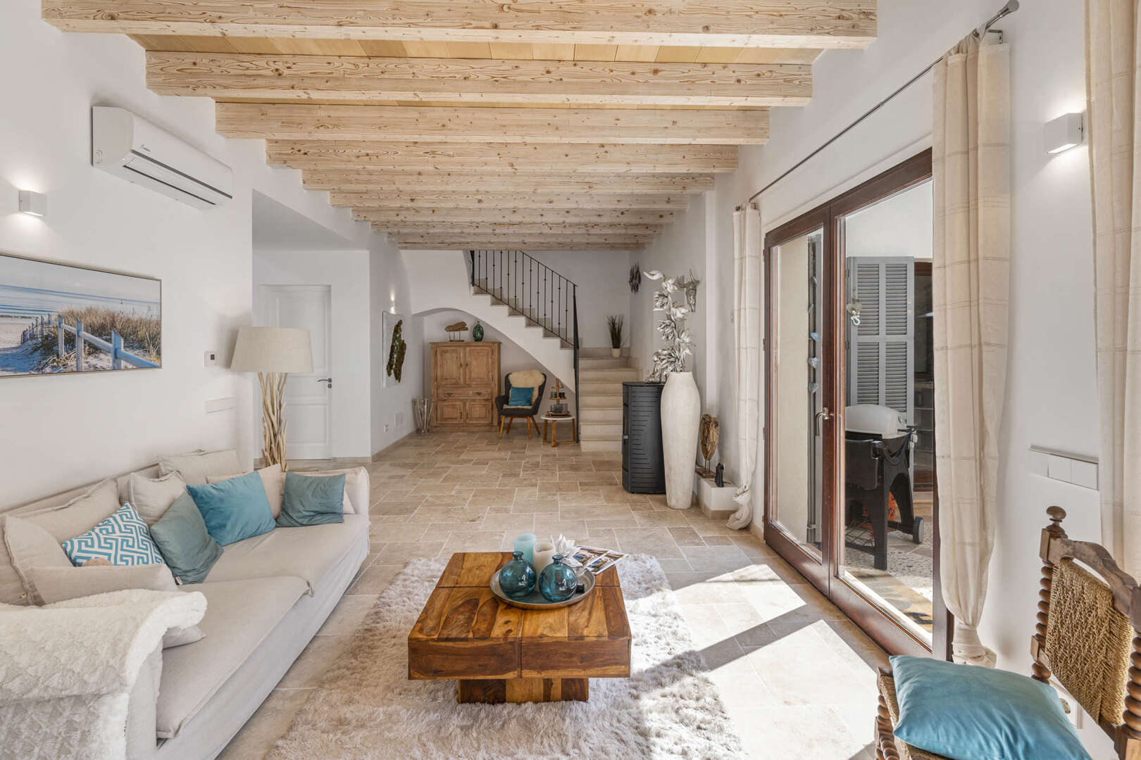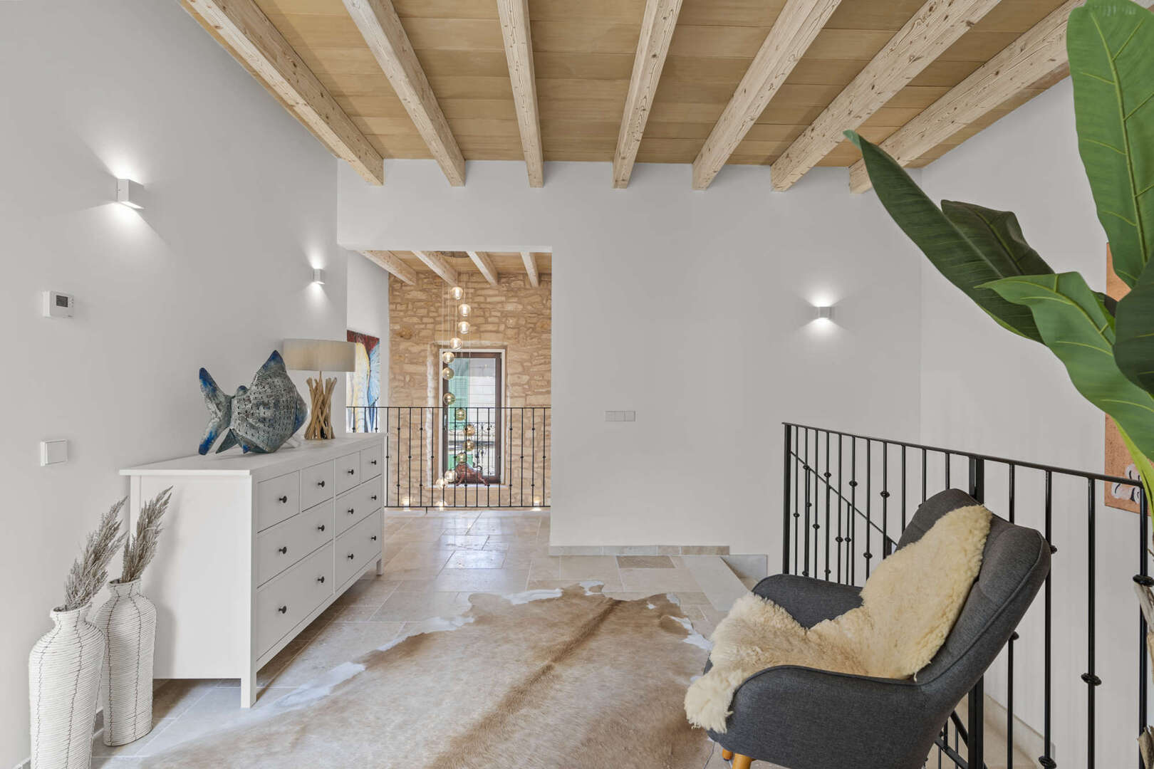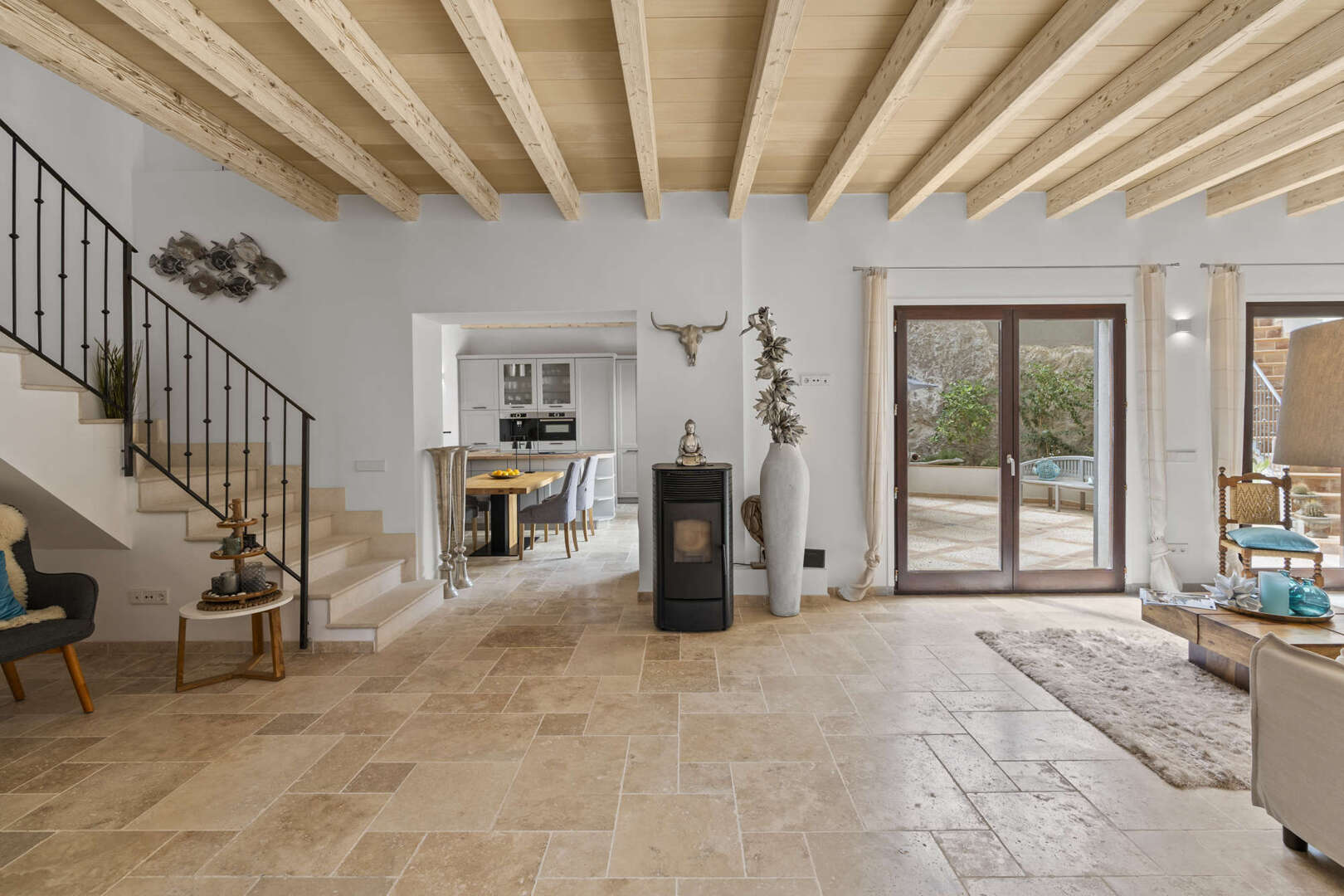 * Mallorquinisches Flair durch Holz-Deckenbalken und Steinverkleidungen der Wände