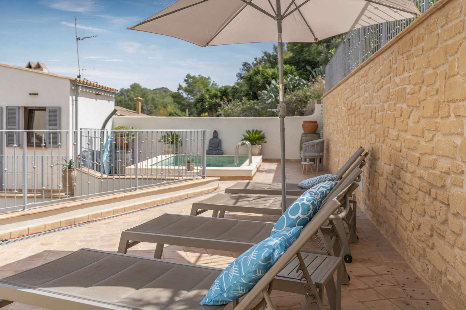 Über eine steingehämmerte Treppe erreicht man die 1.Etage mit 3 Schlafzimmern, 3 Badezimmern (2 davon en Suite) und eine elegante Galerie mit Blick hinunter in den Eingangsbereich. Auf dieser Ebene befindet sich im Außenbereich der erfrischende Pool und lauschige Sitzecken mit der Option eine Doppelgarage und eine weitere Terrasse zu gestalten.