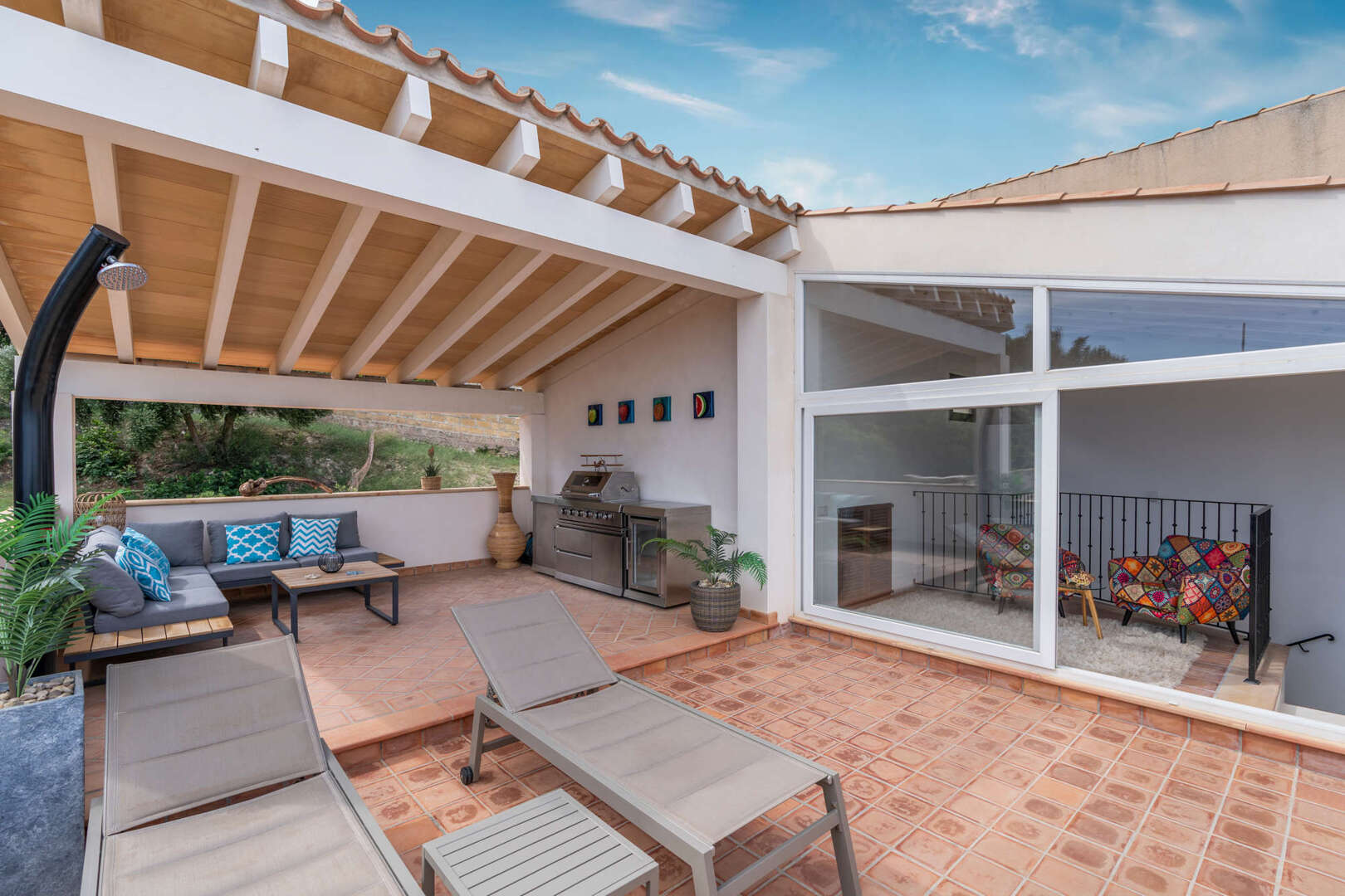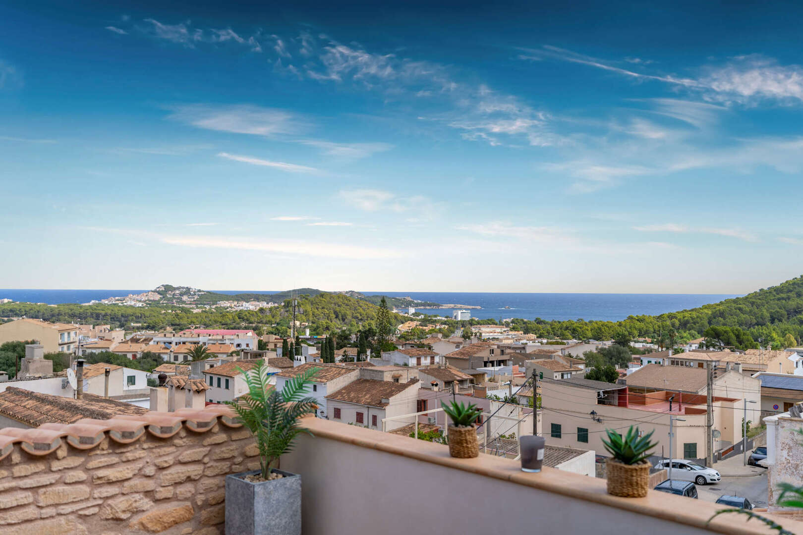 * großzügige Dachterrasse mit Panoramablick über Cala Ratjada bis zum Meer und zur Burg von Capdepera und hochwertige Außenküche