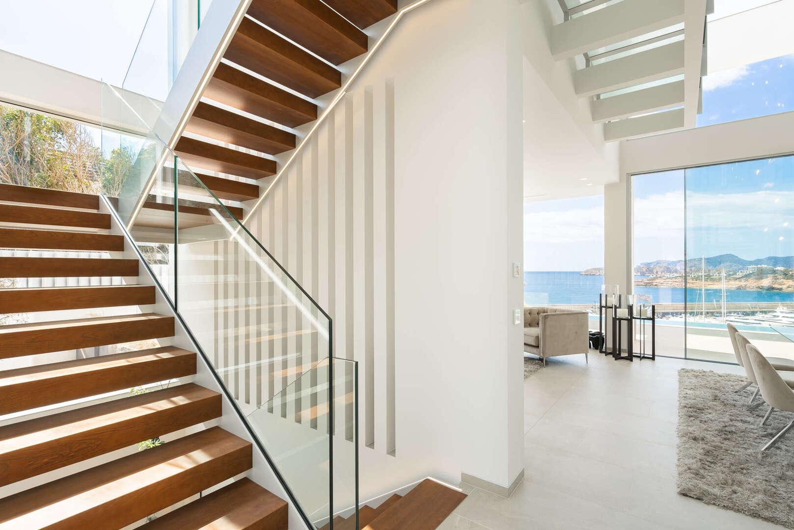 Diese exklusive Residenz bietet hochwertige Materialien, atemberaubende Ausblicke und eine durchdachte Raumaufteilung. Großzügige Fensterfronten rahmen den Hafen von Port Adriano ein, während der Architekt besondere Highlights gesetzt hat. Ein Highlight ist die Designer-Küche, eine Pool-Terrasse mit einem über 100 m² großen Pool, zwei Schlafzimmer im Obergeschoss, zwei im Untergeschoss - jeweils mit eigenen Bädern und Suiten -, ein Fitnessraum, ein Kinosaal und spektakuläre Meerblicke, die auch von der Dachterrasse aus genossen werden können.
