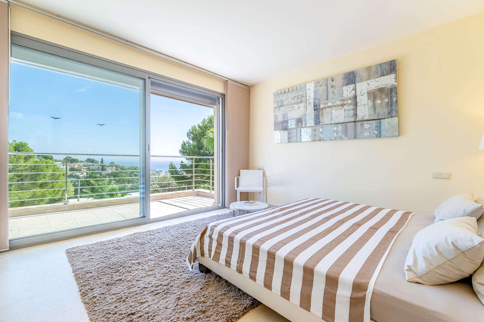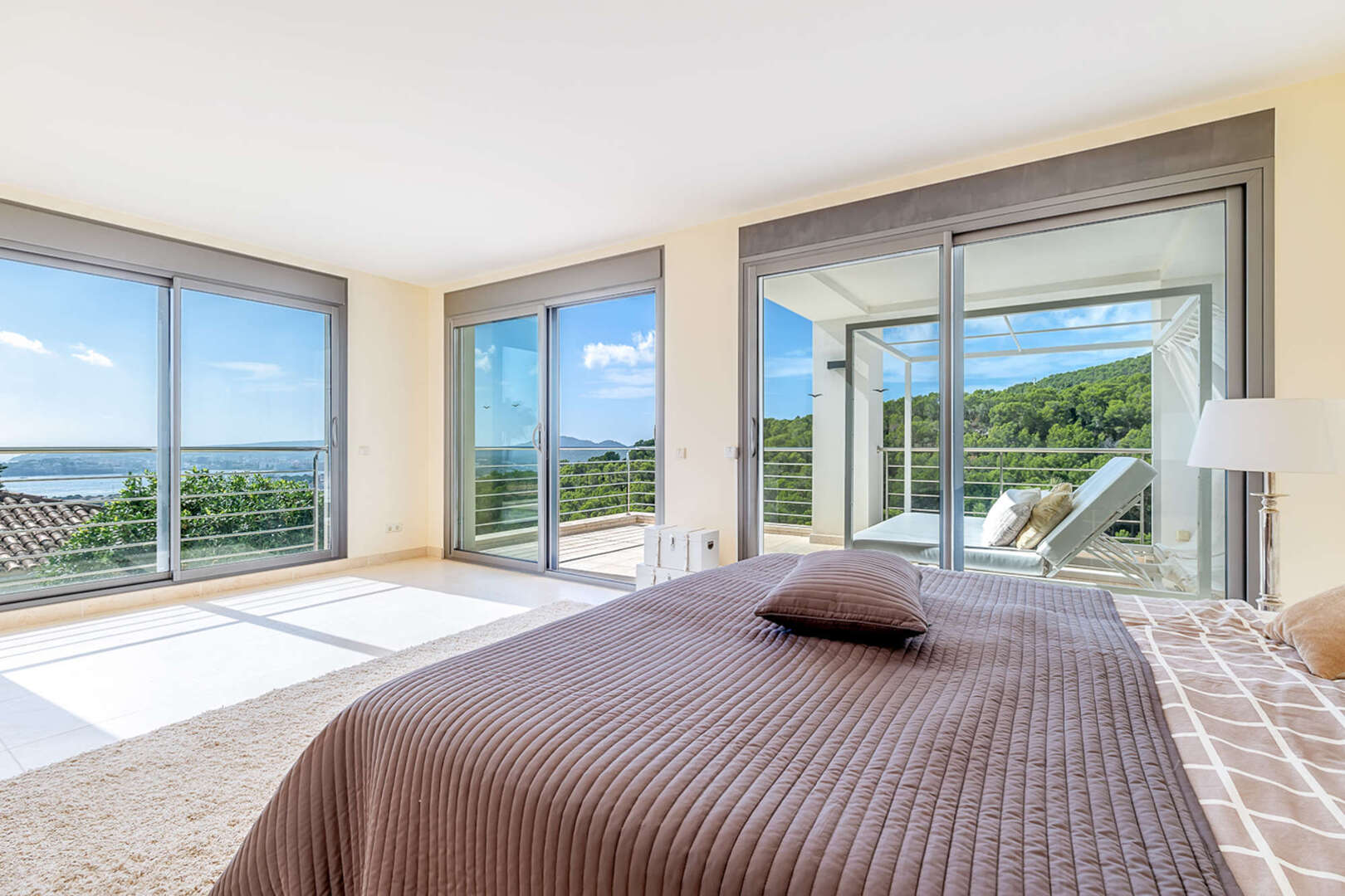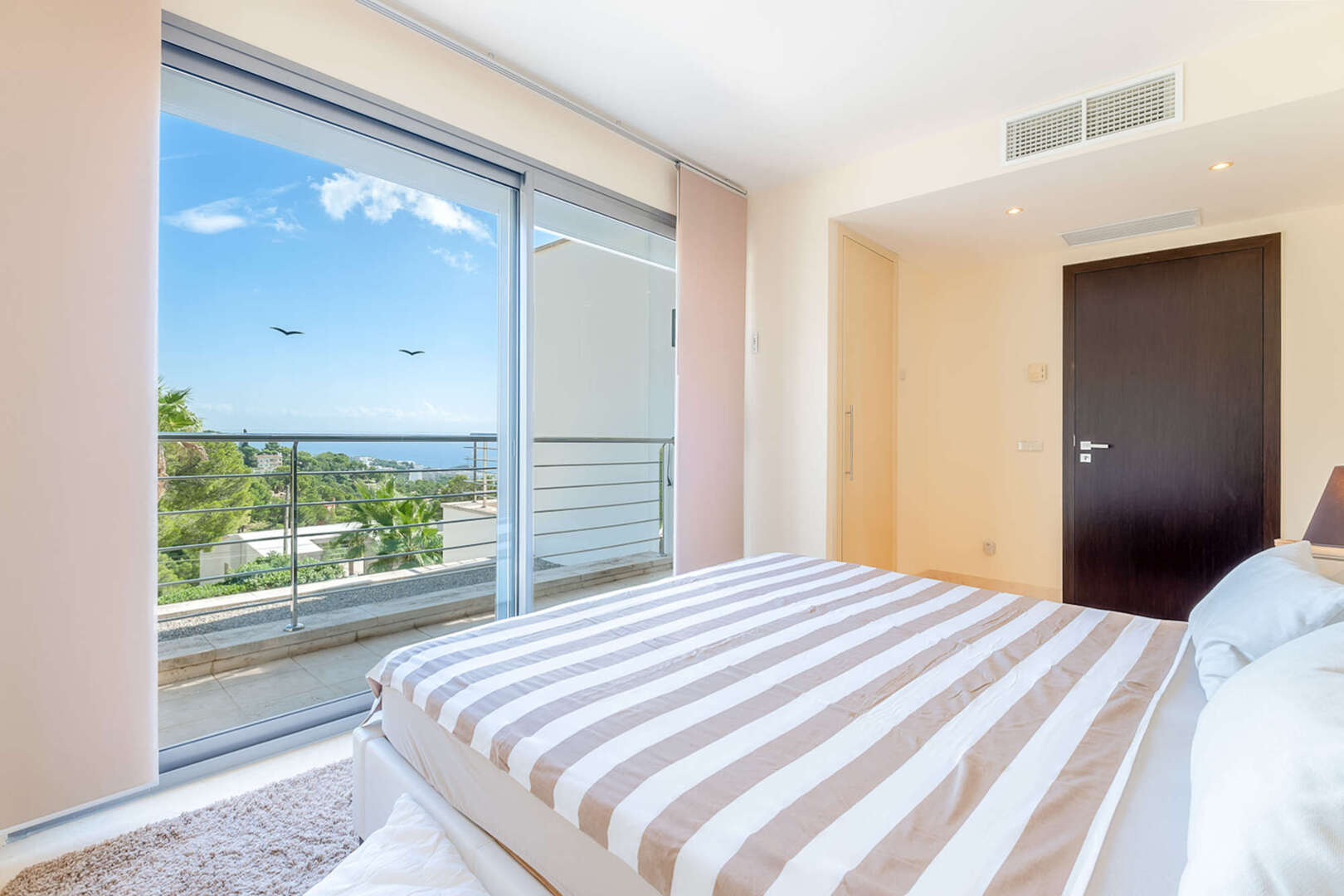 Das Hauptschlafzimmer verfügt über ein eigenes, luxuriöses Badezimmer und bietet einen spektakulären Blick auf das Meer von der privaten Terrasse aus.