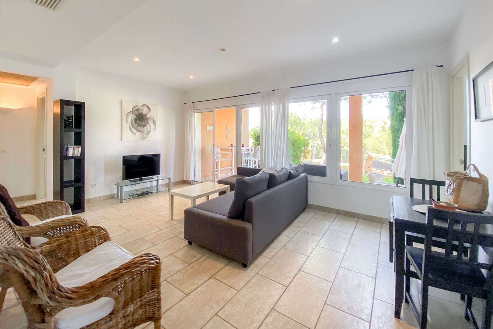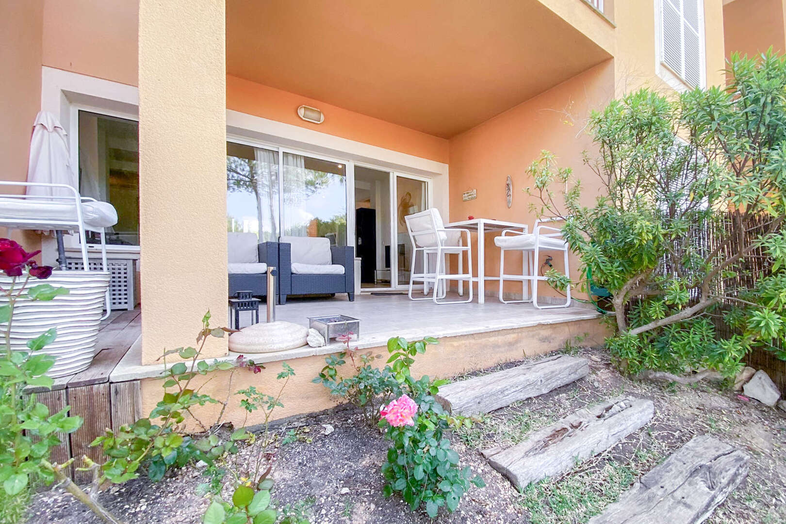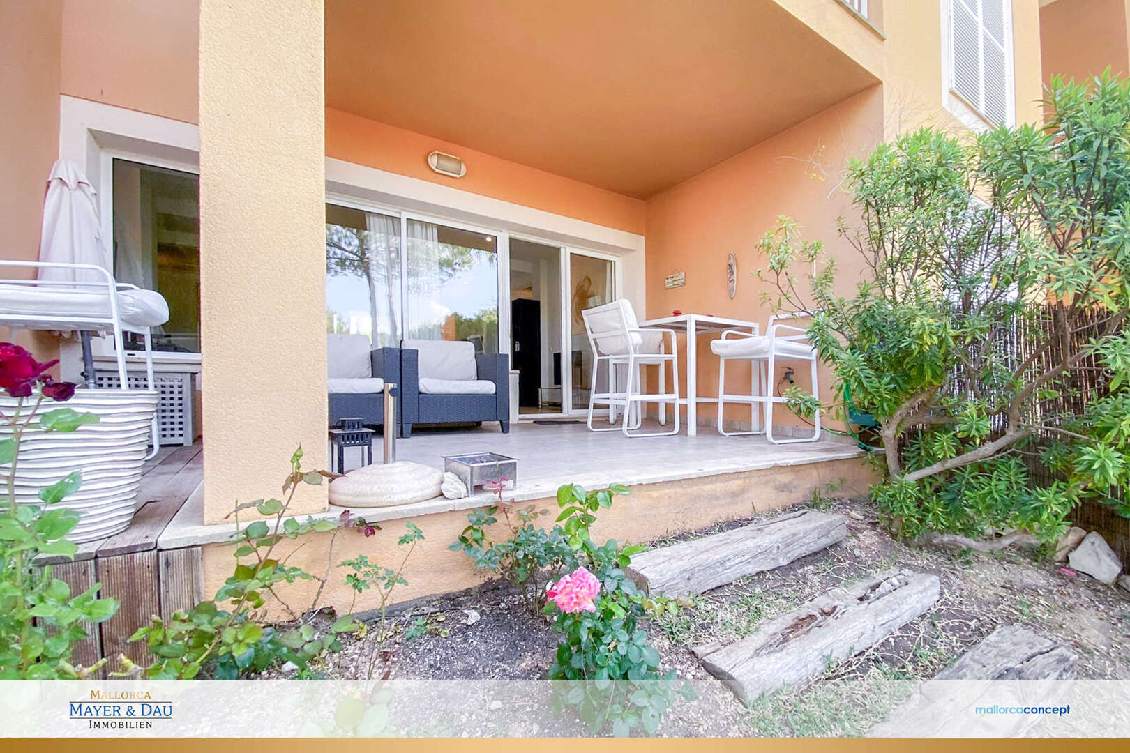 Auf ca. 90qm Wohnfläche bietet sie ein komfortables Zuhause und ist aufgeteilt in einen Wohn - Essbereich mit offener Küche, zwei Schlafzimmern, zwei Bäder ( eines davon en Suite ), einer großzügigen Terrasse und einem eigenen Gartenanteil.