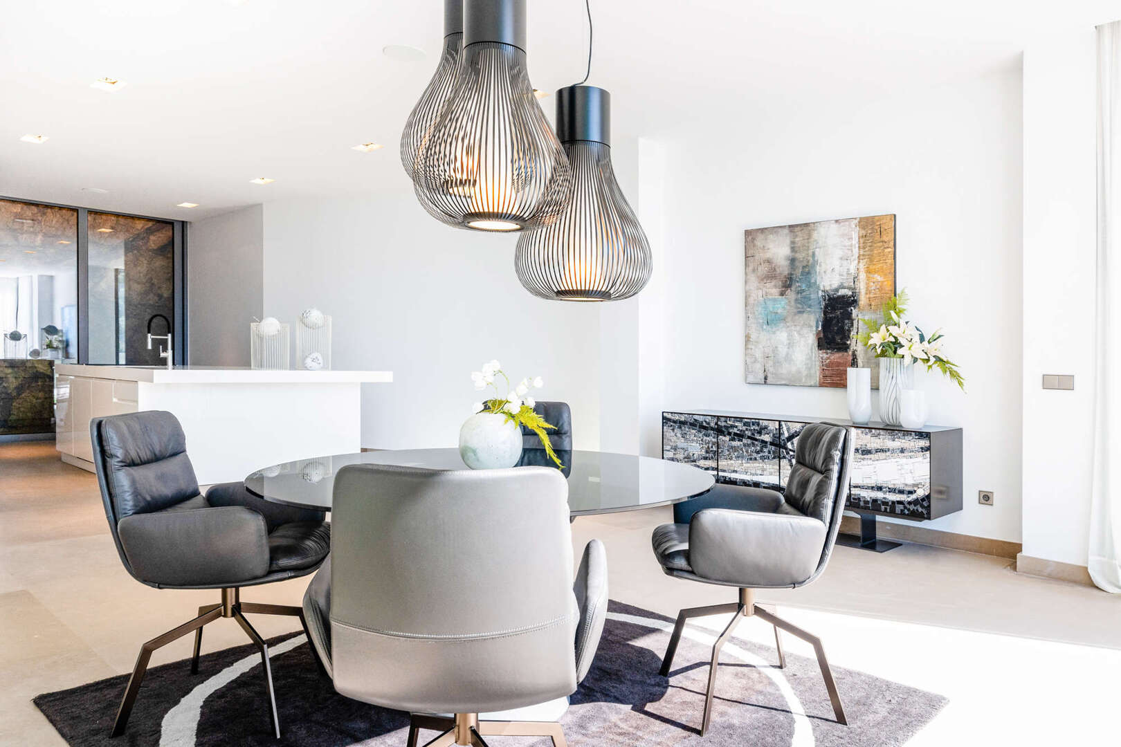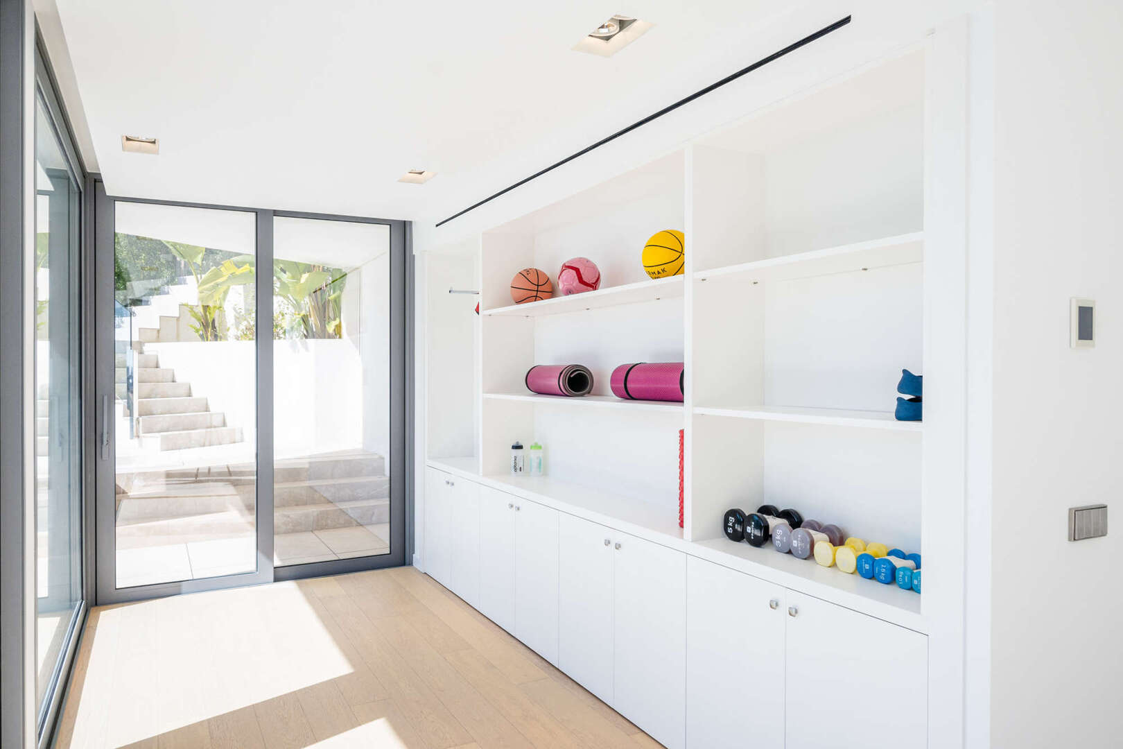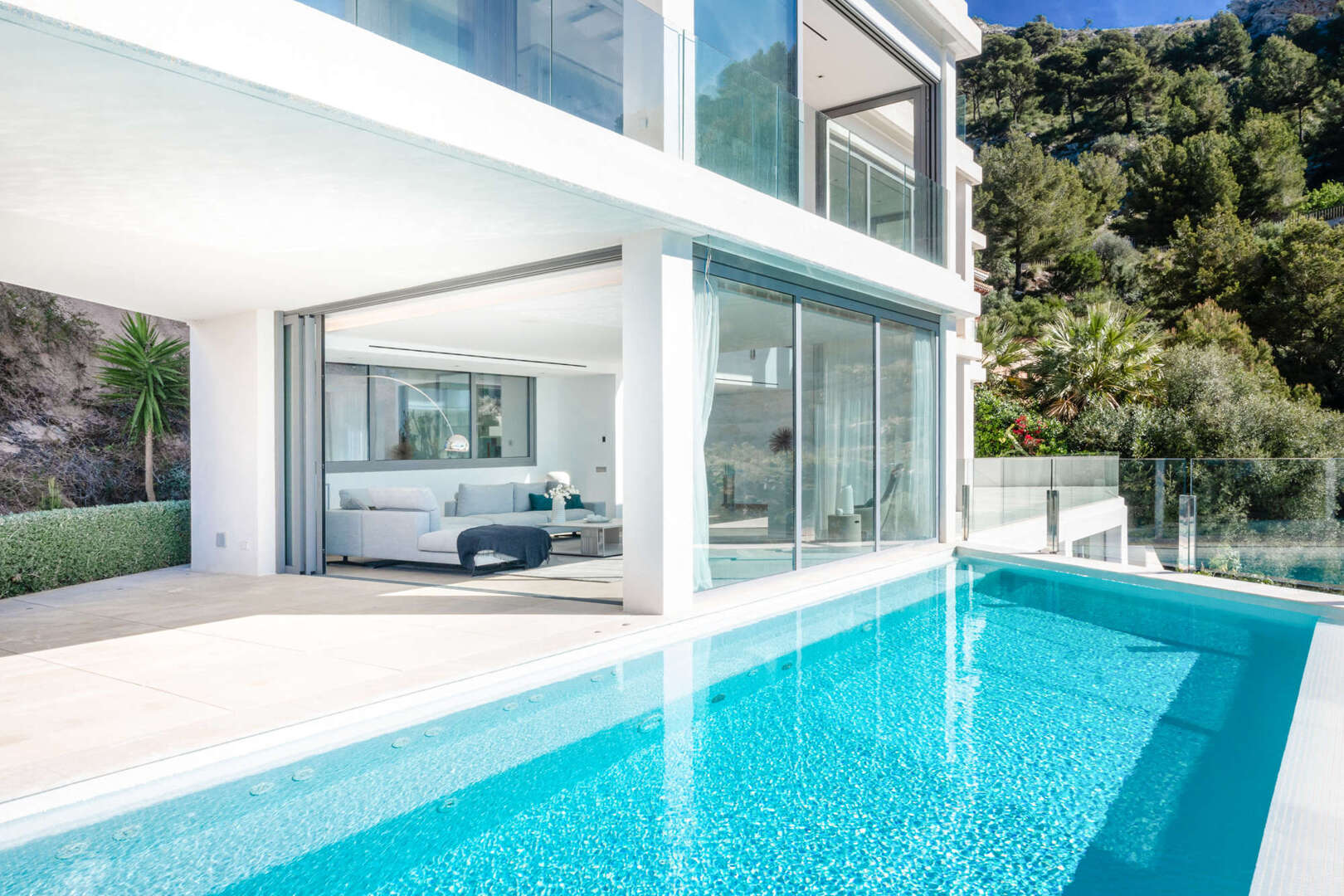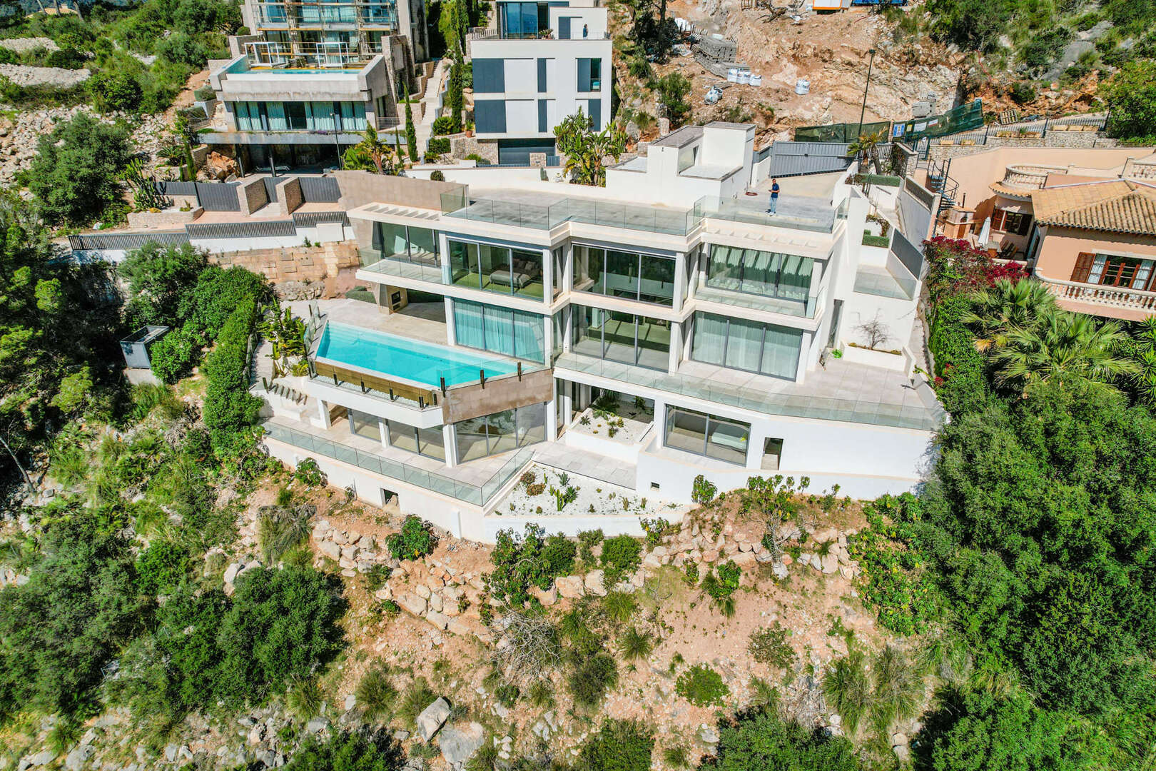 Die bebaute Fläche der Villa von ca. 803 m2 ist auf 3 Ebenen aufgeteilt: Insgesamt 4 Schlafzimmer, 5 Bäder, 1 separates Gäste-WC, ein offener und grosser Wohnbereich, ein separates Esszimmer und eine voll ausgestattete Designer-Küche. Auf der unteren Etage gibt es ein Kino und einen Fitnessraum. Alle Zimmer verfügen über eine Terrasse. Der grosse Salzwasser Infinity-Pool mit ca. 50 m2 sorgt für eine willkommene Erfrischung an heissen Tagen. Hier kann man auch sportlich seine Bahnen ziehen.