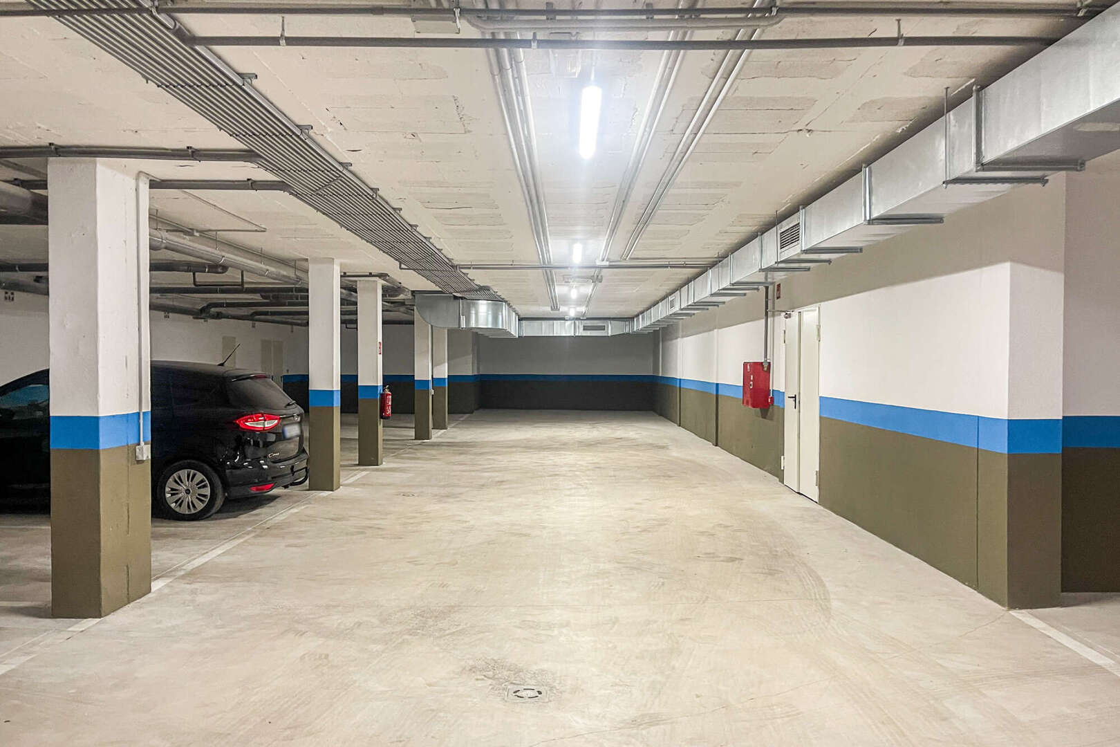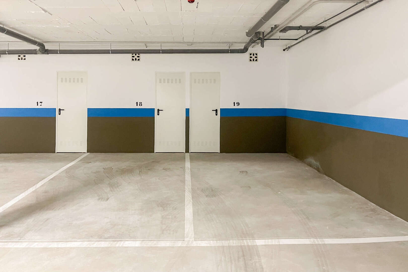 In der Anlage gibt es insgesamt 18 Eigentumswohnungen, denen insgesamt 30 Tiefgaragenstellplätze zugeordnet sind, die durch einen Aufzug erreicht werden können. Ein Kellerraum sowie ein Stellplatz gehören bereits zu dieser Penthouse-Wohnung, ein weiterer Stellplatz kann für einen Aufpreis von 18.000€ erworben werden. Ein Garten und Gemeinschaftspool runden das Angebot ab.